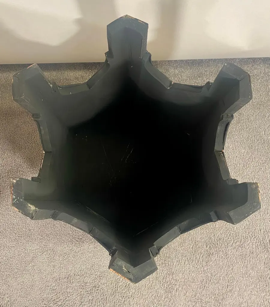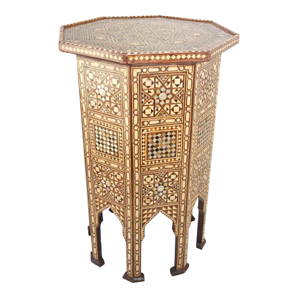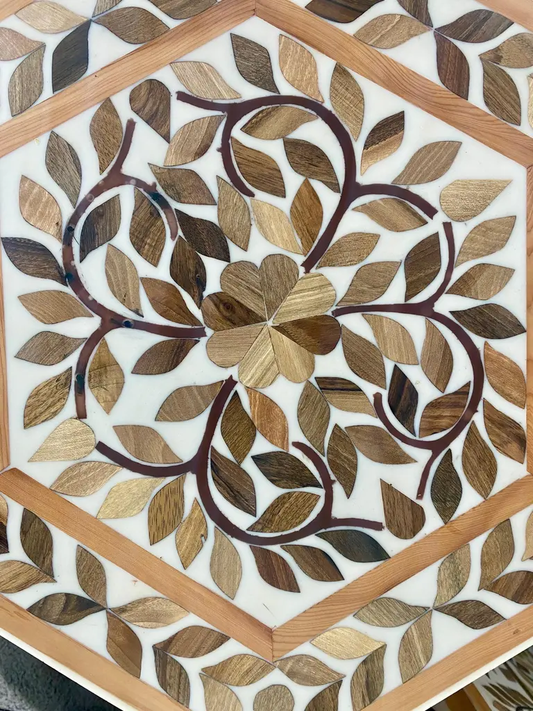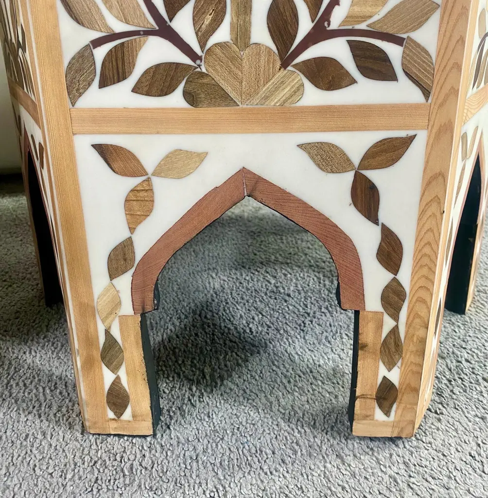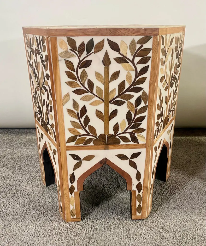 An exquisite pair of boho chic / Bohemian Moroccan style side or end table featuring an hexagonal shape. The handmade tables are finely decorated in leaves Pattern and beautiful arches, a staple of the Moorish timeless architecture and design. handmade of resin in an off white color with wooden walnut leaves inlay, the tables are gorgeous will add a touch of exotic to any room or space.Note : the tables are 100% handmade and the color of the natural walnut can vary in shades and tones. Dimensions: 19.25” H x 15.25” W x 17.75” D.
