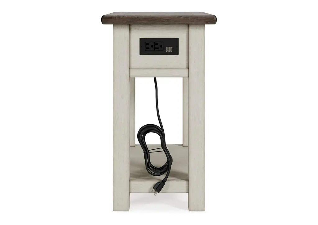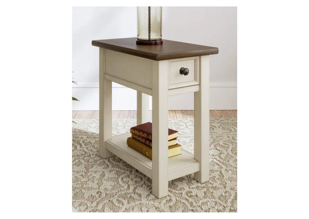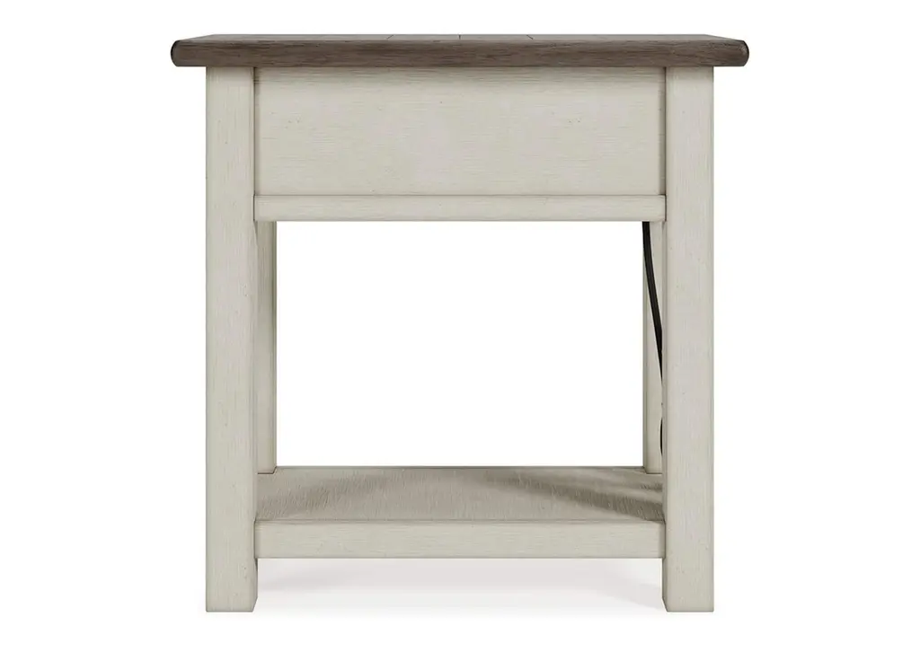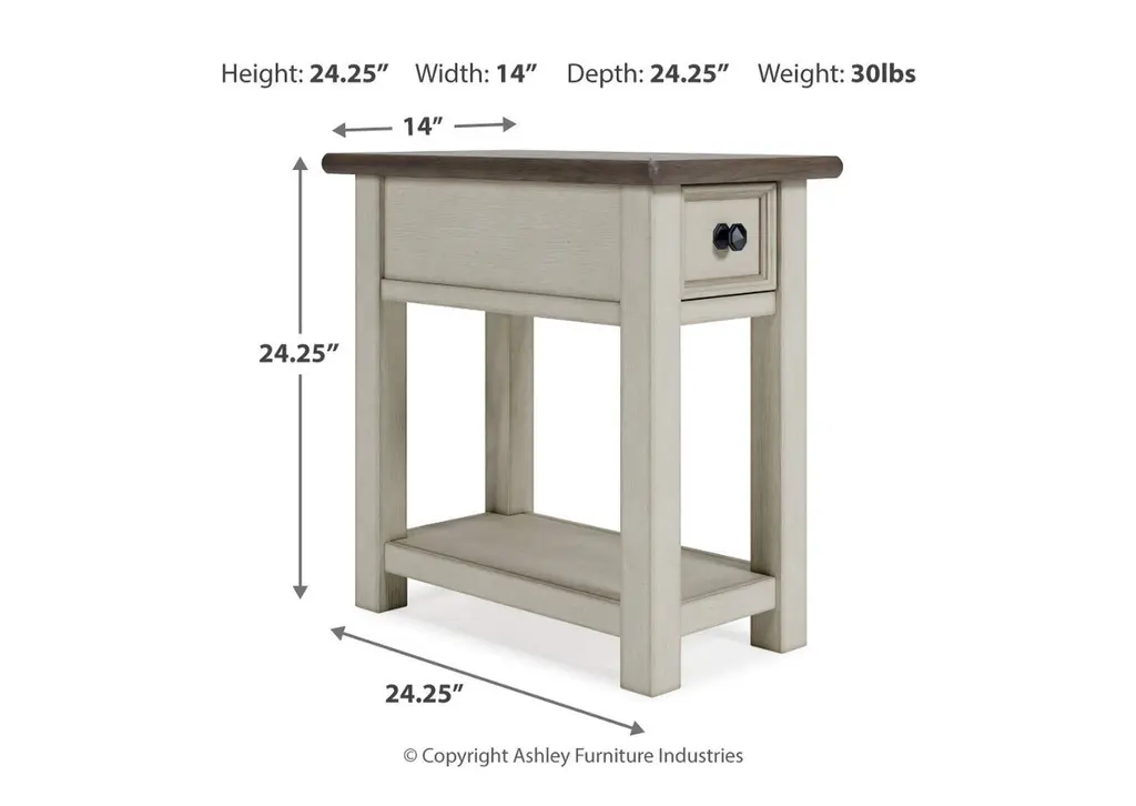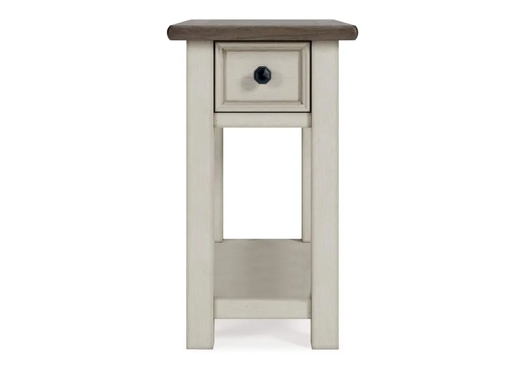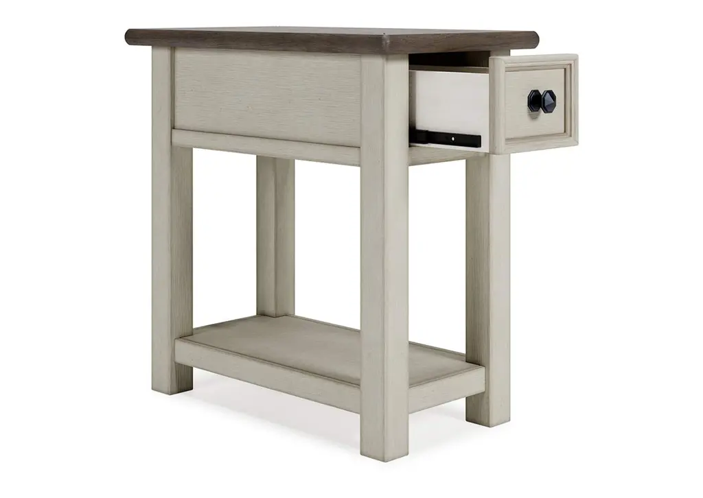 Whether your style is farmhouse fresh, shabby chic or country cottage, you’ll find the Bolanburg chairside end table dressed to impress. Its two-tone finish pairs weathered oak with antique white for that much more quaint character. Charming elements include a plank-and-frame style top, black faceted hardware and a smooth-gliding drawer for remote controls and more. Integrated power supply with dual USB charging ports is ideal for keeping your personal devices at the ready. Weight 37.000 lbs. (16.65kgs.)