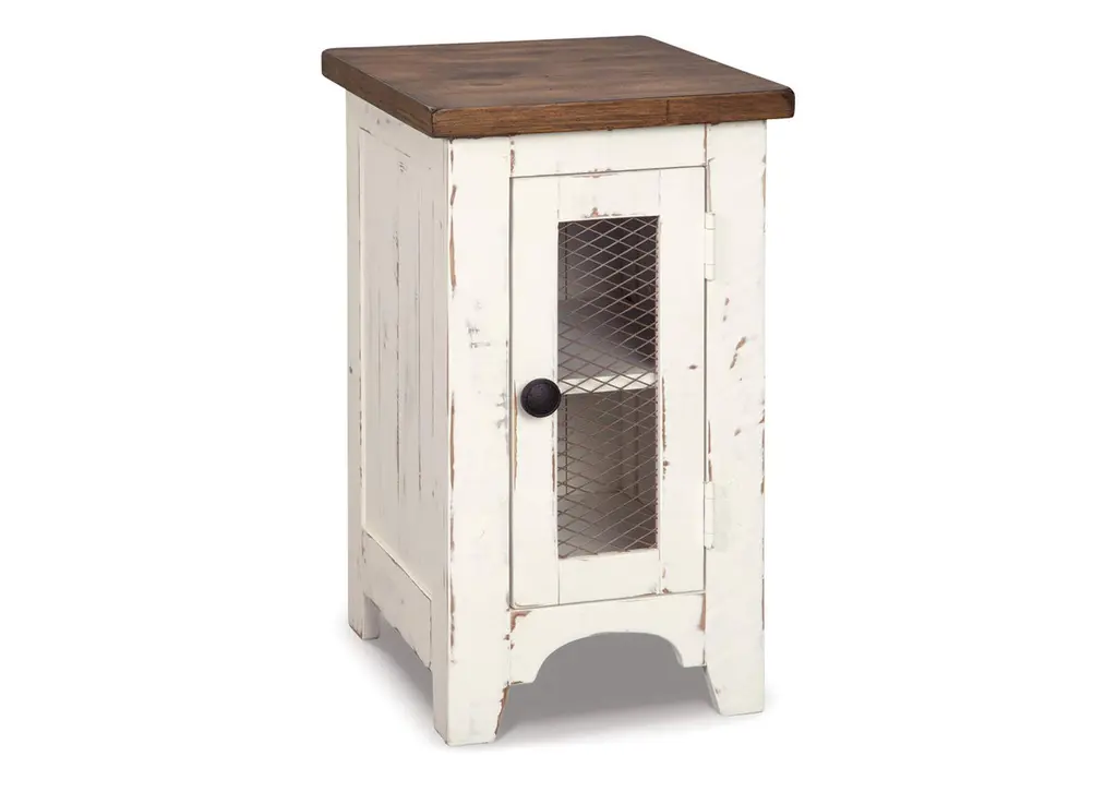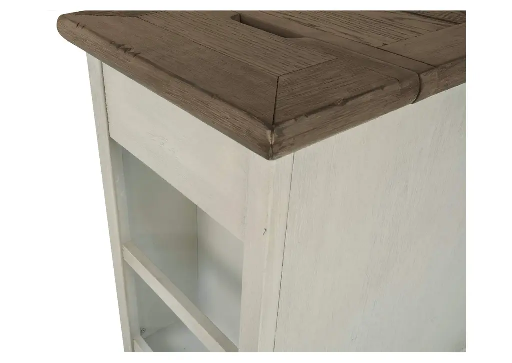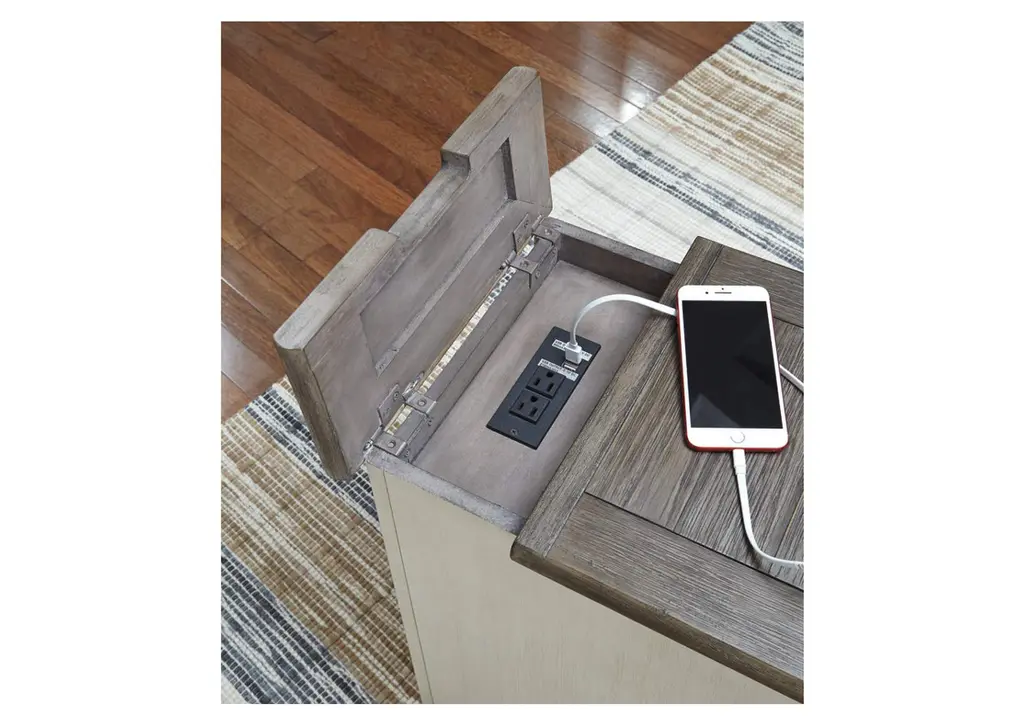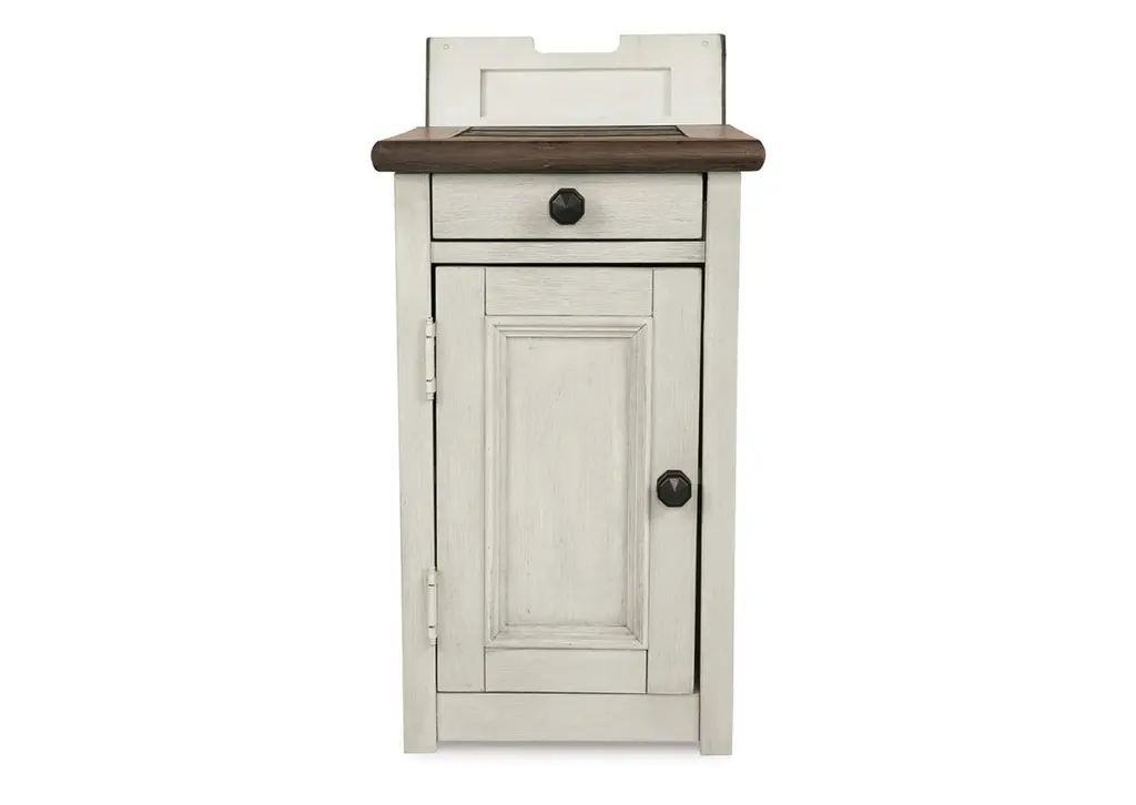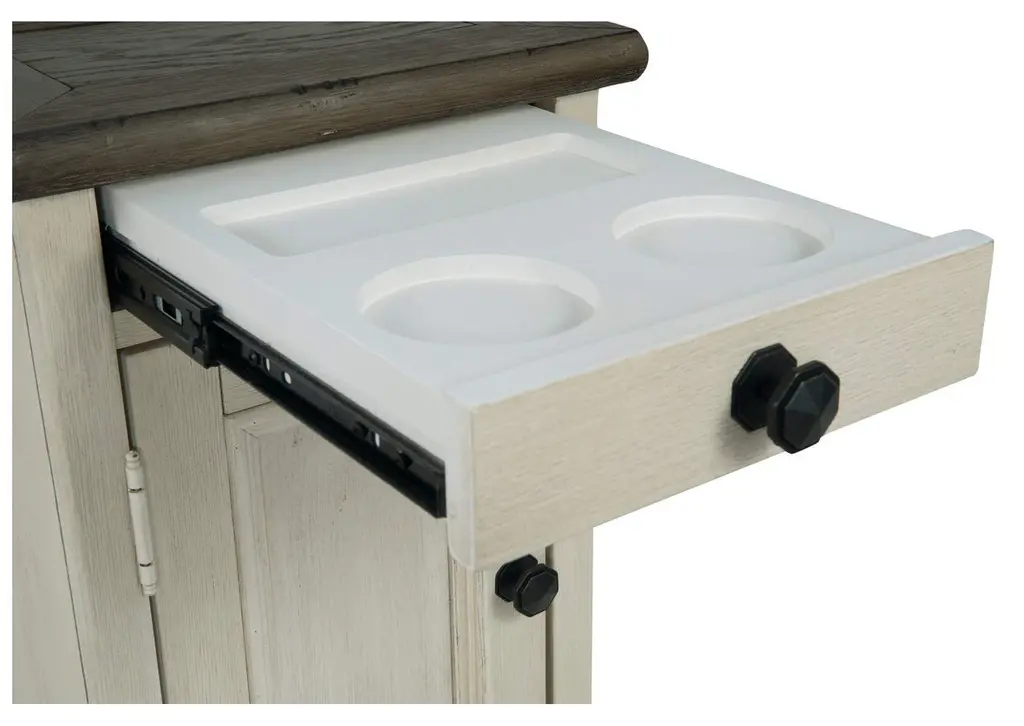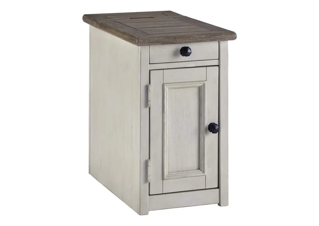 Display and contain your favorite things with the Bolanburg end table. Its textured antique white finish creates a vintage two-tone look, while outlets and USB ports provide functionality. This is a piece you will enjoy for years to come. Weight 53.000 lbs. (23.85kgs.)
