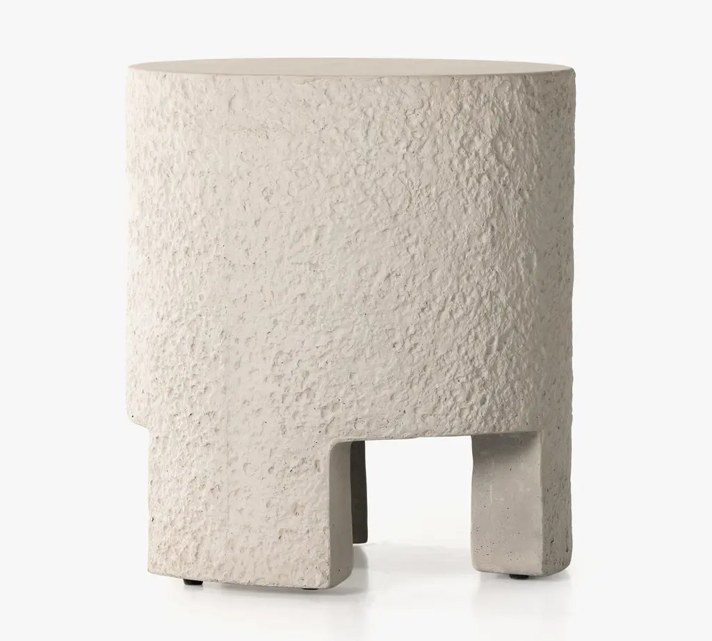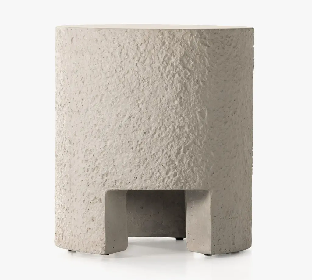 With a cylindrical shape and cutout legs, this end table contrasts bold design with a certain lightness. We love the textural look of the concrete balanced with a smooth top.