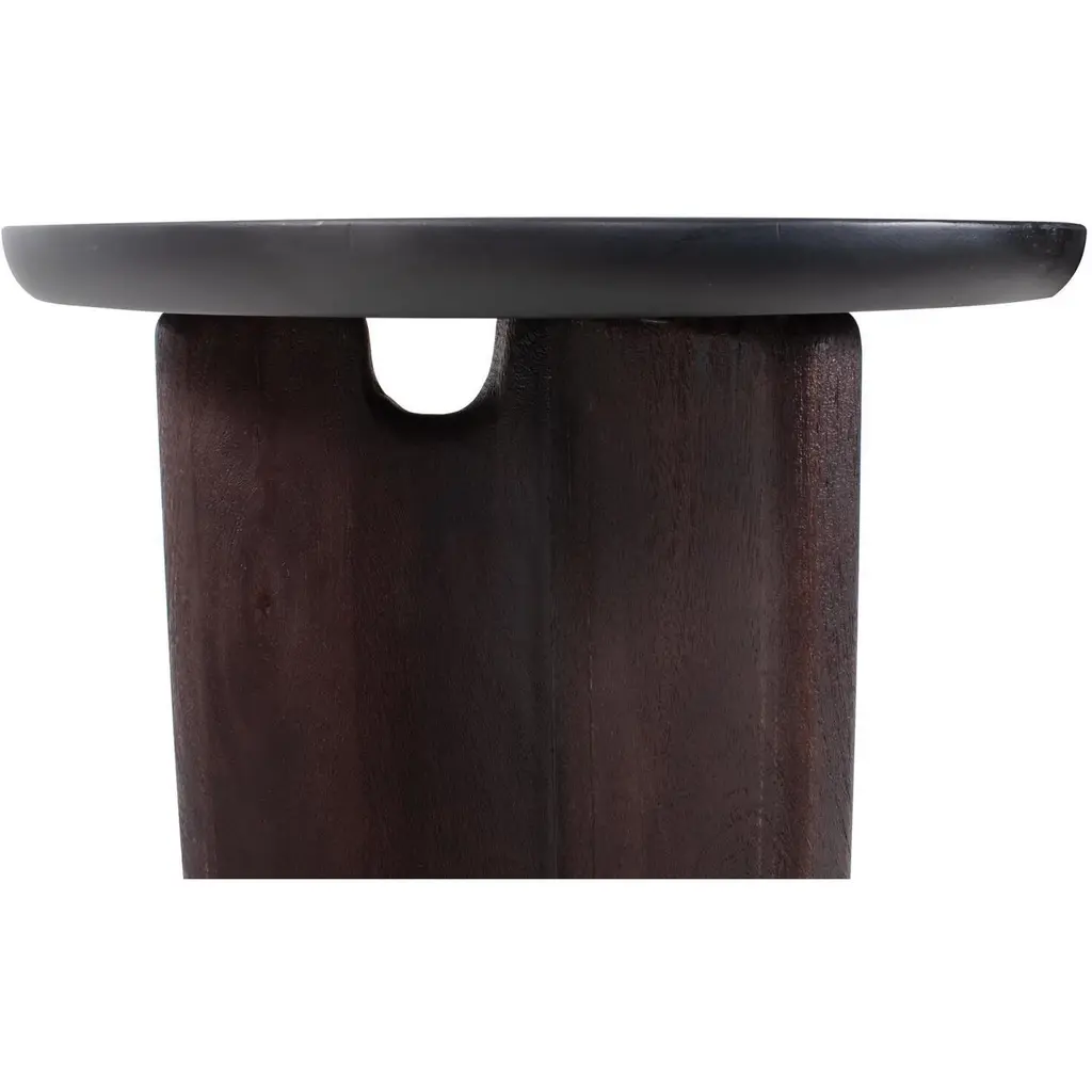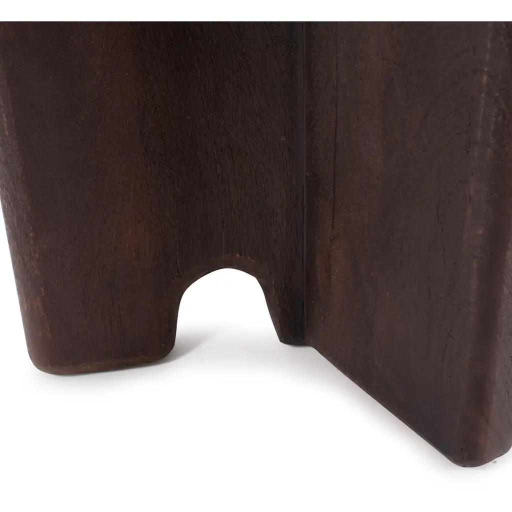 The rich brown hue of the mango wood adds warmth and elegance, making it perfect for any space. The three solid legs beneath are not only structurally sound but also artfully split to distribute the weight evenly. Each leg features neatly carved-out holes, adding a touch of craftsmanship and character.