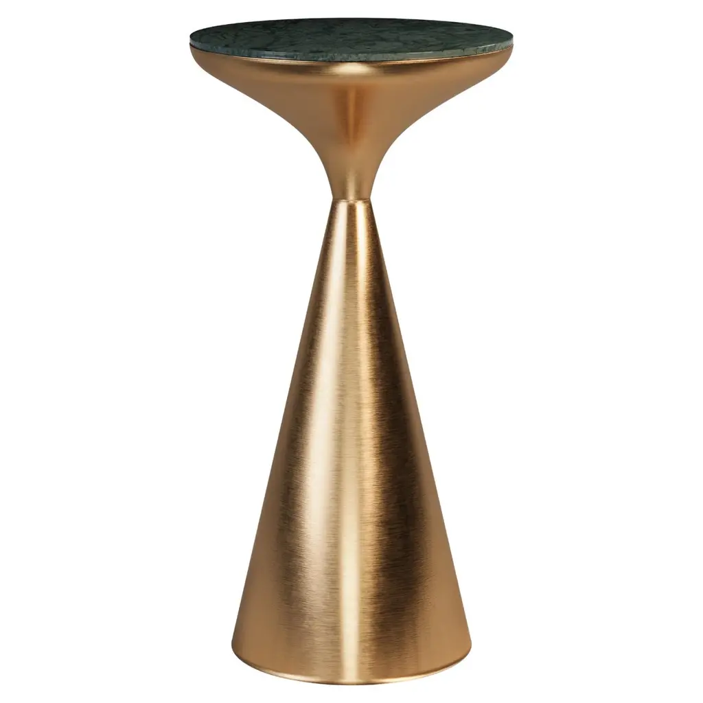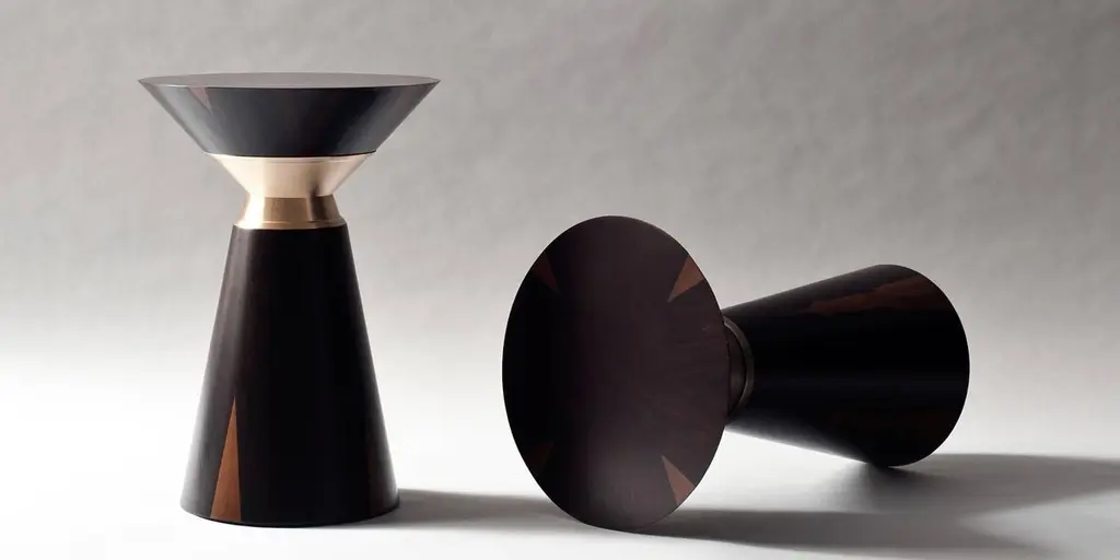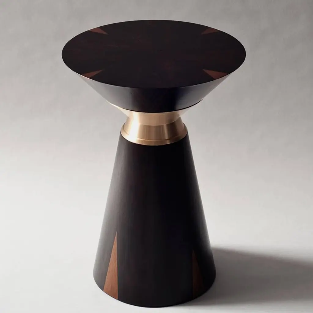 Sheathed in exquisite veneers, the Bolo Side Table reveals a radial pattern of alternating wood grains on its top surface. Perfectly scaled for any seating arrangement, the hourglass form is accentuated by a solid metal collar.