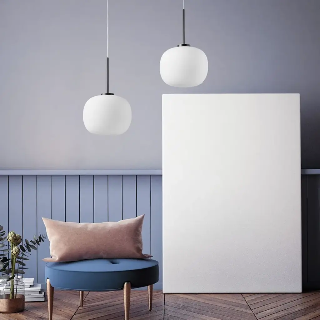 Bombo is a suspension lamp with 2 lights in blown milky white glass. Black painted structure and clear power cable. Black ceiling kit. E27 bulbs. Chance to use LED bulbs.Technical information:- Light source: E27- Power: 2 x max 40w
