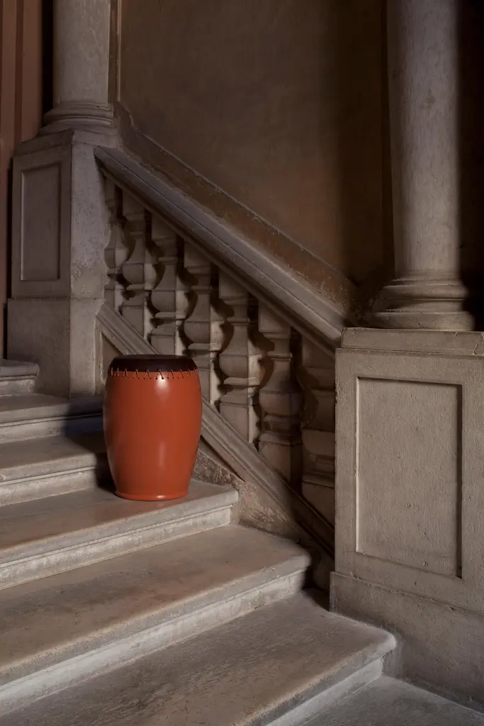 Bombo leather side table by Nestor PerkalIt can also be used as a stoolDimensions: 55 x 40 x 40 cmEnameled stoneware in three different colors, genuine Italian vegetable-tanned leather, colours as per available range, lace in natural color.Handmade in Pesaro, Italy.Nestor Perkal created Bombo in that same spirit. Its name resounds like the beating of a drum; but the reference to Argentinian drums is far more than tongue-in-cheek.The fabrication process is complex. Like upturned jars, these hollow ceramic orbs are handmade, either turned or slip-cast, depending on their Size. What follows is delicate: holes are punched in the yet unfred clay. Once the pieces are fred and glazed, the leather straps that ensure that the skin seat remain taut will be laced through them.Bombo is made exclusively in Pesaro, Italy. Bombo is the result of a fruitful encounter between leather and stoneware, a work of Trans-Alpine savoir-faire.The Bombo collection is extraordinarily versatile; the pieces can be used as coffee tables, side tables, tea tables or stools. With its warm and familiar shapes and soft colors – earth-brown, sky blue, terracotta – Bombo fts gracefully into any décor – ready to “be of service” simply and beautifully.