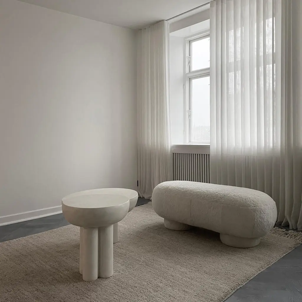 Bone white crown table Low by 101 CopenhagenDesigned by Kristian Sofus Hansen & Tommy HyldahlDimensions: L65 / W65 /H41 CMMaterials: Fiber ConcreteThe collection of tables entitled Crown is cast in one piece formed as a circular tabletop carried by four-cylinder shaped legs. Standing strong and proud, the table is inspired by the bare, structural elements of Brutalist architecture, celebrating the columns, and eluding an attitude towards too many details. The chunky fiber concrete legs enable a large gap between the table edge and legs to emphasize the experience of a massive floating tabletop. The table is available in two sizes and can be used as a single standing side table or stand together as a pair of coffee tables. 101 Copenhagen is a Danish design brand founded in 2017. With a vision to honor exquisite quality and craftsmanship, the collection encompasses furniture, lighting and accessories in a timeless, yet modern design. With a true passion for materials and refined textures, organic shapes and colours, 101 Copenhagen presents the epitome of classics and must-have novelties for Scandinavian and international interior connoisseurs alike.