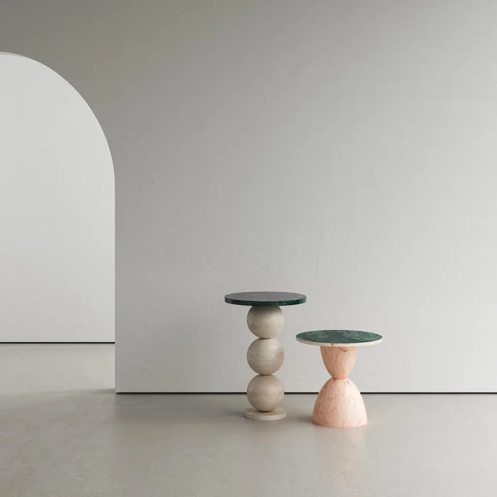 Boneca side table by Gabriela CamposDimensions: Ø 35 x H 35 cm.Materials: Marble composition on negroni, via appia and emerald green.This side table is a reinterpretation of the work “A Boneca” (1928) by Tarsila do Amaral, the muse of Brazilian modernism. The figure of the doll expresses her understanding of her childhood, lived by the artist in a very sweet way. Here we seek to reproduce the Brazilianness and energy of the colors portrayed by the artist in the work, combining a playful soul with fluid and organic lines. For the representation of the form, we seek to respect the contour of the work, with the use of geometric shapes so present in the Cubist movement.