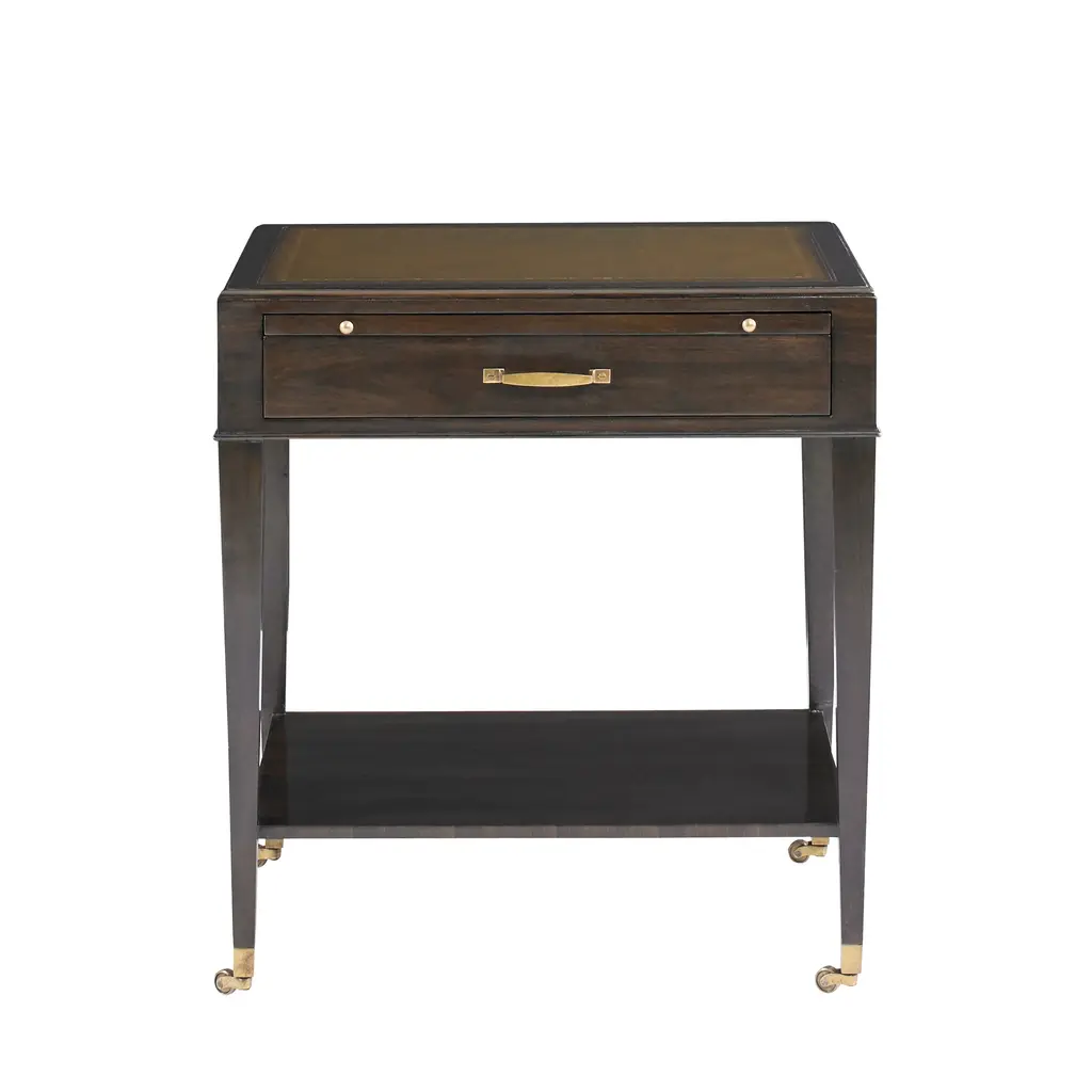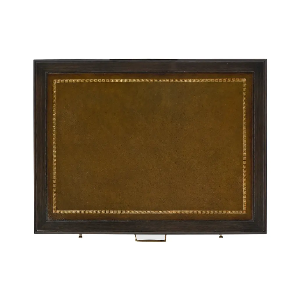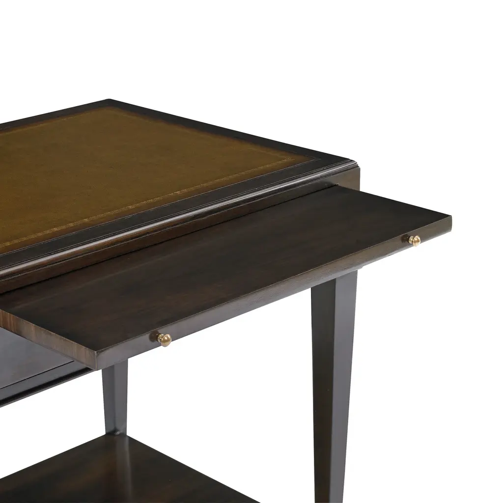 Refined and elegant, the Bordeaux Side Table is luxurious to the eyes and to the touch, with it's rich brown walnut crown veneer, poplar legs, and inlaid leather top. A unique pull-out tray, drawer, and open shelf provide ample storage and utility for this beautiful piece. An intricate tooled Greek key motif boarders the leather top, and the antique brass casters and hardware provide an additional flair to this already grand piece. Ships In 4-5 Weeks Antique brass casters One drawer and pull-out tray Inlaid leather top with tooled Greek key motif border This image is for illustrative purposes only. The colors shown are accurate within the constraints of lighting, photography, and the color accuracy of your screen.