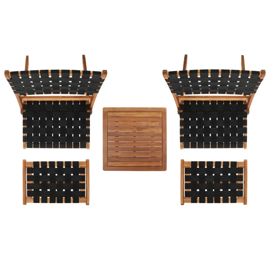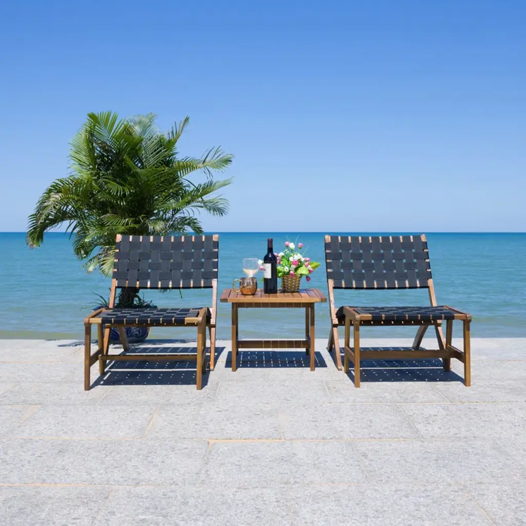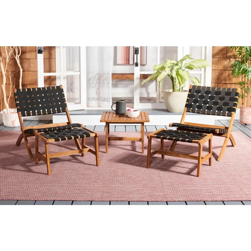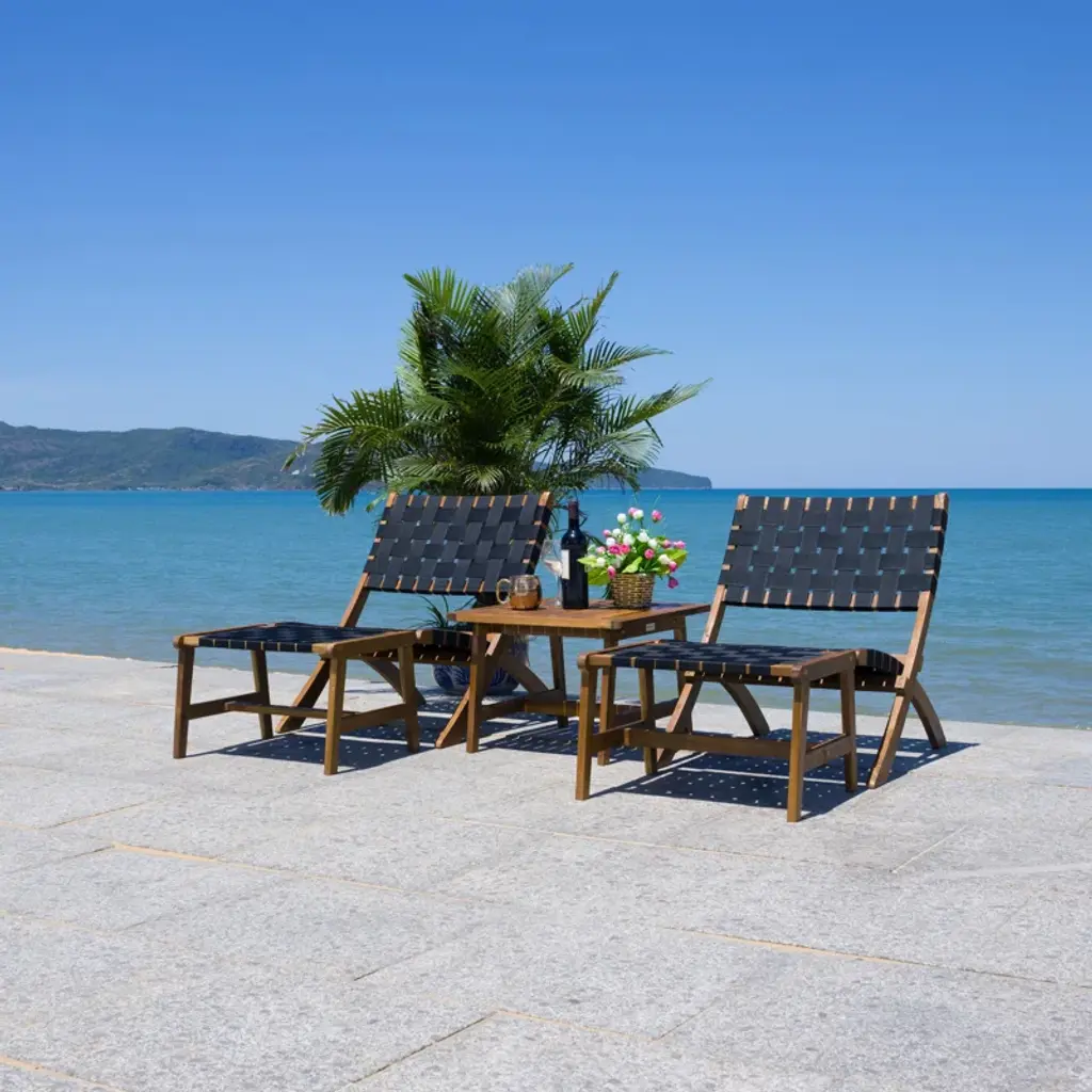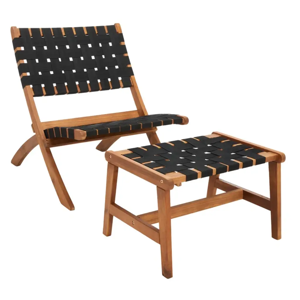 Chat with a friend or soak up some sun on your patio with this 5-piece outdoor furniture set. It comes with two lounge chairs, two matching ottomans, and one end table. Each piece is crafted from weather-resistant acacia wood, making this set just right for sunshiny days and rainy nights. We love how each piece boasts natural wood grain variation for an earthy feel. Plus, the chairs and ottomans feature a plain weave of thick bands at their seats and backs for a breezy, coastal look.