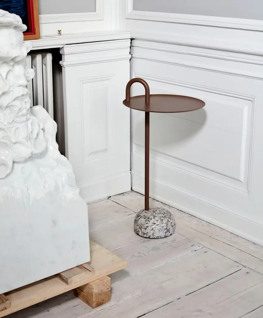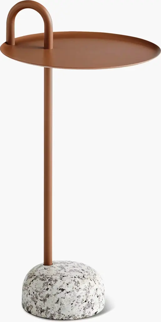 Bowler is a compact side table designed for small spaces. Its single tube support extends upwards from its solid granite base to create a defined profile and a clever, functional semicircular handle. The stem, handle, and tray are made from powder coated steel, making it lightweight enough to move wherever you see fit.