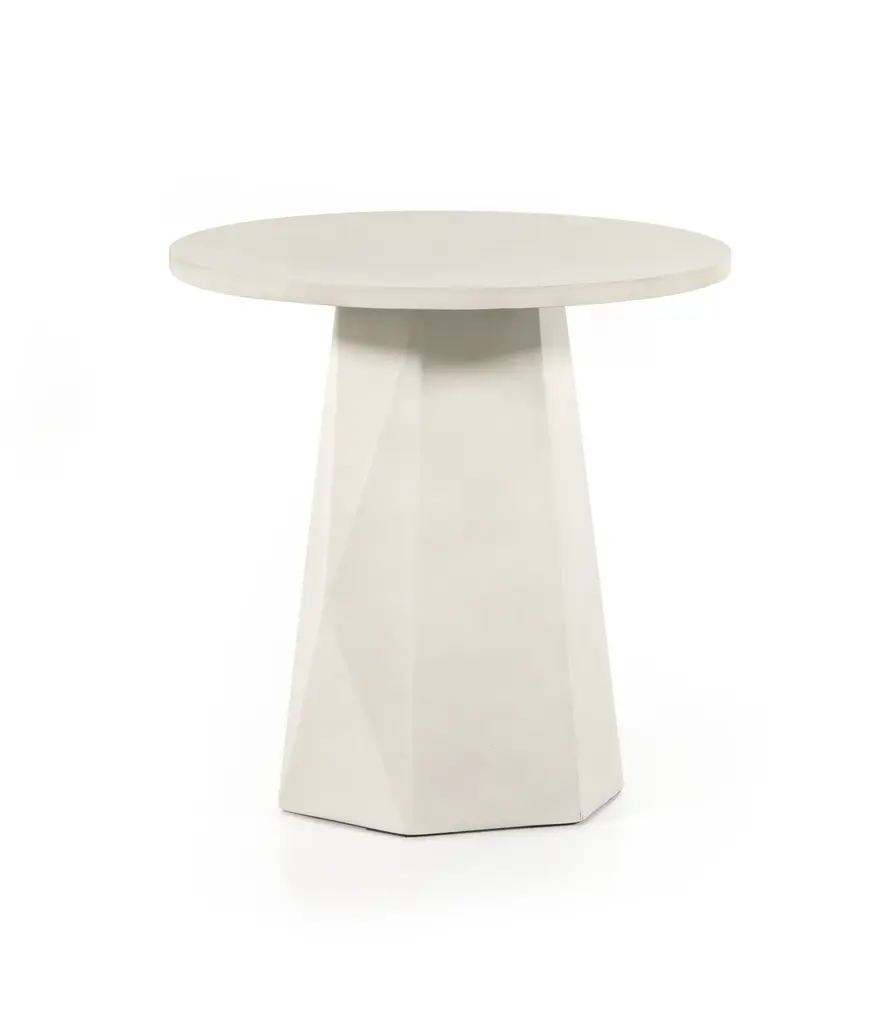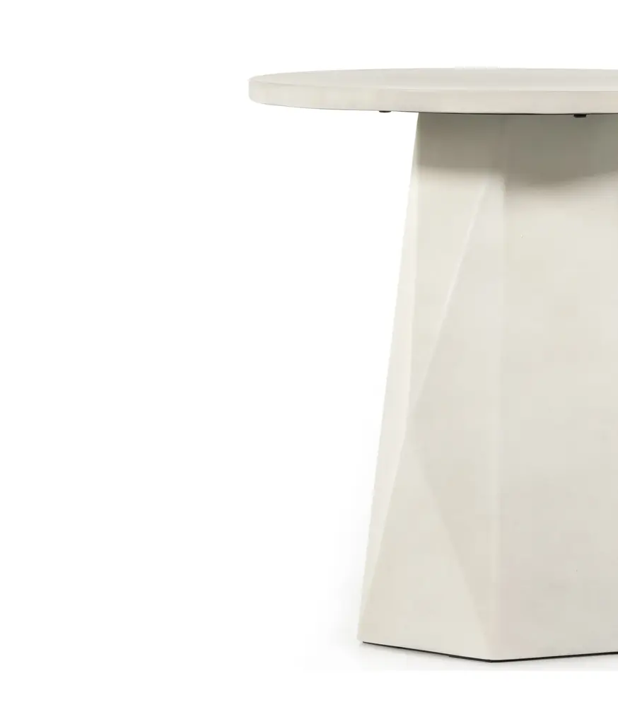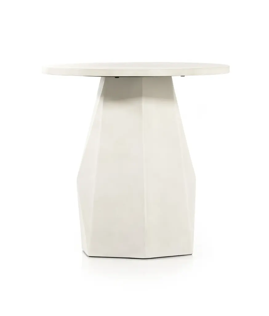 White-finished concrete forms a faceted base for impact from every angle. A rounded top is ready to make an organic statement indoors or out. Cover or store inside during inclement weather and when not in use.