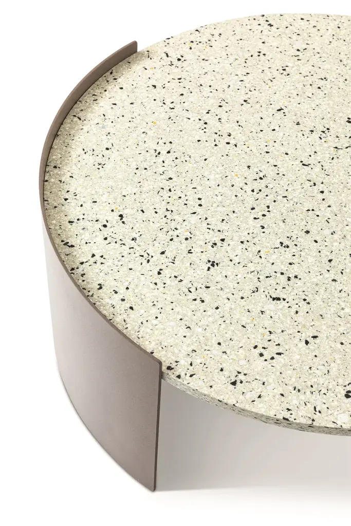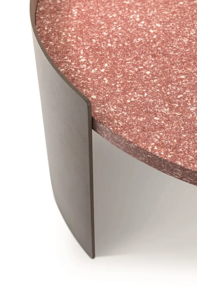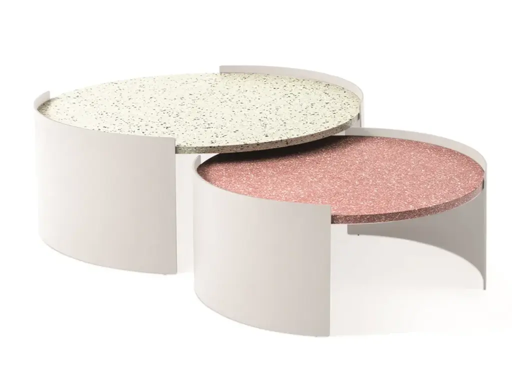 The Bowy side tables, with tapered forms just like the original indoor sofa designed by Patricia Urquiola in 2018, also come in an outdoor version. Available in two different sizes, both of which have an aluminium sheet structure with mud textured or ivory textured finishes and a recycled RFM® glass-reinforced plastic top, available in white and red or white and grey, the tables can be stacked or arranged perpendicular to each other to furnish open air living areas.FRAME Painted aluminum sheet.TOP RFM recycled fiberglass.