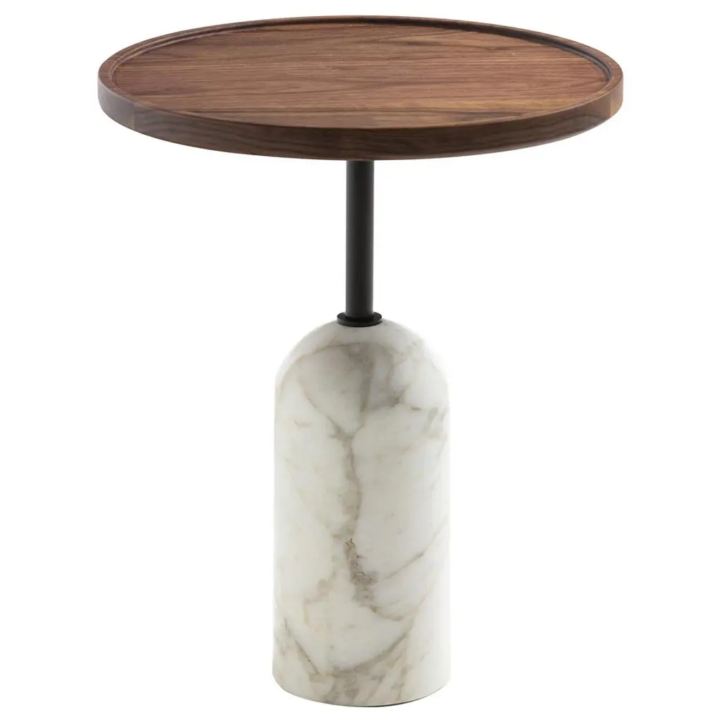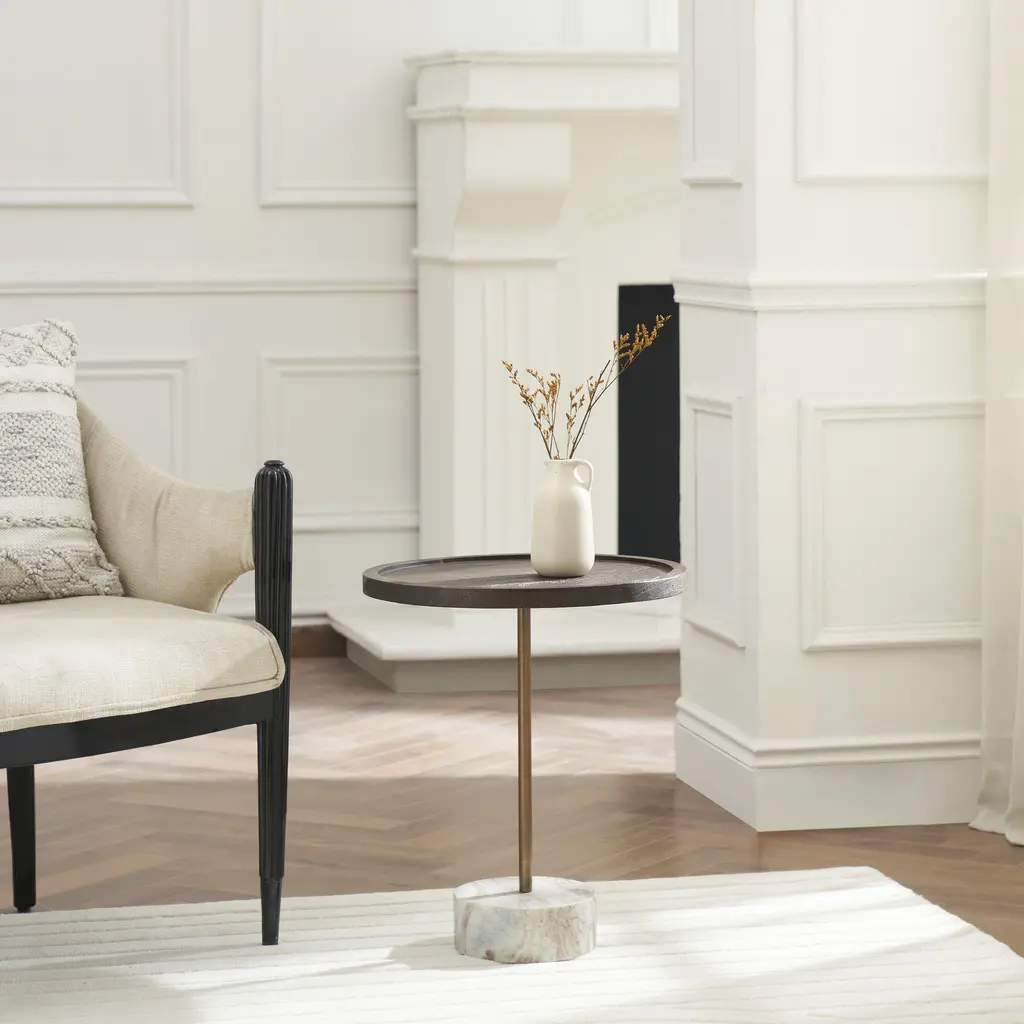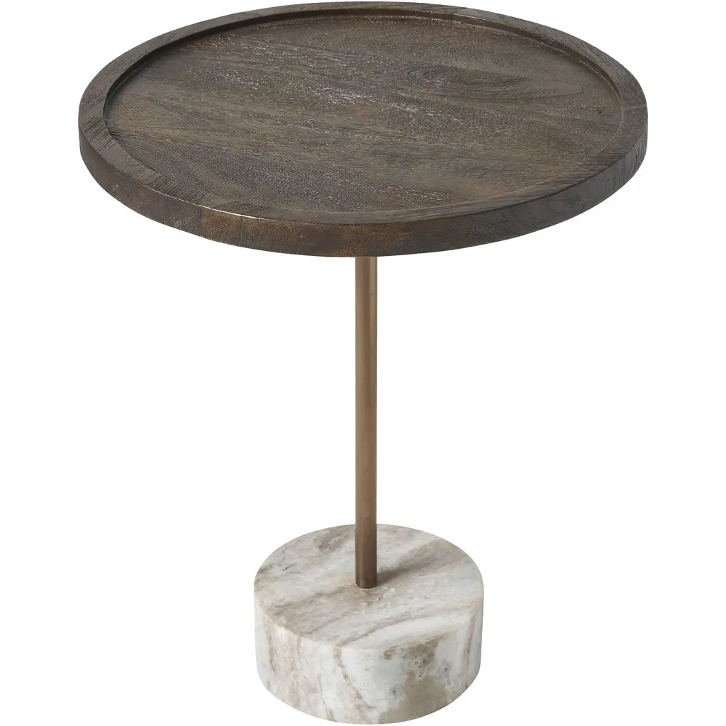 Measuring 18 inches wide, this accent table is an ideal size for placement next to a couch, chaise longue or bed. It features a natural marble and antique brass finished iron base for an airy feel and a mango wood tabletop with a walnut finish for a dark wood effect thats totally on trend. Sleek and simple in its design, this end table would be a great complement to any design project.