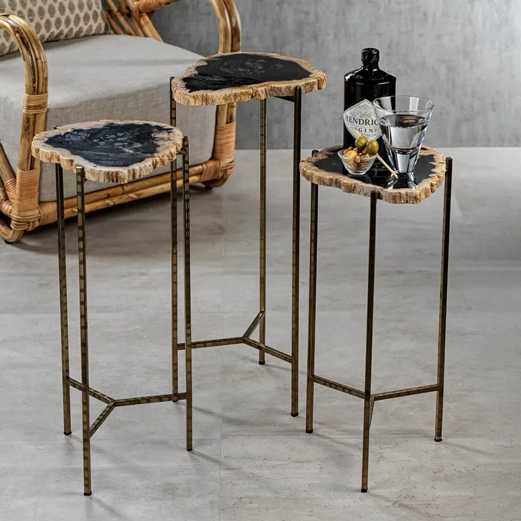 Natural petrified wood slice hand-cut and polished on steel base. Solid wood slab is loose on base. Each slice is unique and will vary in size, shape, and color. Cracking, knot holes and other natural occurrences should be expected. This awesome side table would look great in any room. A slice of petrified wood tops our table's slim gold tone frame Each top is unique in its shape, color and grain patterns with lacquer finish Tri-leg polished stainless steel base Add a modern touch to your room Care Instructions: Wipe with dry soft cloth