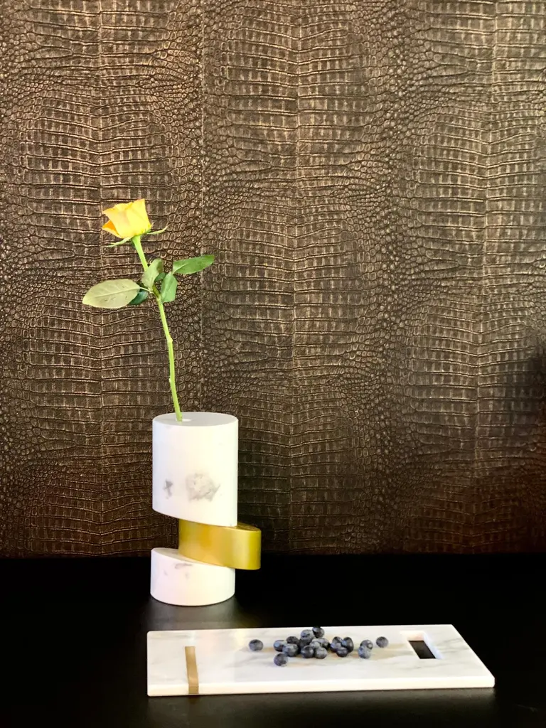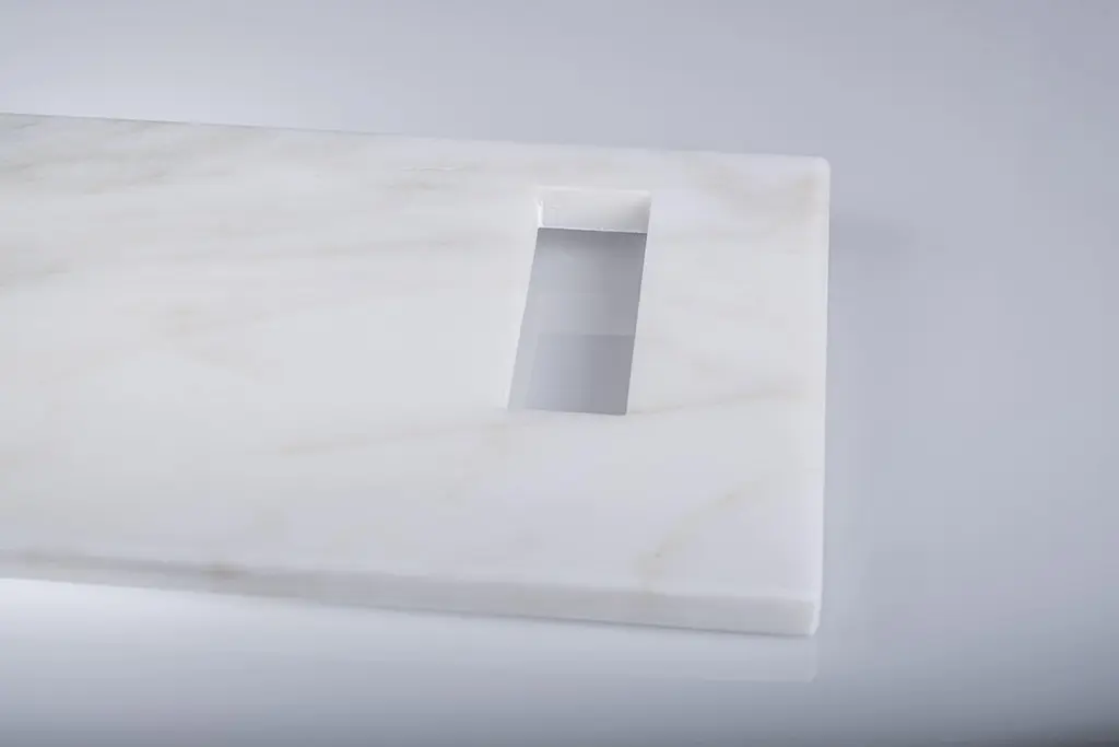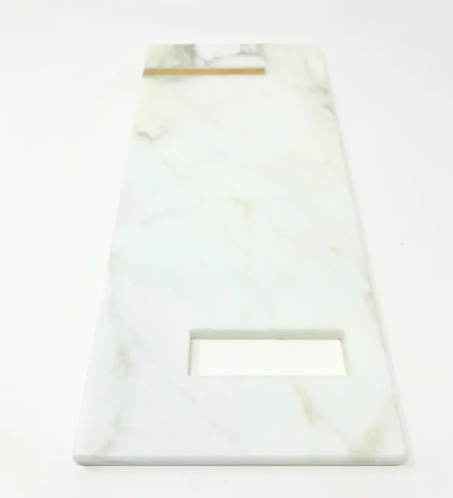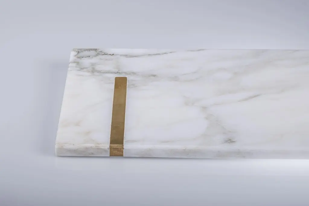 The Brass chopping board, entirely made of marble, is an exclusive chopping board with a rectangular handle in Calacatta Gold embellished with a brass tab on one end, giving it a further touch of refined style. The Brass chopping board is part of the new ""Brass"" Tablewear & Desk Accessories collection, created through the reuse of different types of natural stones. Through these objects we want to offer our customers objects of sustainable design, to give a touch of elegance and refinement to their dining room or office.Entirely made with residual materials from other projects, the Brass collection, created in collaboration with the designer Cristina Romanello, is made up of exclusive trays, placemats, cutting boards, cutlery trays, coasters, place cards and pen holders designed to give more class and elegance to your table or at your office.