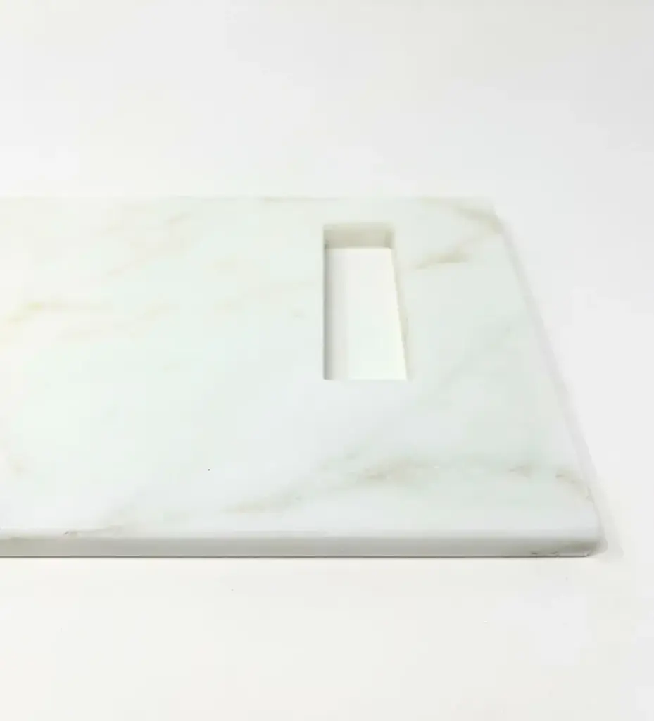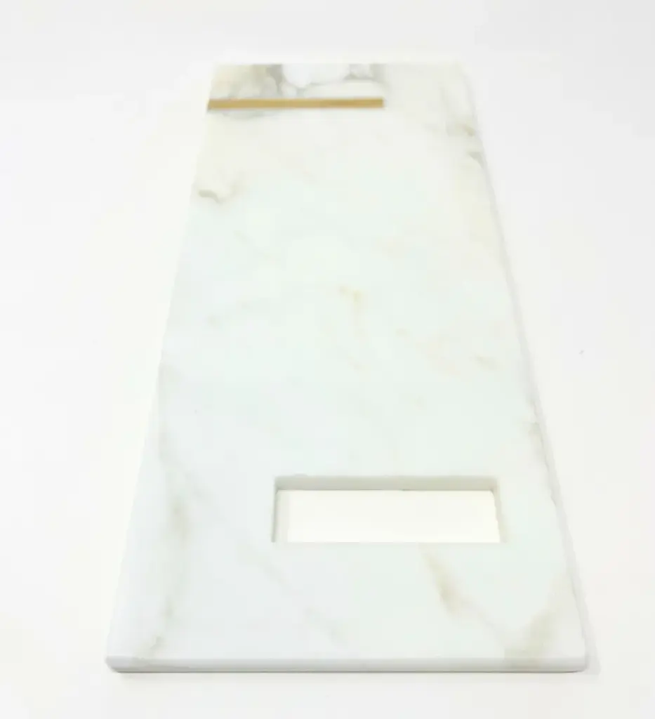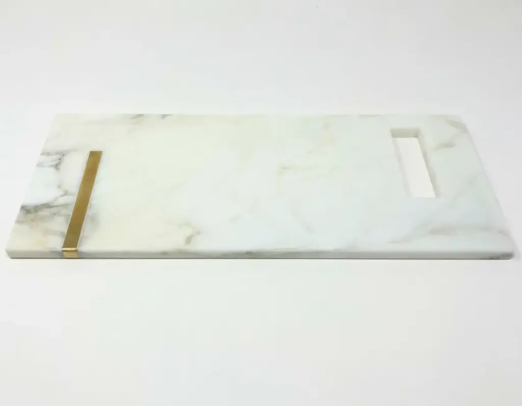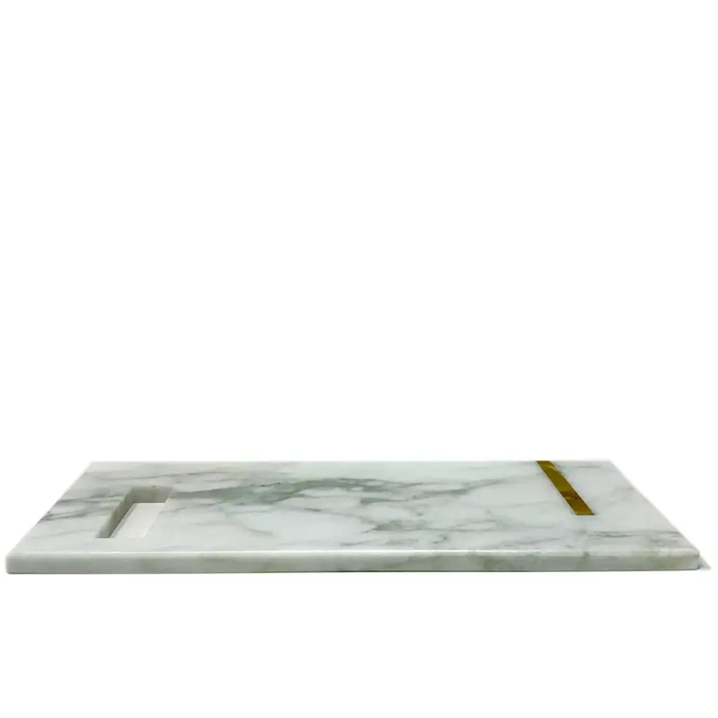 The Brass chopping board, entirely made of marble, is an exclusive chopping board with a rectangular handle in Calacatta Gold embellished with a brass tab on one end, giving it a further touch of refined style.BThe Brass chopping board is part of the new "Brass" Tablewear & Desk Accessories collection, created through the reuse of different types of natural stones. Through these objects we want to offer our customers objects of sustainable design, to give a touch of elegance and refinement to their dining room or office.rEntirely made with residual materials from other projects, the Brass collection, created in collaboration with the designer Cristina Romanello, is made up of exclusive trays, placemats, cutting boards, cutlery trays, coasters, place cards and pen holders designed to give more class and elegance to your table or at your office. Variations in color or slight imperfections are the result of the craftsmanship of this article and are not to be considered defects.
