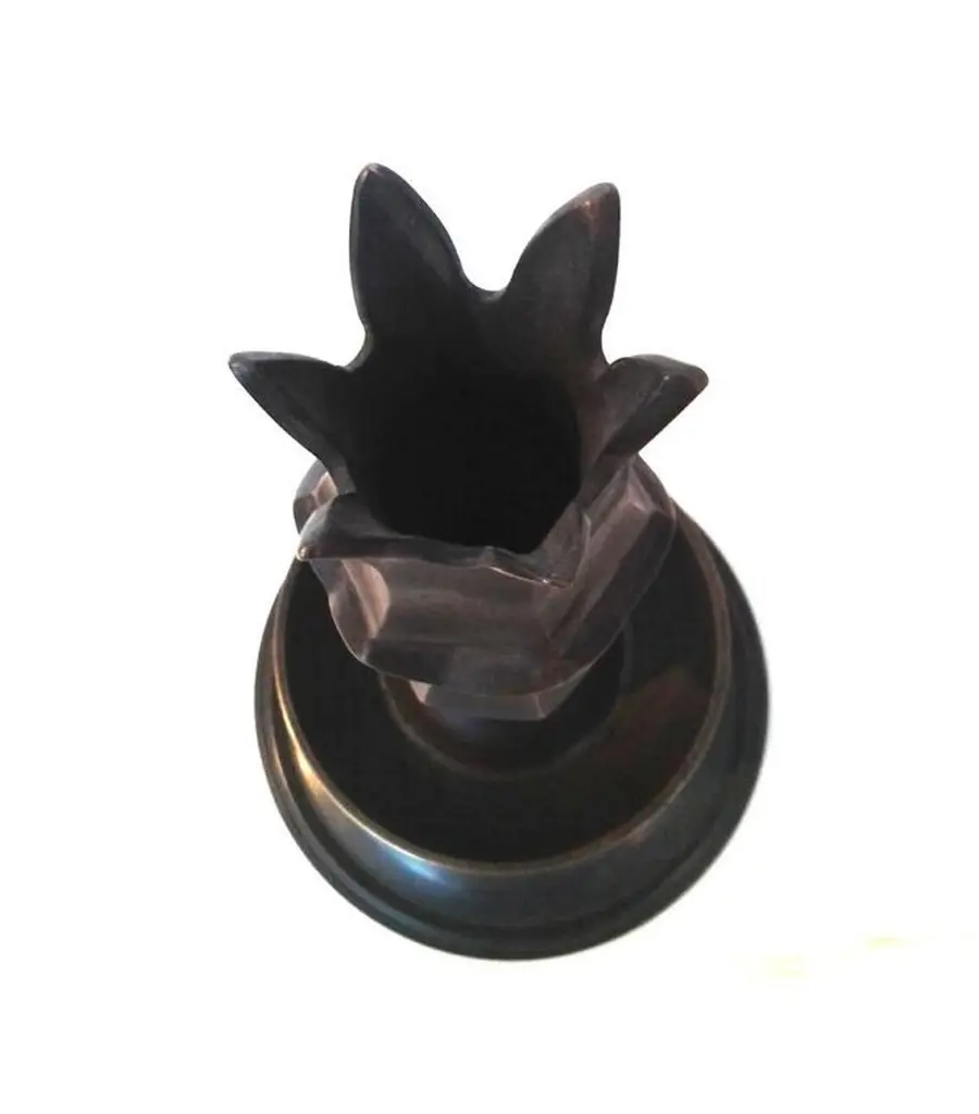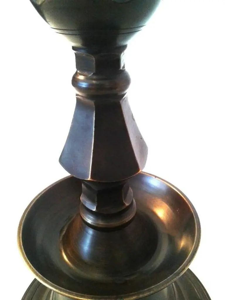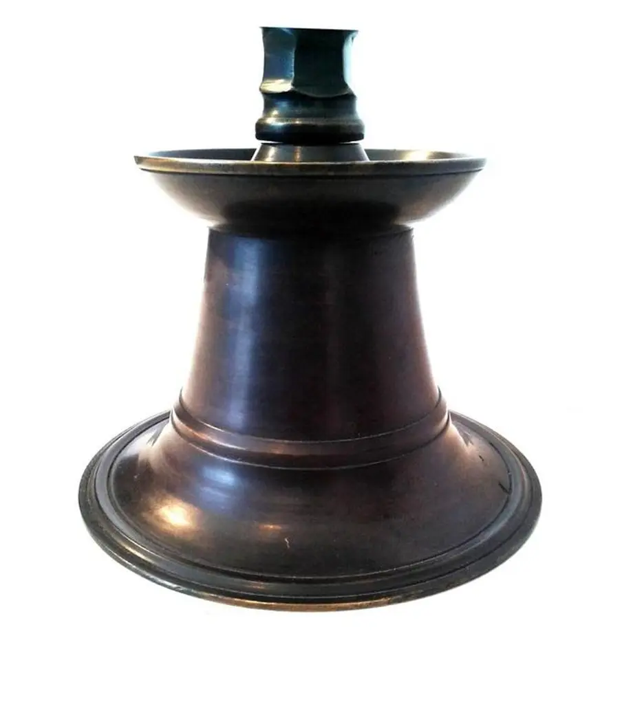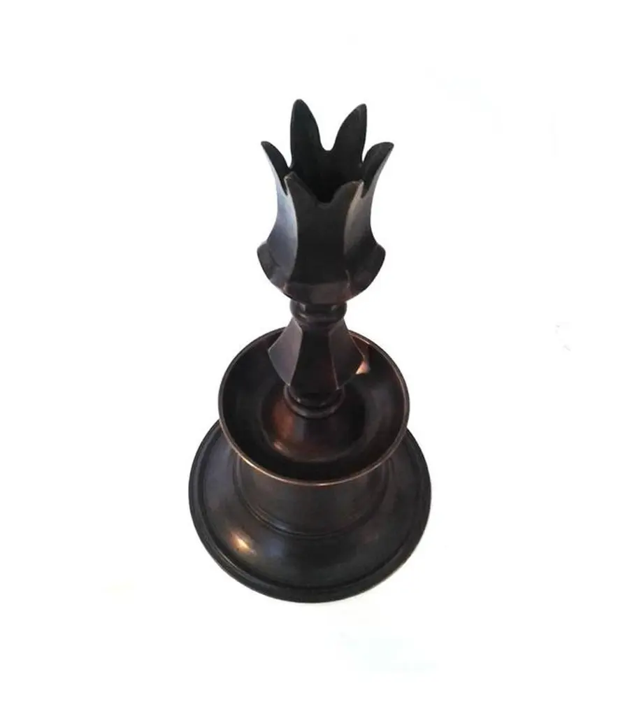 A solid brass candleholder from Turkey. Sturdy forged construction. Crown head. Measures: 15 1/4" high on a 8 1/4"diameter baseElegant accent for any dining table, coffee table, side table or console.