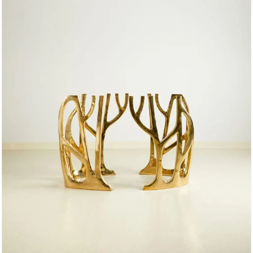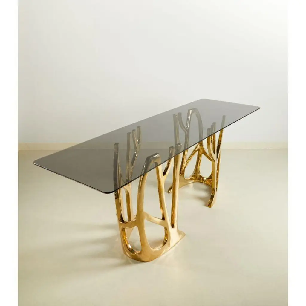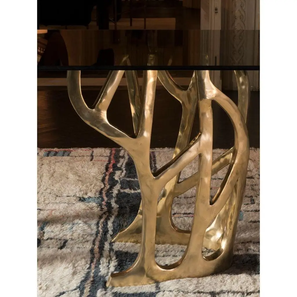 Brass Sculptural Galaxy Console Table by MisayaDimensions: W40 x D40 x H69 cmMaterials: BrassAlso available: different colors (gold, polished brass. black, painted brass) and materials ( wood, marble).Sold without glass top.MASAYA is our brand’s collection which combines stylishly refined designs with the purity of solid Wood & Marble Tops and Bronze Bases. MASAYA creates both classic and contemporary furniture that fits seamlessly into our everyday lives. As Thailand is globally renowned for its unsurpassed bronze work, products from our collections are often a unique mix of Wood and Bronze home furniture. These include Dining Tables, Coffee Tables, Consoles, Stools, Benches, Chairs, Cocktail& Side-Tables both for in-house or out-doors decorations. Our Wood consists of Teak Wood, also available in Makha Wood, Burma Pradauk Wood (also known as Andaman Red Wood) and others to suit your preferencesAdditionally, customers can also create custom sized furniture by combining MASAYA models, compatible sizes, Bronze base frames, a wide range of Wood tops of various types and sizes, also available in Marble tops, and colors to perfectly match your choice of perfection.MASAYA furniture is authentic, comfortable and natural. It is strong, functional and sturdy. Every product is finished carefully in our own workshops in Thailand. Each design embodies the same refined craftsmanship and adds to create a homely atmosphere. Our furniture design is created to give a naturally elegant look to your household, making you and your guests feel at home and welcomed.