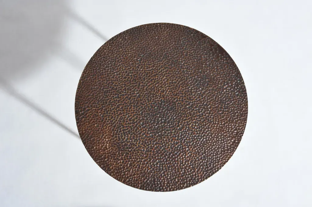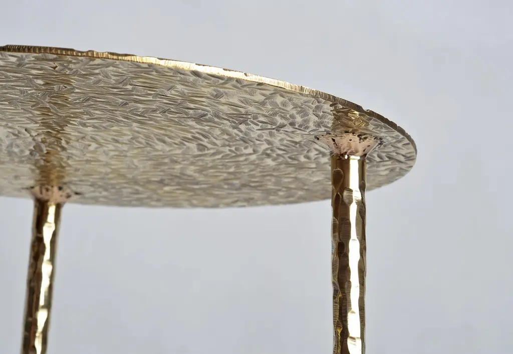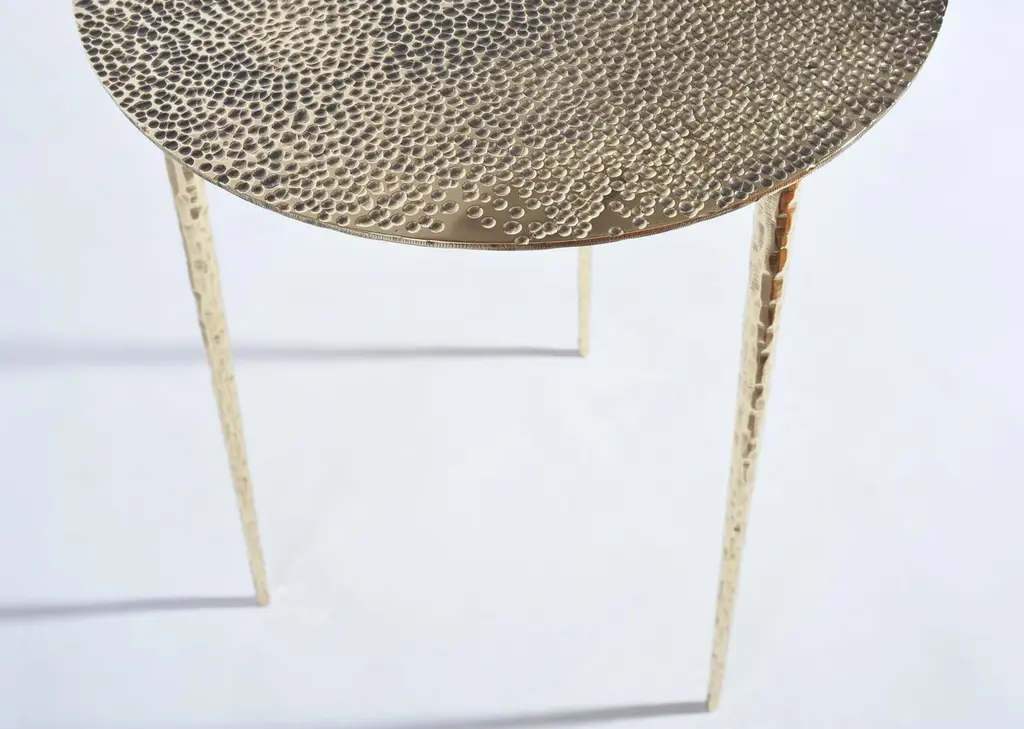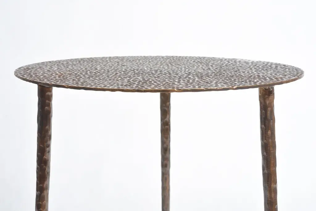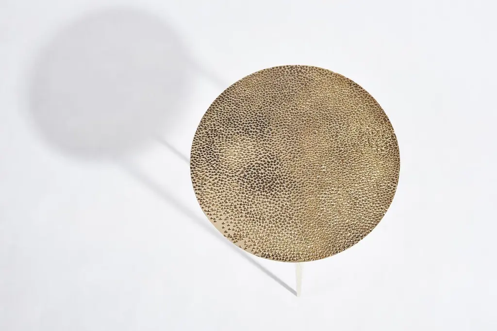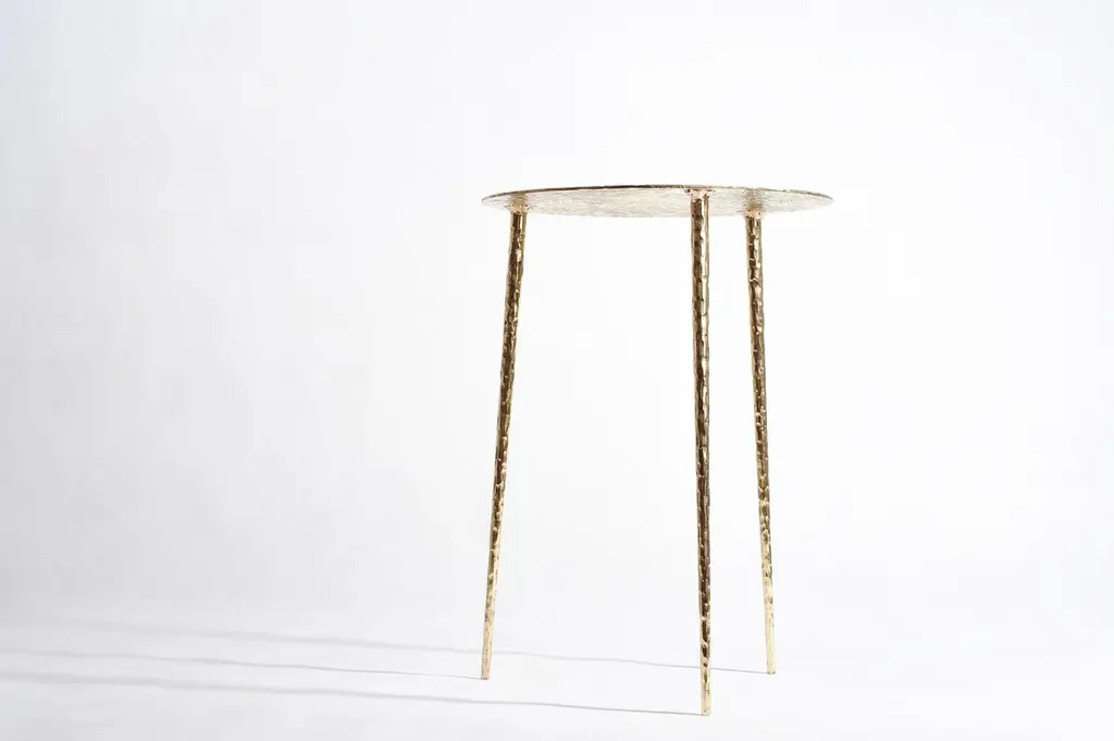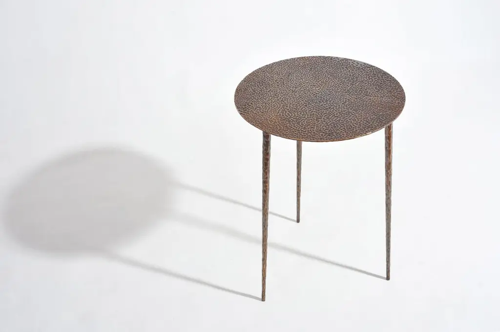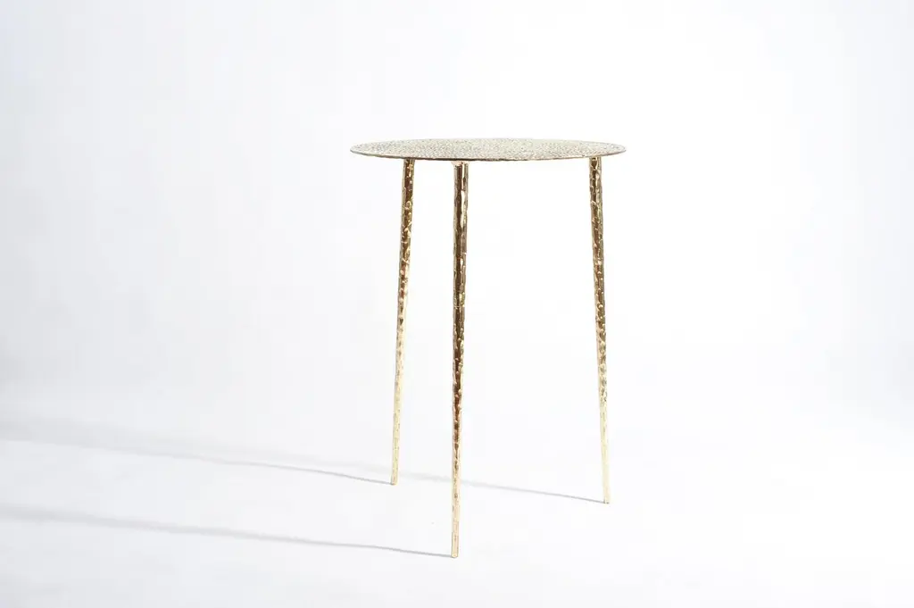 Brass side table signed by Lukasz Friedrich.Side rable "Drops"Materials: patinated, carved brass,Dimensions:D 40 cm H 55 cmCan be made to order in other dimensions. Also available in Polished Brass.Signed and datedLukasz Friedrich (born 1980), lives and works in Warsaw. He is a self-taughtdesigner and craftsman. Lukasz grew up in and around gloomy and dusty metal workshop of his grandfather and father. In this family run manufacture he first met and got acquainted with accidental, not intended beauty of purely technical environment. Fascinating lathe machines and heavy pneumatic hammers not to mention poetic and almost ancient framesaw were his first objects of fascination. Once playground this old, no longer existing workshop later became his source of inspiration.Academic studies in social science with focus on cultural anthropology gave him professional insight into artifacts of human creation. During extensive fieldwork he once again fell in love with things small and omitted but visually very appealing. After getting his MA in Cultural Anthropology he entered family workshop as a co-worker. During years spent at working table manufacturing commissioned pieces, Lukasz was developing his own craft. Skills he gained allow him to hand make mostly every design he intends.He still gets his inspiration from technical surrounding. Very often possibilities and limitations given by materials become questions seeking answer. He likes his items raw but undoubtedly finished. Elegance and sophistication may be enclosed in the most simple shapes of often almost ordinary objects.