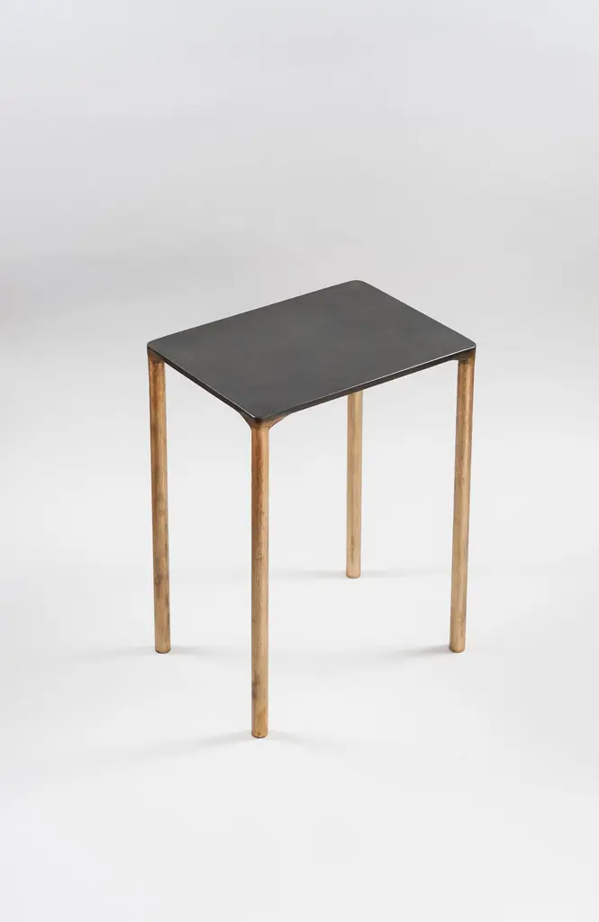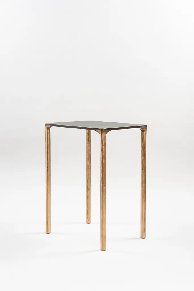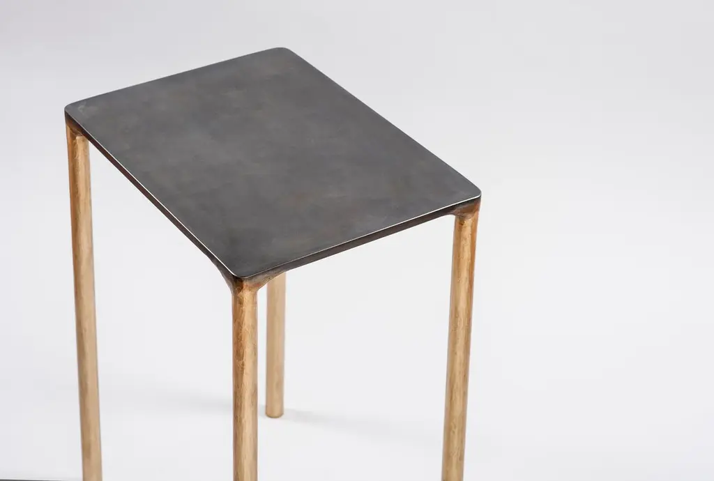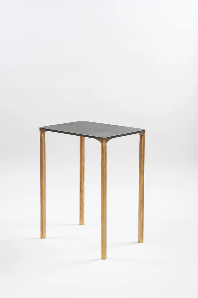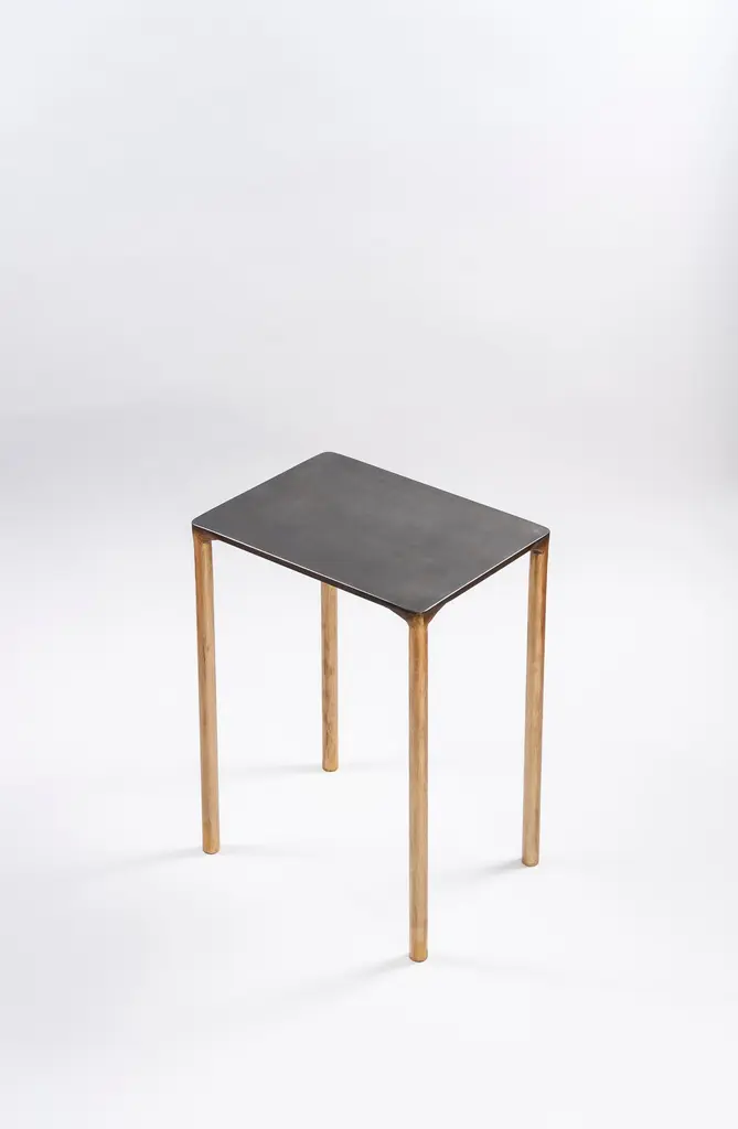 Brass side table signed by Lukasz Friedrich.Materials: Solid Brass and Stainless steel.Brass legs gently textured and patinatedStainless top with special treatment and grey patina.Dimensions: D 28 cm, L 38 cm, H 50 cm.Signed and dated.Lukasz Friedrich (born 1980), lives and works in Warsaw. He is a self-taughtdesigner and craftsman. Lukasz grew up in and around gloomy and dusty metal workshop of his grandfather and father. In this family run manufacture he first met and got acquainted with accidental, not intended beauty of purely technical environment. Fascinating lathe machines and heavy pneumatic hammers not to mention poetic and almost ancient framesaw were his first objects of fascination. Once playground this old, no longer existing workshop later became his source of inspiration.Academic studies in social science with focus on cultural anthropology gave him professional insight into artifacts of human creation. During extensive fieldwork he once again fell in love with things small and omitted but visually very appealing. After getting his MA in Cultural Anthropology he entered family workshop as a co-worker. During years spent at working table manufacturing commissioned pieces, Lukasz was developing his own craft. Skills he gained allow him to hand make mostly every design he intends.He still gets his inspiration from technical surrounding. Very often possibilities and limitations given by materials become questions seeking answer. He likes his items raw but undoubtedly finished. Elegance and sophistication may be enclosed in the most simple shapes of often almost ordinary objects.