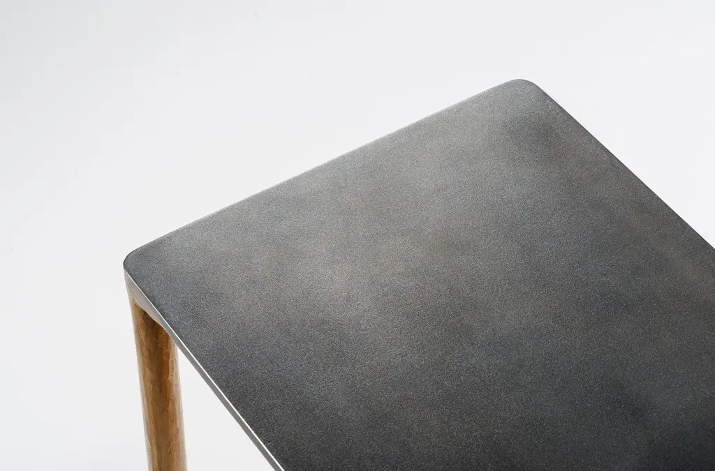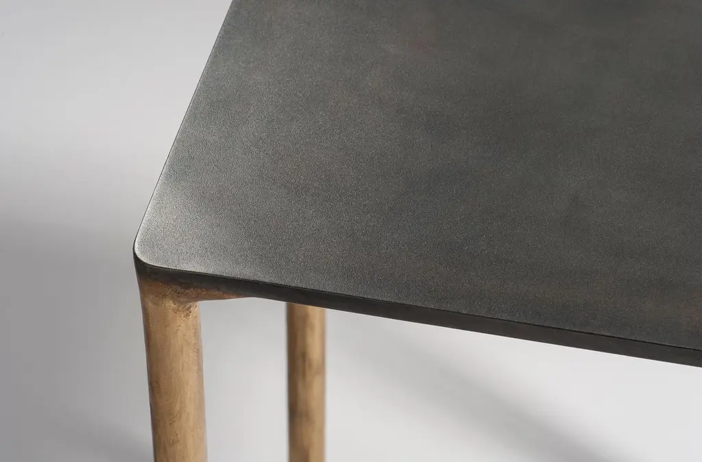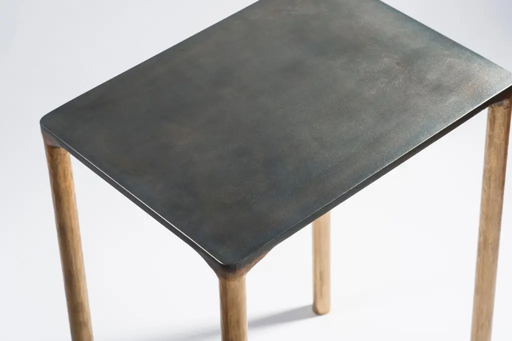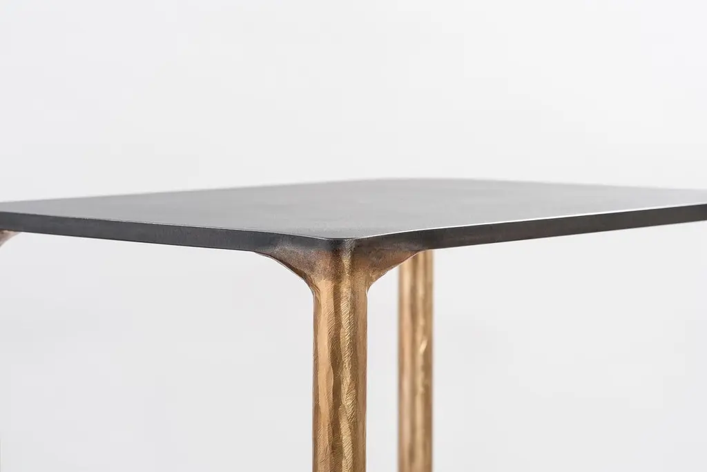 Brass side table signed by Lukasz Friedrich.Materials: Solid Brass and Stainless steel.Brass legs gently textured and patinatedStainless top with special treatment and grey patina.Dimensions: D 28 cm, L 38 cm, H 50 cm.Signed and dated.Lukasz Friedrich (born 1980), lives and works in Warsaw. He is a self-taughtdesigner and craftsman. Lukasz grew up in and around gloomy and dusty metal workshop of his grandfather and father. In this family run manufacture he first met and got acquainted with accidental, not intended beauty of purely technical environment. Fascinating lathe machines and heavy pneumatic hammers not to mention poetic and almost ancient framesaw were his first objects of fascination. Once playground this old, no longer existing workshop later became his source of inspiration.Academic studies in social science with focus on cultural anthropology gave him professional insight into artifacts of human creation. During extensive fieldwork he once again fell in love with things small and omitted but visually very appealing. After getting his MA in Cultural Anthropology he entered family workshop as a co-worker. During years spent at working table manufacturing commissioned pieces, Lukasz was developing his own craft. Skills he gained allow him to hand make mostly every design he intends.He still gets his inspiration from technical surrounding. Very often possibilities and limitations given by materials become questions seeking answer. He likes his items raw but undoubtedly finished. Elegance and sophistication may be enclosed in the most simple shapes of often almost ordinary objects.