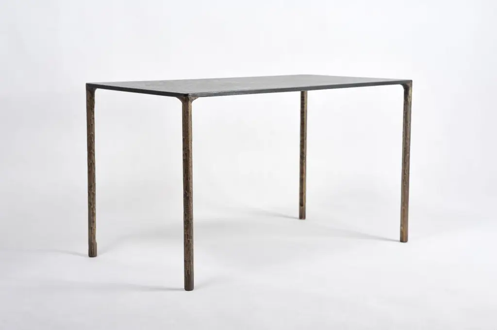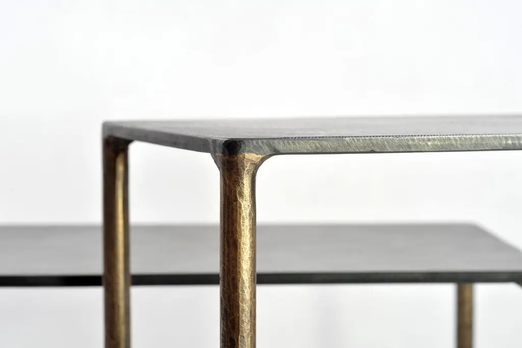 Brass side table signed by Lukasz FriedrichTextured side or coffee tableMaterials: legs, patinated brass; top, patinated and waxed steelDimensions: D 38 cm, L 68 cm, H 40 cmSigned and datedLukasz Friedrich (born 1980), lives and works in Warsaw. He is a self-taughtDesigner and craftsman. Lukasz grew up in and around gloomy and dusty metal workshop of his grandfather and father. In this family run manufacture he first met and got acquainted with accidental, not intended beauty of purely technical environment. Fascinating lathe machines and heavy pneumatic hammers not to mention poetic and almost ancient frameSaw were his first objects of fascination. Once playground this old, no longer existing workshop later became his source of inspiration.Academic studies in social science with focus on cultural anthropology gave him professional insight into artifacts of human creation. During extensive fieldwork he once again fell in love with things small and omitted but visually very appealing. After getting his MA in Cultural Anthropology he entered family workshop as a co-worker. During years spent at working table manufacturing commissioned pieces, Lukasz was developing his own craft. Skills he gained allow him to hand make mostly every design he intends.He still gets his inspiration from technical surrounding. Very often possibilities and limitations given by materials become questions seeking answer. He likes his items raw but undoubtedly finished. Elegance and sophistication may be enclosed in the most simple shapes of often almost ordinary objects.