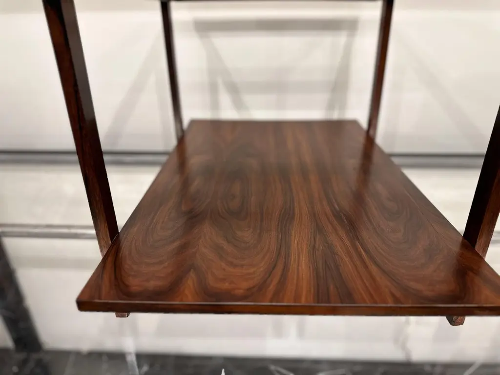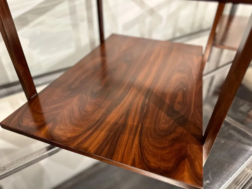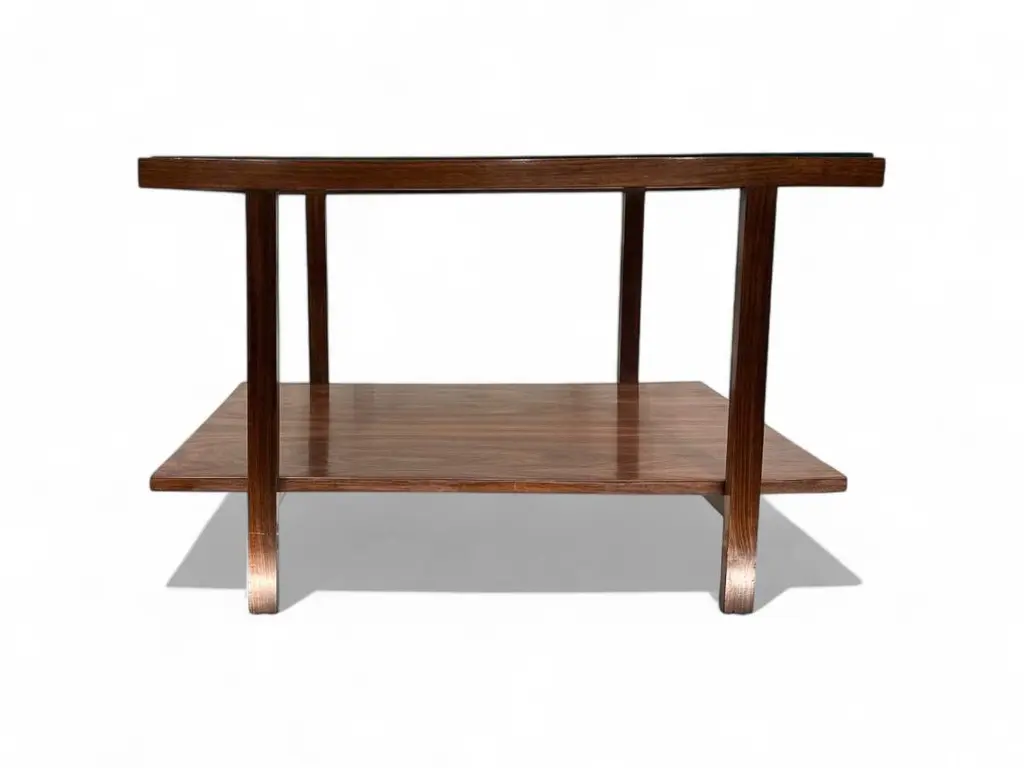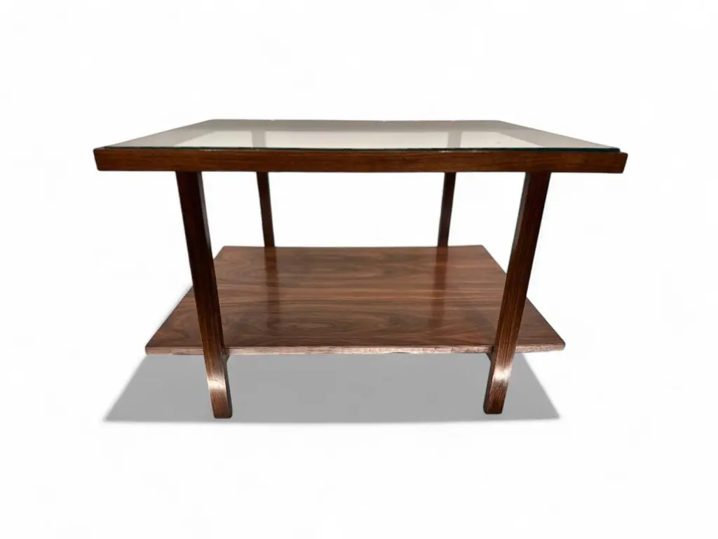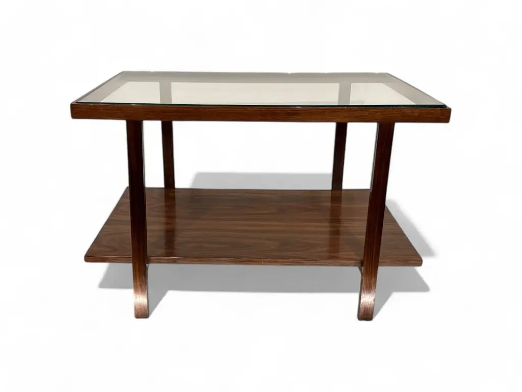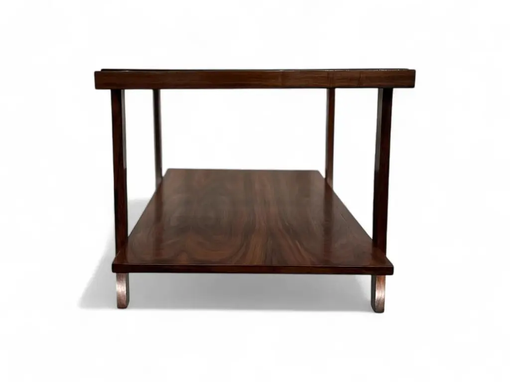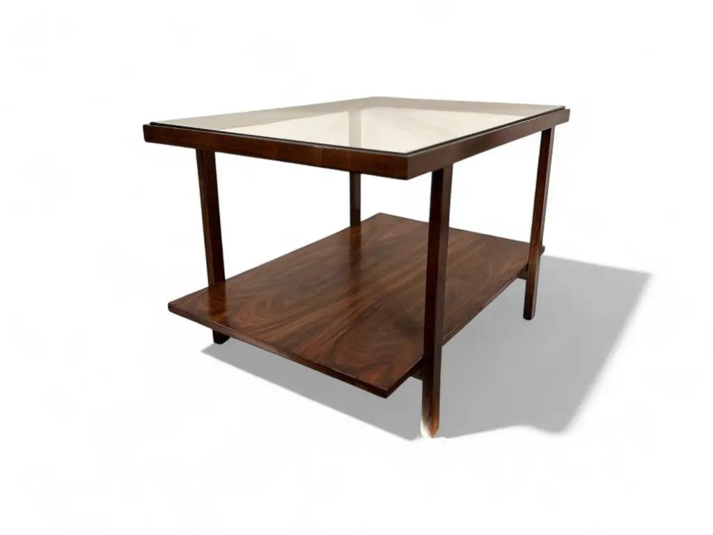 This Brazilian Modern Rectangular Side Table in Hardwood & Glass, Unknown, c. 1960 are stunning!The piece is crafted from Brazilian Rosewood, also known as Jacaranda, with accents of glass. The table features a two-level structure, with the lower level adorned in Rosewood veneer and the top level showcasing elegant glass. The woodworking is beautiful, highlighting the exceptional quality of the Rosewood. The wood has been beautifully refinished, and the set is in excellent condition.A set like this could flex into any style really from mid-century modern, contemporary, farmhouse. The set is displayed in our gallery next to a Jean Gillon armchair and Sergio Rodrgues coffee table and the set looks nothing less than spectacular. Size: H 40, W 60, D 40 (cm) H 15.7, W 23.5, D 15.7 (in)