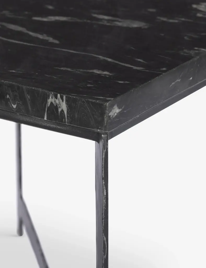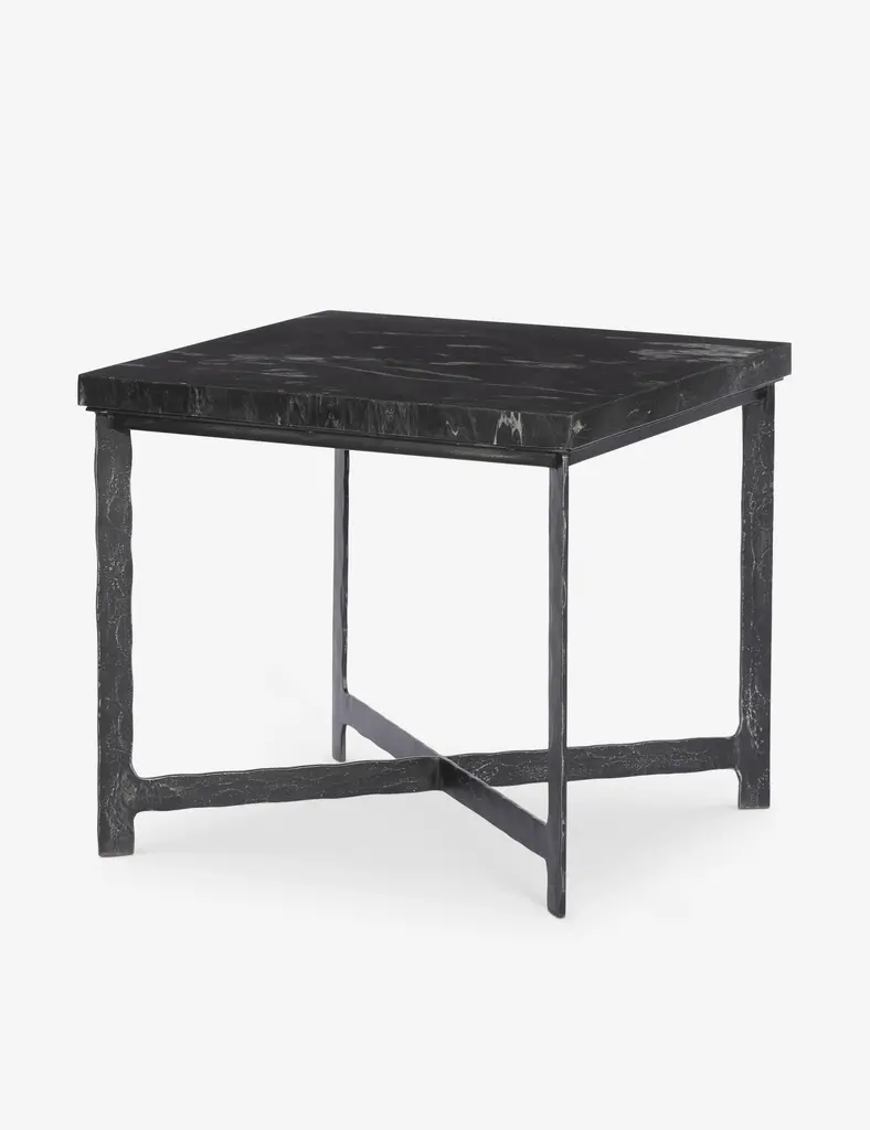 The Breslin side table offers a quintessential luxe industrial style. The hammered iron base is fitted with a crisp marble top for an attractive contrast that strikes sophistication in the room. We love this end table for a space that balances raw materials with refining touches.