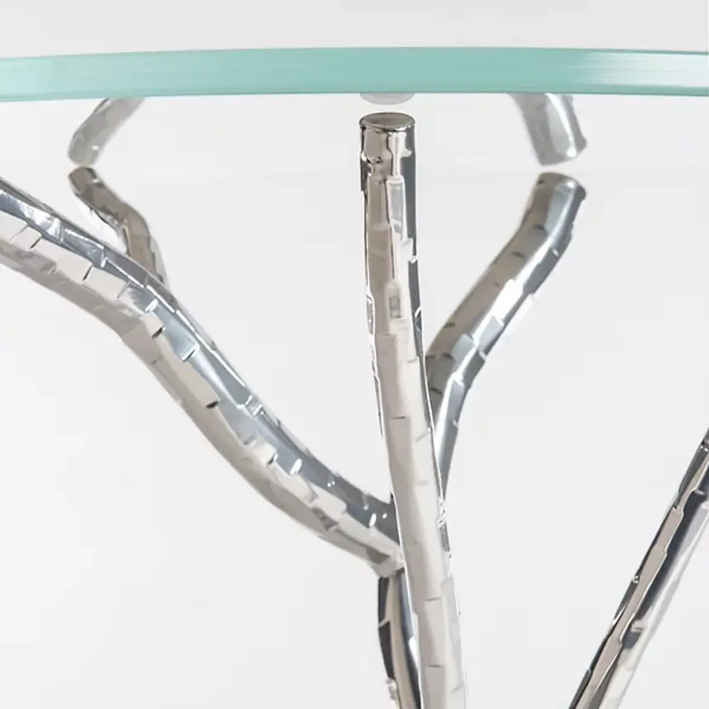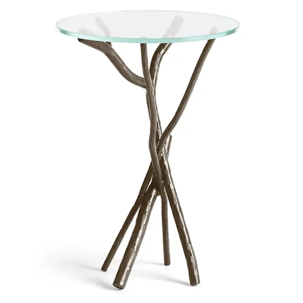 Art and functional design mimic nature in the handcrafted Brindille Accent Table from Hubbardton Forge. Like branches ascending towards the canopy of a tree, this table’s base arranges branching-aluminum supports with a sculptural quality. These dynamic forms evoke their natural subject matter through surface marks made using a hand-hammering technique. A clear tempered glass tabletop rests on top with an ultra-slim profile, giving one’s items a clean, elevated look. This balanced piece pairs beautifully next to a sofa or bed.