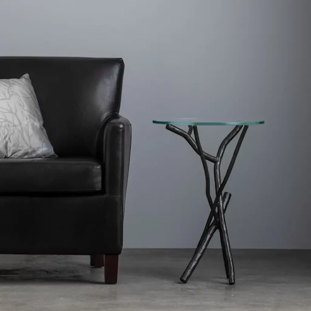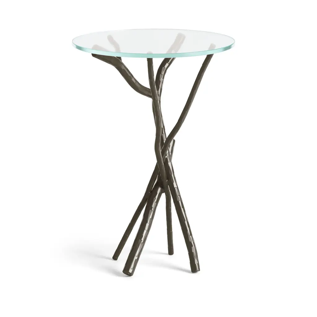 Art and functional design mimic nature in the handcrafted Brindille Accent Table from Hubbardton Forge. Like branches ascending towards the canopy of a tree, this table’s base arranges branching-aluminum supports with a sculptural quality. These dynamic forms evoke their natural subject matter through surface marks made using a hand-hammering technique. A clear tempered glass tabletop rests on top with an ultra-slim profile, giving one’s items a clean, elevated look. This balanced piece pairs beautifully next to a sofa or bed.
