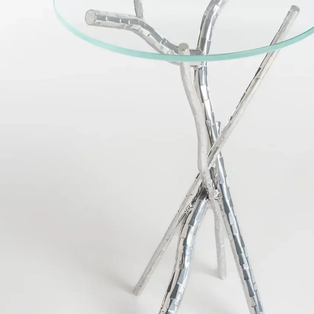 Art and functional design mimic nature in the handcrafted Brindille Accent Table from Hubbardton Forge. Like branches ascending towards the canopy of a tree, this table’s base arranges branching-aluminum supports with a sculptural quality. These dynamic forms evoke their natural subject matter through surface marks made using a hand-hammering technique. A clear tempered glass tabletop rests on top with an ultra-slim profile, giving one’s items a clean, elevated look. This balanced piece pairs beautifully next to a sofa or bed.