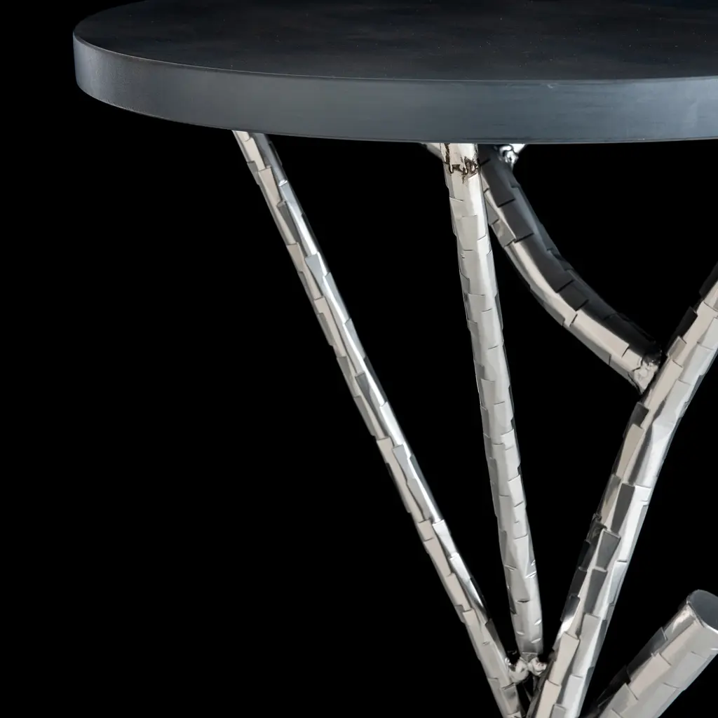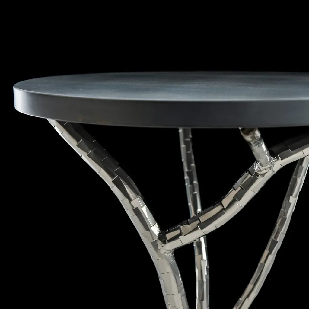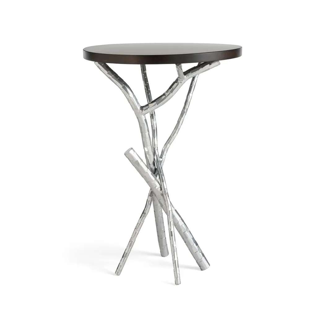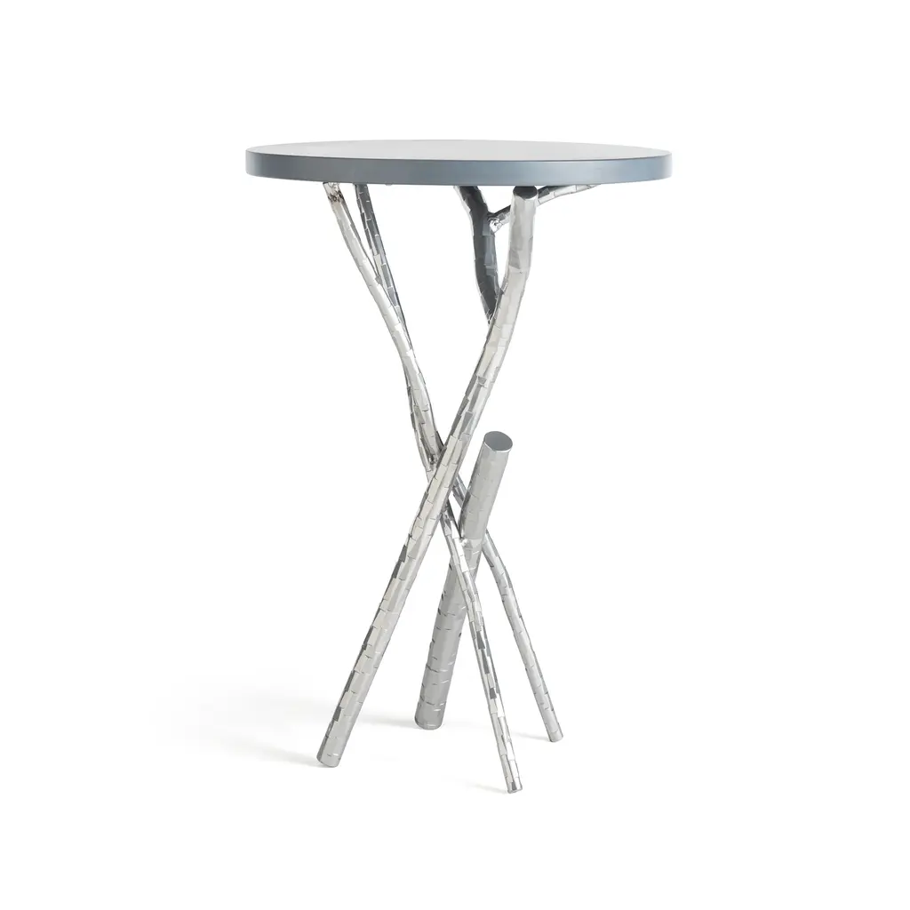 Like a serene walk through a grove of willowy birches, the Brindille Solid Top Accent Table evokes a feeling of calming tranquility in its every facet. An individually hand-hammered steel base creates visual interest from every angle. The solid Vermont maple wood top further showcases the fine detailing of the forged steel below to create a beautiful contrast in texture and color. Customize in your choice of options and enjoy the serenity that this handcrafted piece evokes at every glance.Shown in sterling finish with grey maple wood top accent