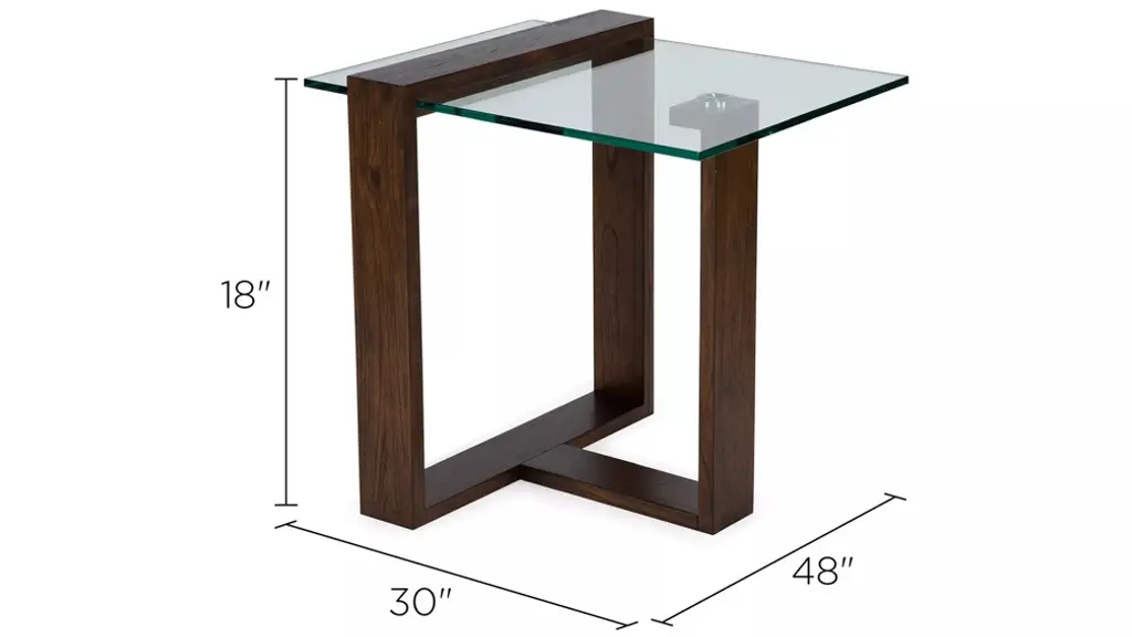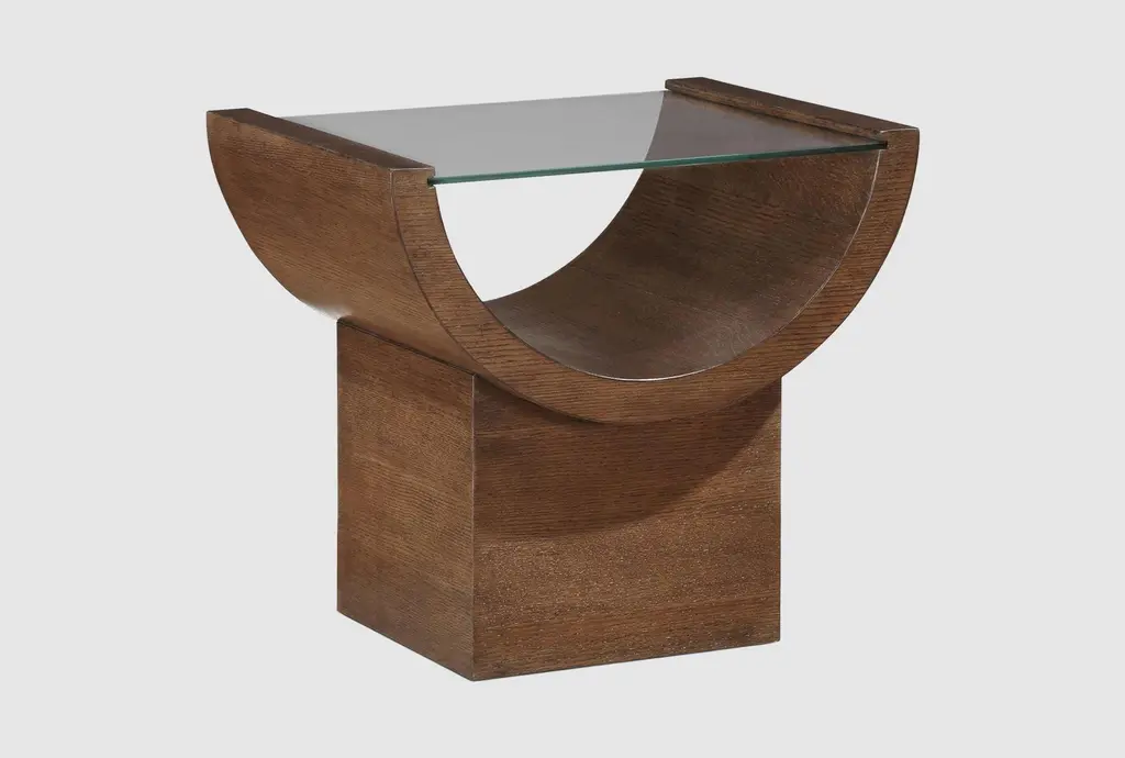 In a striking modern example of mixed materials, the Bristen rectangular end table creates chic sophistication. Smooth, sleek glass tops are supported by acorn finished mindi wood interlocking rectangles and are punctuated with chrome metal pucks. A chunky wood rectangle overlaps the top at one end as the other understated rectangle base rests underneath. The geometric appeal will delightfully complement contemporary living spaces.