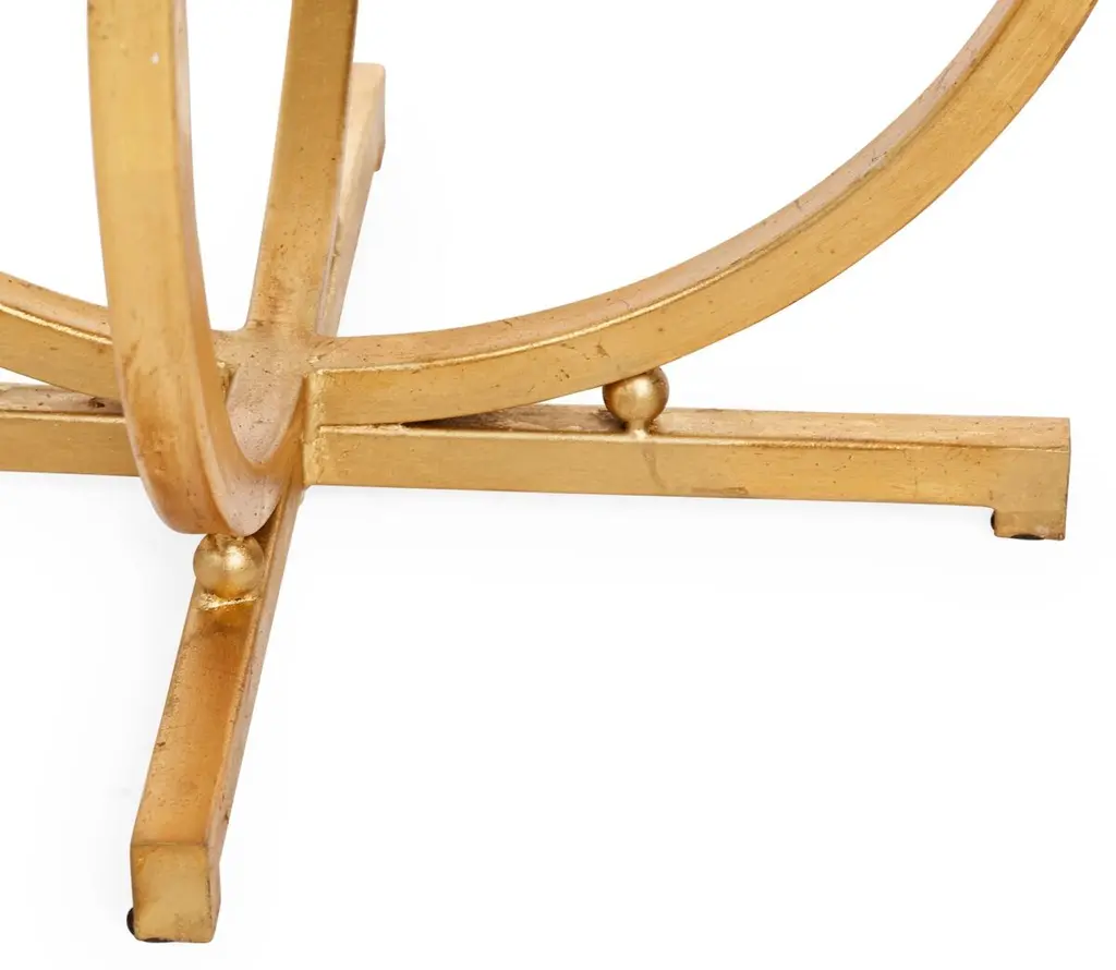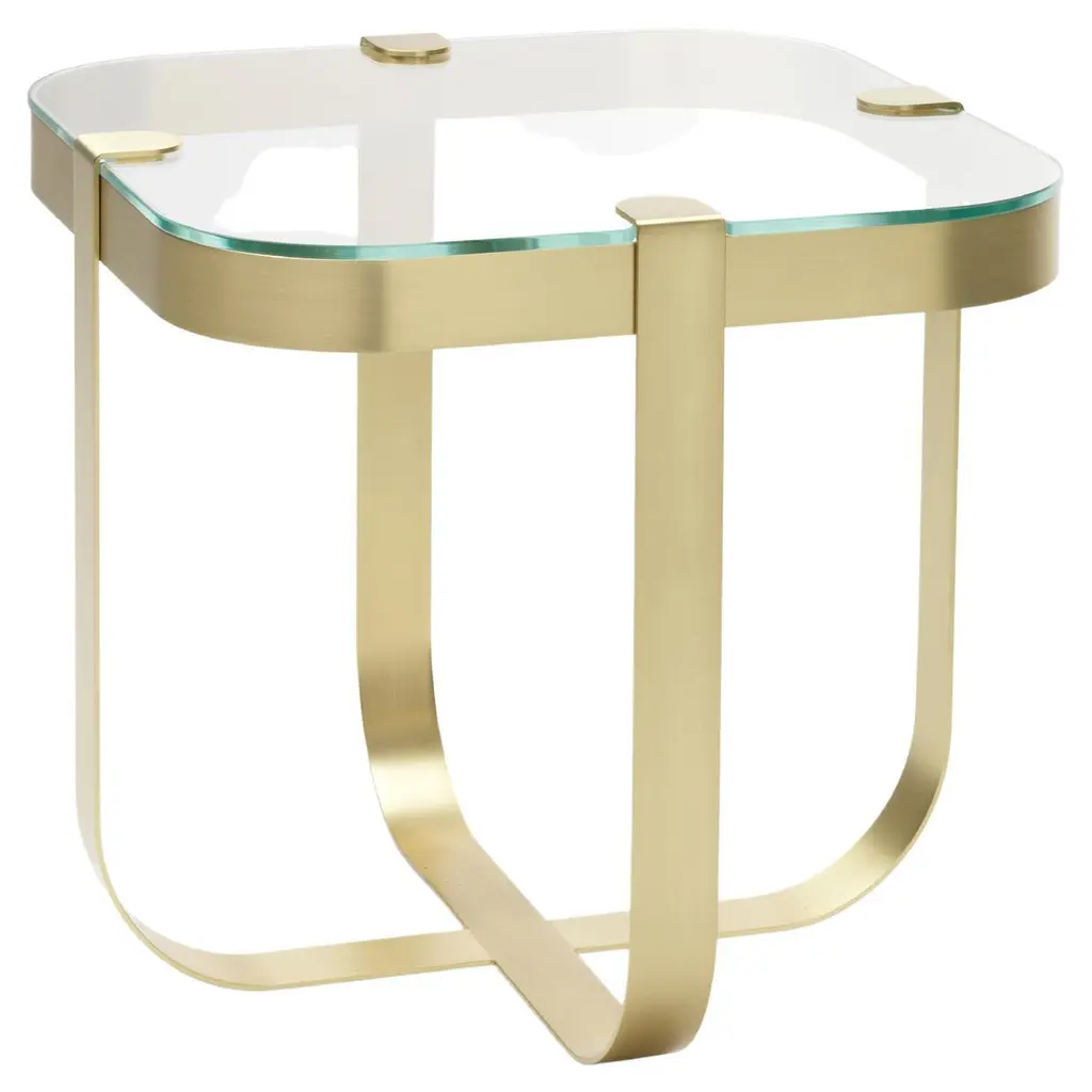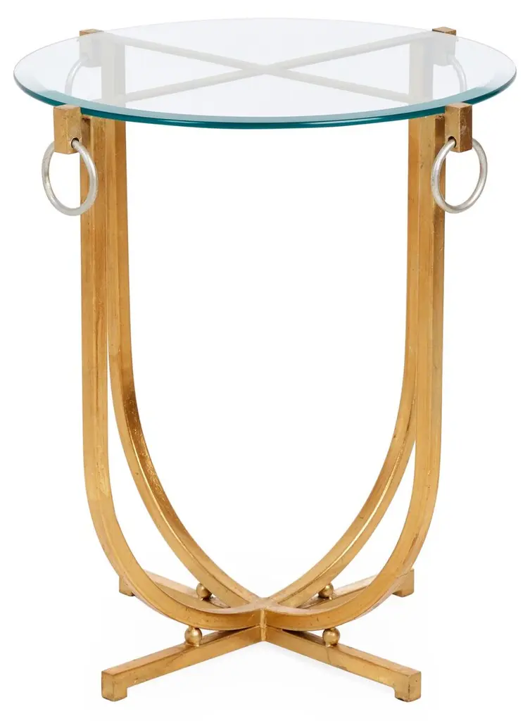 Designed with bowed iron framework, an X-shaped stretcher, and equestrian-inspired hardware, this golden side table adds impressive sense of depth and character alongside the sofa or bed. Topped with beveled glass.