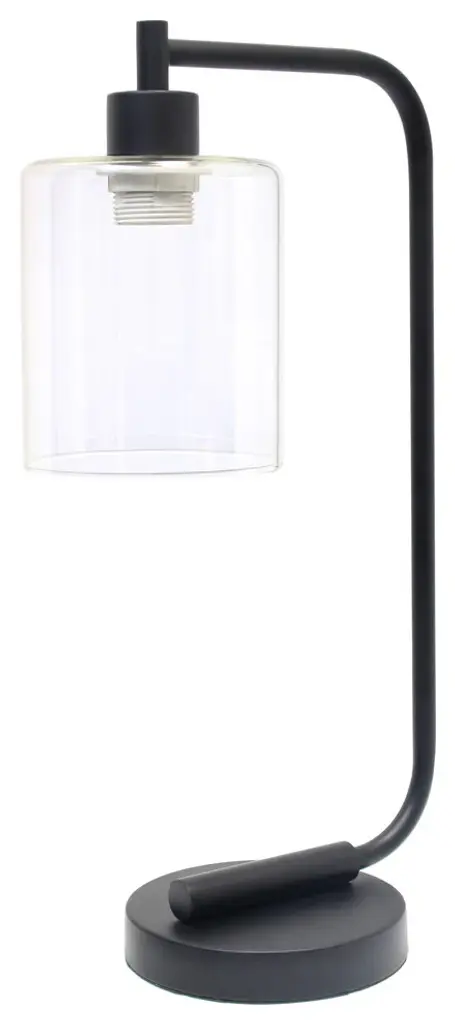 Simple Designs Bronson Antique Style Industrial Iron Lantern Desk Lamp with Glass Shade, Black.The sophistication of industrial accents gleams in this beautifully crafted iron desk lamp. The humble design combines a simple base with curved arm and a clear glass shade for the perfect ensemble. Place on a desk or bedside table for a modest, refined look in fashion lighting. HELPFUL TIP: To get the complete industrial look, we recommend using a decorative Edison/Vintage bulb (not included). Matte Black FinishClear Glass ShadeConvenient On/off cord switchLamp measures: L:9" x W:5" x H:19"ULBulb Type: IncandescentSwitch Type: On/offSwitch Location: CordShade Diameter: 5"Shade Bottom Opening: 5Shade Height/Slant: 5.75"Shade Security: Socket nutNumber of Lights: 1Maximum Wattage: 40WShade Material: GlassCord Color: BlackFinish/Color: BlackPrimary Material (Leather, Metal, Wood): MetalBase Type: E26 Medium BaseHeight from Base to Shade: 13"Bulb Included: NoWe don''t sale in California