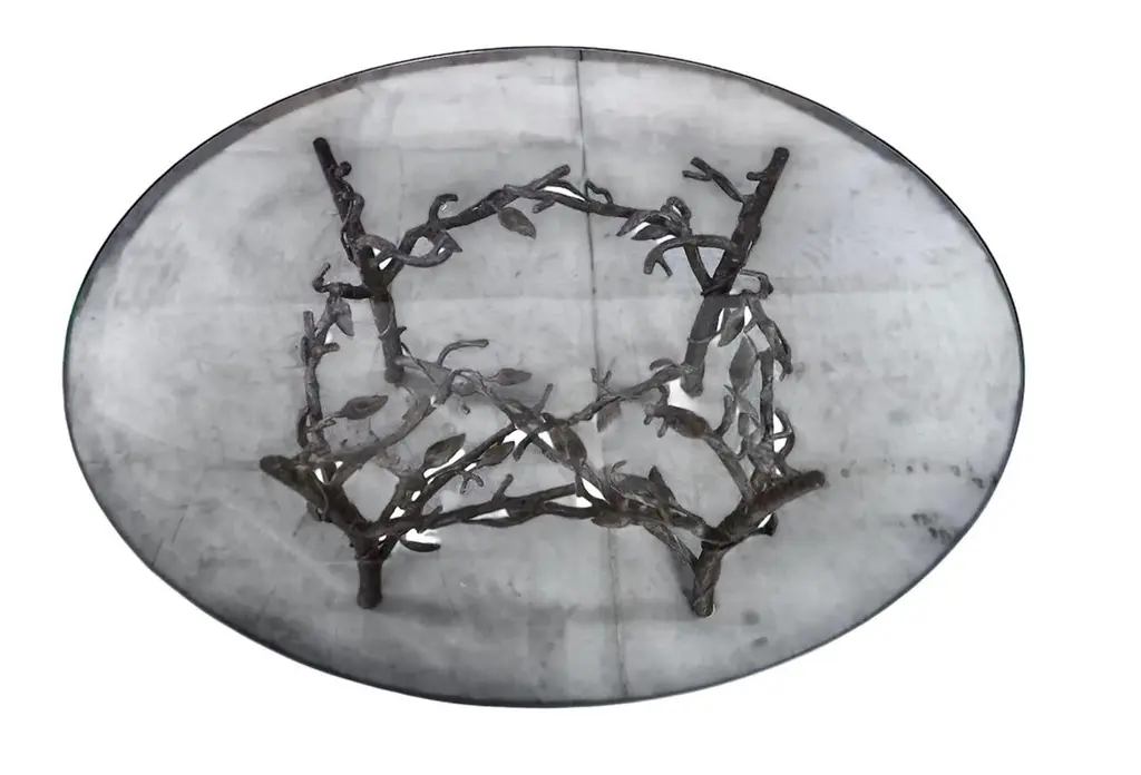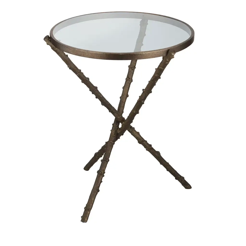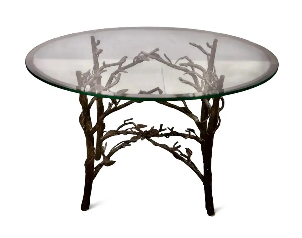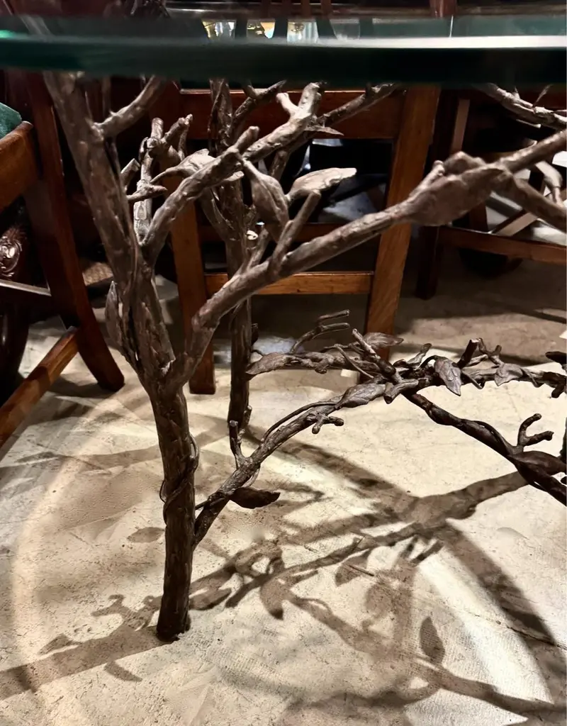 This is a stunning and exceptional Giacometti-Style cast bronze faux bois occasional table. The table is formed by 4 faux boise legs with intertwined branches united by a central faux bois stretcher. The high level of bronze casting as shown in the detailed bronze leaves and branches is indicative of the refinement of this gem of a table. The thick glass top has 1" bevel and is in overall good condition. This is a multipurpose table that would be a wonderful coffee table, games table or generous bedside table.
