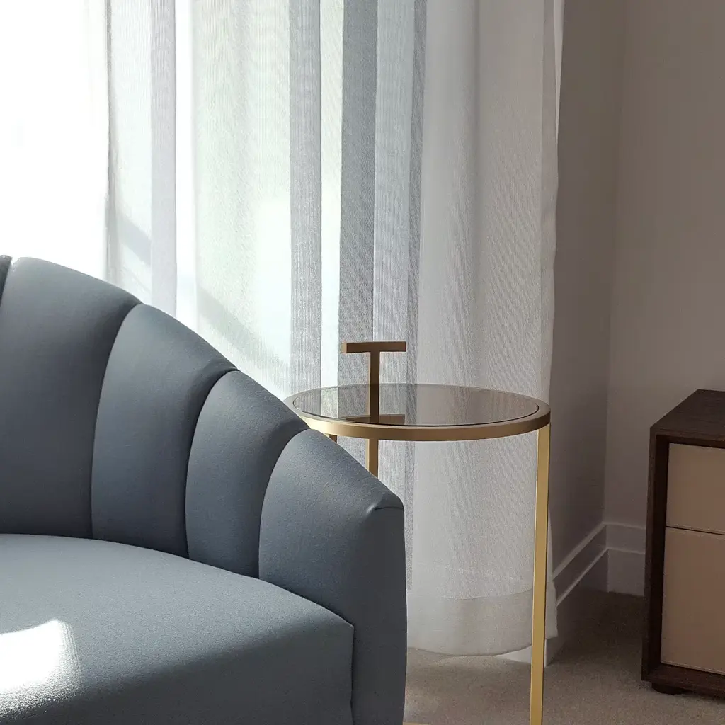 This round side table makes a sleek addition to the living room, boasting a circular brass base with a light brushed bronze finish. Characterized by pure lines and a geometric shapes, the design is finished with a bronze glass top. Exuding a modern elegance, the Bronze Round Side Table complements an array of decor styles.