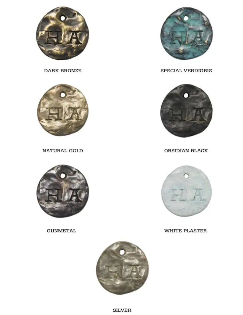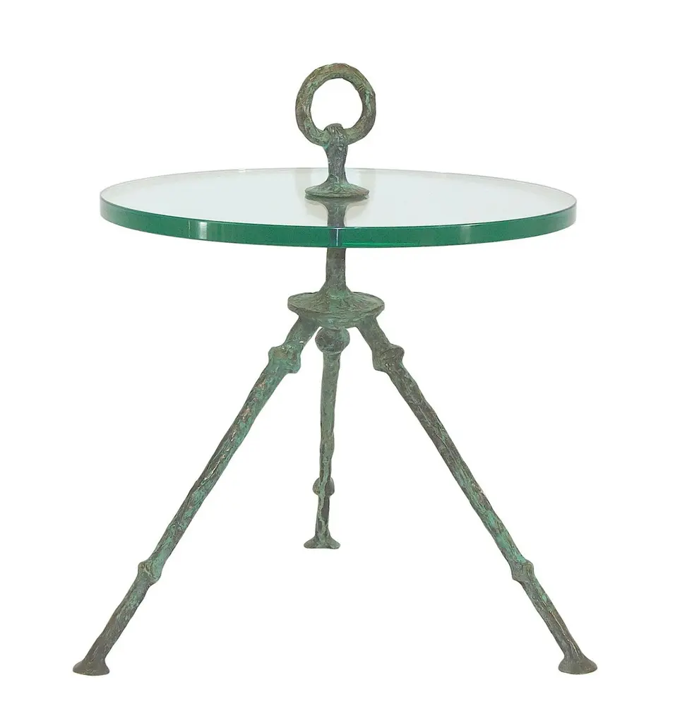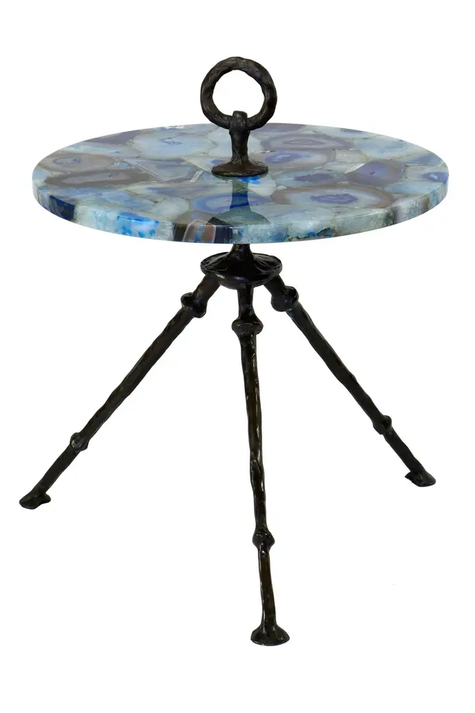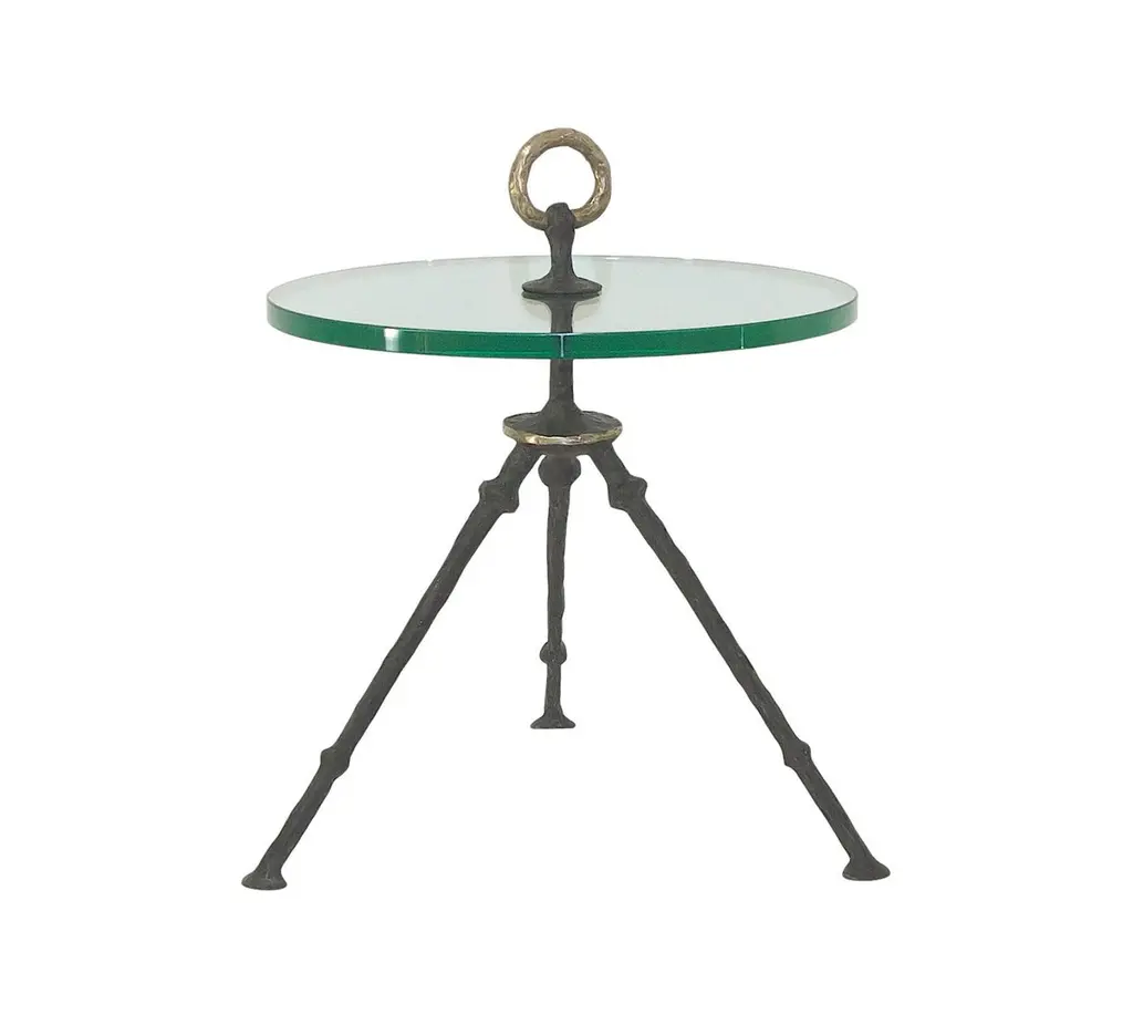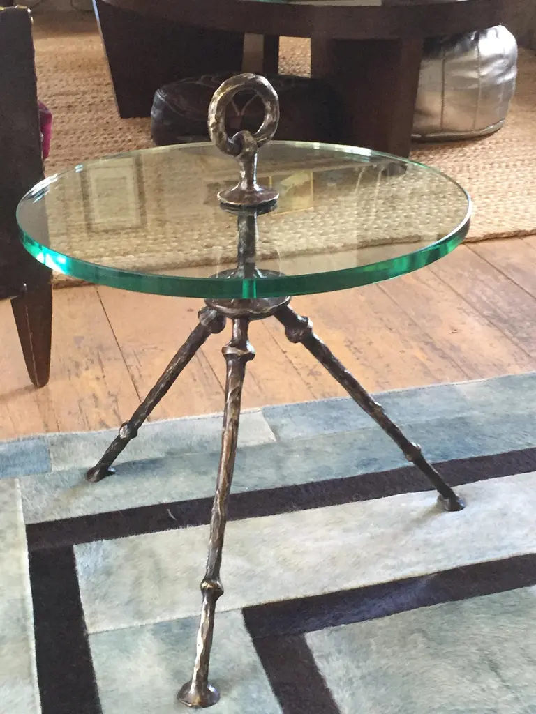 A hand-sculpted and forged tripod cocktail table with a circular glass or stone top, it is fastened with a solid bronze handle on top. Custom sizes, finishes and tops available.