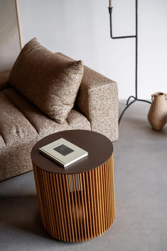The Brooks Side Table seamlessly combines refined craftsmanship with architectural elegance. Featuring a cylindrical silhouette wrapped in precisely spaced vertical oak slats, this piece offers a stunning interplay of light and shadow that brings dimension to any space. The meticulously hand-applied antique bronze patina finish crowns the circular top, creating a sophisticated contrast against the warm natural oak frame.Each wooden slat is perfectly aligned to create a rhythmic pattern that allows glimpses through the table's core, lending an airy quality despite its solid presence. The natural oak construction showcases the wood's beautiful grain and texture while providing exceptional durability.Handcrafted in Los Angeles, California by a small and dedicated team, this console is made to order to ensure that every piece we build meets the unique needs and preferences of the customerOAK + PATINATED STEELHARDWAX OIL FINISHCustomization: specializes in handmade, quality furniture to fit your space. Each piece is made to order in our downtown Los Angeles workroom which allows for a truly tailored experience. Personalization can include a change in size, orientation, design elements and much more. We offer a variety of leather and fabric options and welcome COM, COL and COH (for trade members only). The specific customization options available will depend on the product.For all furniture, protection from heat and moisture is crucial to the longevity of the piece. To help prevent scratches, use adhesive felt pads, coasters, placemats, and avoid sliding objects across the surface of the piece when possible.Lacquer + Paint + Metal Surfaces - Dry dust with a clean microfiber or feather duster. Wipe with a slightly damp microfiber towel and mild cleaner as needed. Wipe dry promptly.We recommend that you clean with ammonia-free Windex or a mild surface cleaner. Please stay away from bleach, alcohol, or petroleum based cleaners. You may use a general purpose wood cleaner.Avoid using furniture polish as over time it can accumulate and leave a residue.Wax + Oil Finish - Dry dust with a clean microfiber or feather duster. Wipe with a slightly damp microfiber towel. Wipe dry immediately. Clean with ammonia-free Windex or a mild surface cleaner. Stay away from bleach, alcohol, or petroleum based cleaners. Our natural wax and oil finishes will dull over time. Wax or teak oil may be reapplied as needed using a soft white cloth. Raw Wood - Dry dust with a clean microfiber or feather duster. Use a damp microfiber towel or soft brush as needed.Do not use any product containing wax or oil to clean.Outdoor Furniture - Outdoor furniture may require frequent oiling. A cover is strongly recommended for all outdoor furniture. Avoid prolonged exposure to moisture and/or direct sunlight.If exposed to rain, allow cushions to air dry completely before putting them back on the frame. Leather Care - Dry dust with a clean microfiber or feather duster. Wipe with a slightly damp microfiber towel. Do not use cleaning products on the leather. The recommended leather conditioner is Skidmore’s Original Leather Cream. Marble + Stone - Dry dust with a clean microfiber or feather duster. Wipe with a slightly damp microfiber towel. Wipe dry immediately. For daily cleaning we recommend using Orange Glo and/or Method Stone Cleaner on the marble. All marble and stone surfaces are protected with a sealer. To maintain the overall appearance and protection of the marble or stone, reseal with Miracle 511 Seal & Enhance. It is important to use coasters and clean up moisture immediately on marble and stone surfaces.