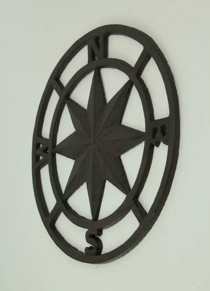 Versatile Dimensions - Embrace the captivating allure with a substantial 11.5-inch diameter and a slim .25-inch width, offering a bold statement piece for your indoor or outdoor design canvas.Crafted from Robust Cast Iron - This nautical compass rose emanates enduring charm. The sturdy cast iron construction ensures longevity, making it ideal for both indoor and outdoor adornment.Distinctive Brown Painted Finish - The carefully curated brown painted finish, enriched with a distressed look, imparts a weather-worn aesthetic, creating a timeless appeal that seamlessly blends with your decor.Arrange it Creatively - With its versatile design, this compass rose invites creative display options. Showcase it inside your home, poolside, on a charming garden fence, or gracing a patio wall.Nautical Flair - Infuse your living space with maritime elegance. This artful piece not only brings coastal charm but also radiates a distinct nautical ambiance, offering a unique touch to any home decor setting.Explore new design horizons with our 11.5-inch compass rose wall sculpture, a versatile masterpiece suitable for both indoor and outdoor settings. Regardless of your decor preferences, this piece brings a touch of timeless elegance to any space. Crafted from robust cast iron, this compass rose combines durability with distinctive style. The distressed brown finish adds a weathered charm, making it a standout addition to your home, garden, or patio. Hang it on your garden fence, poolside, or patio wall for a touch of nautical charm. Embrace creativity by letting it lean against a wall shelf or side table indoors. Use it to elevate your yard landscape or enhance your kitchen decor"”the possibilities are as vast as the seas. While our compass rose won''t guide ships, its original design pays homage to the winds that guided sailors. Let this piece navigate interest and admiration your way, whether it graces your house or outdoor living space. Transform your surroundings with the allure of nautical heritage, embracing the charm and versatility of this stylish compass rose.