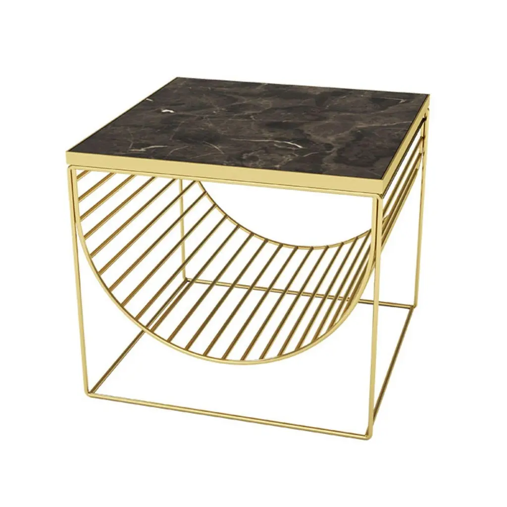 Black marble and gold steel side tableDimensions: L 50 x W 50 x H 44.3 cmMaterials: Marble, steelThis series consists of three different designs that you can combine in many different ways. The table tops come in two different colored luxurious marble and have two different colored base frames. This makes them highly versatile as they can fit in any room and there are endless combination possibilities.The tables can stand alone as side or coffee tables, as well as night stands up against the wall. Combine with one or two more, and you have the perfect sofa table, where you can have room for magazines. The materials are timeless and yet iconic and the tables will make sure to turn heads where ever you place them.