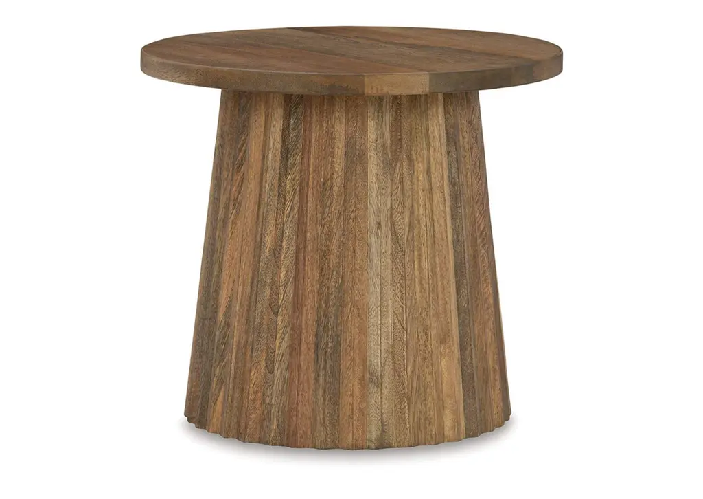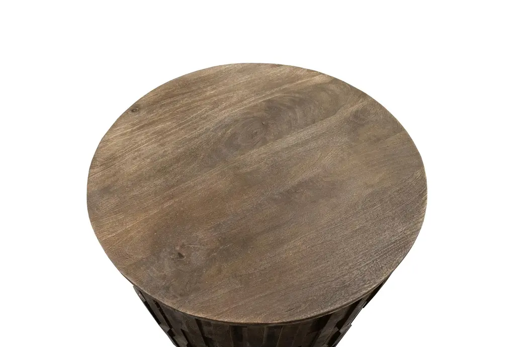Enhance your living space with the Brown Wood 24" Drum End Table, a perfect blend of modern and contemporary styles. Crafted from solid mango wood, this round end table in a Wildwood finish adds a touch of natural elegance to any room. This design also serves as the perfect bedside table.
