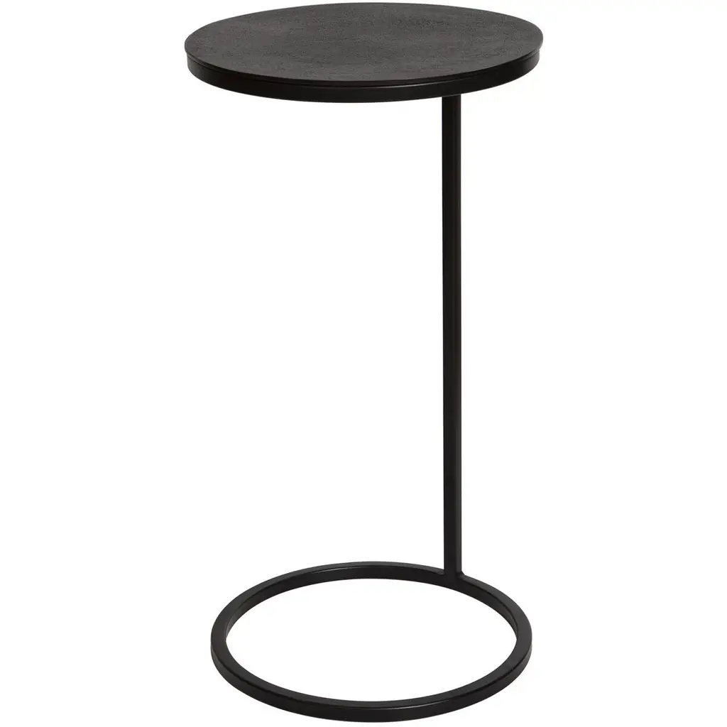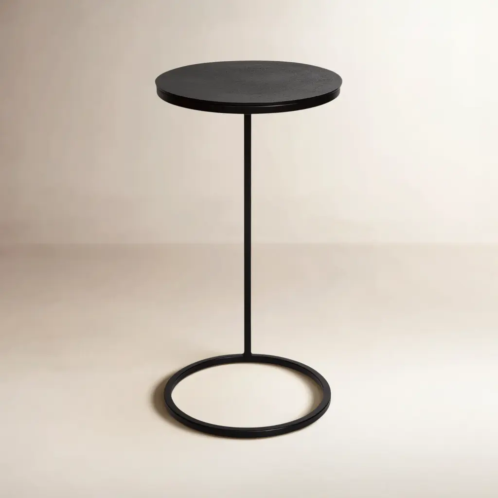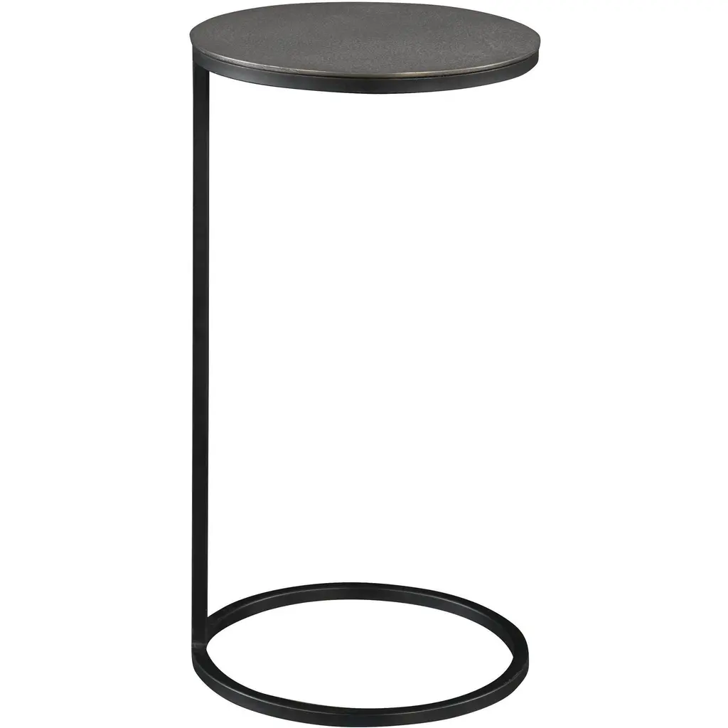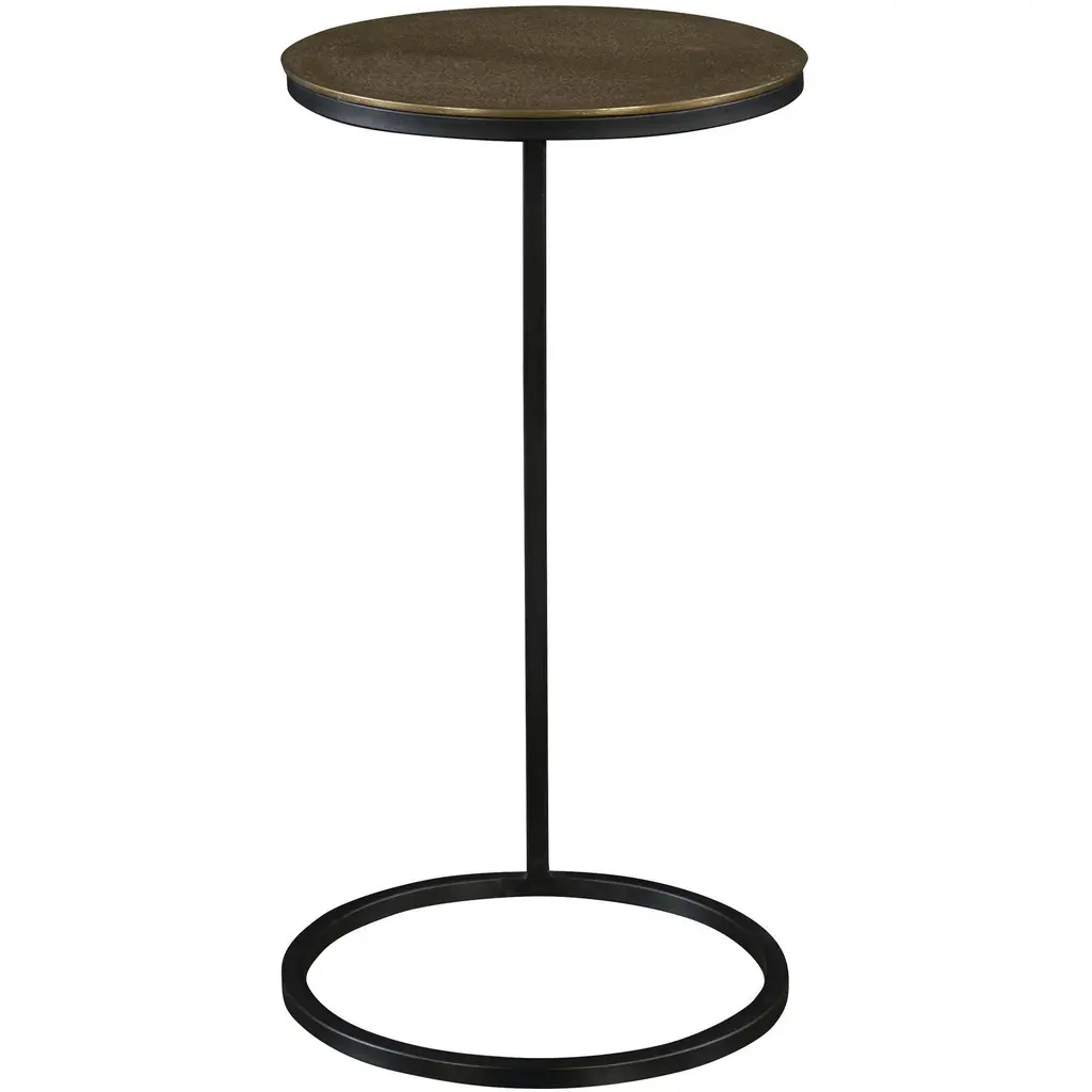 Modern And Streamlined, This Round Accent Table Is Constructed In An Aged Black Iron Featuring A Cast Textured Aluminum Slab Top Finished In A Plated Antique Gold.