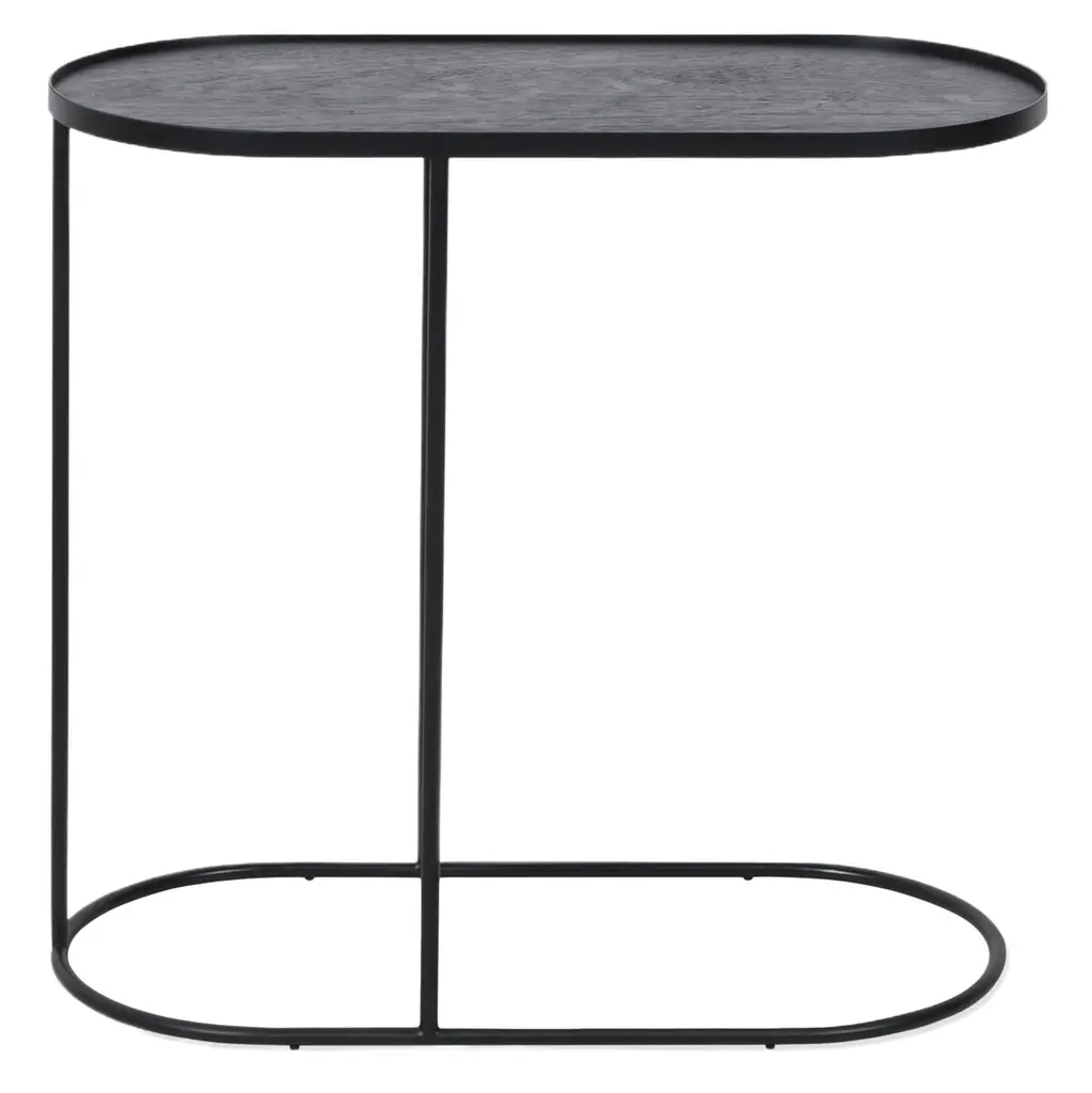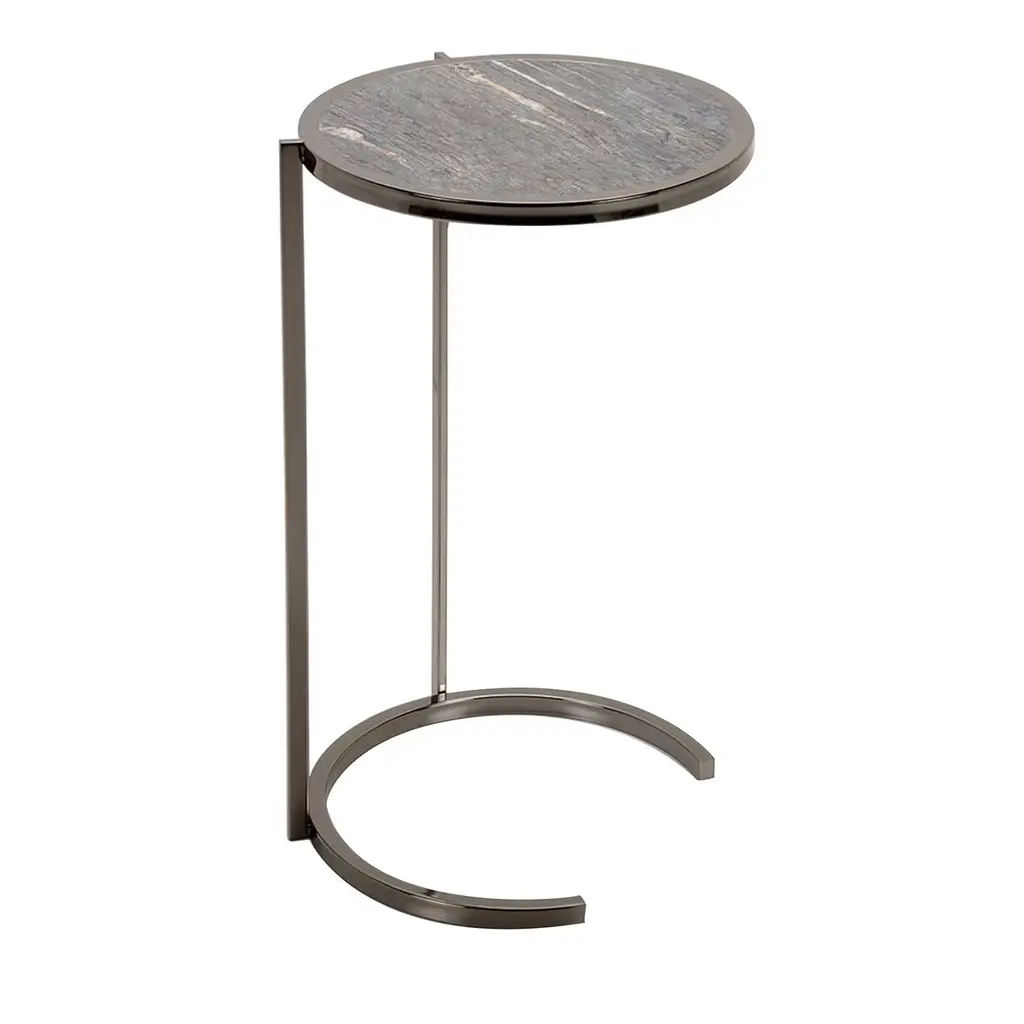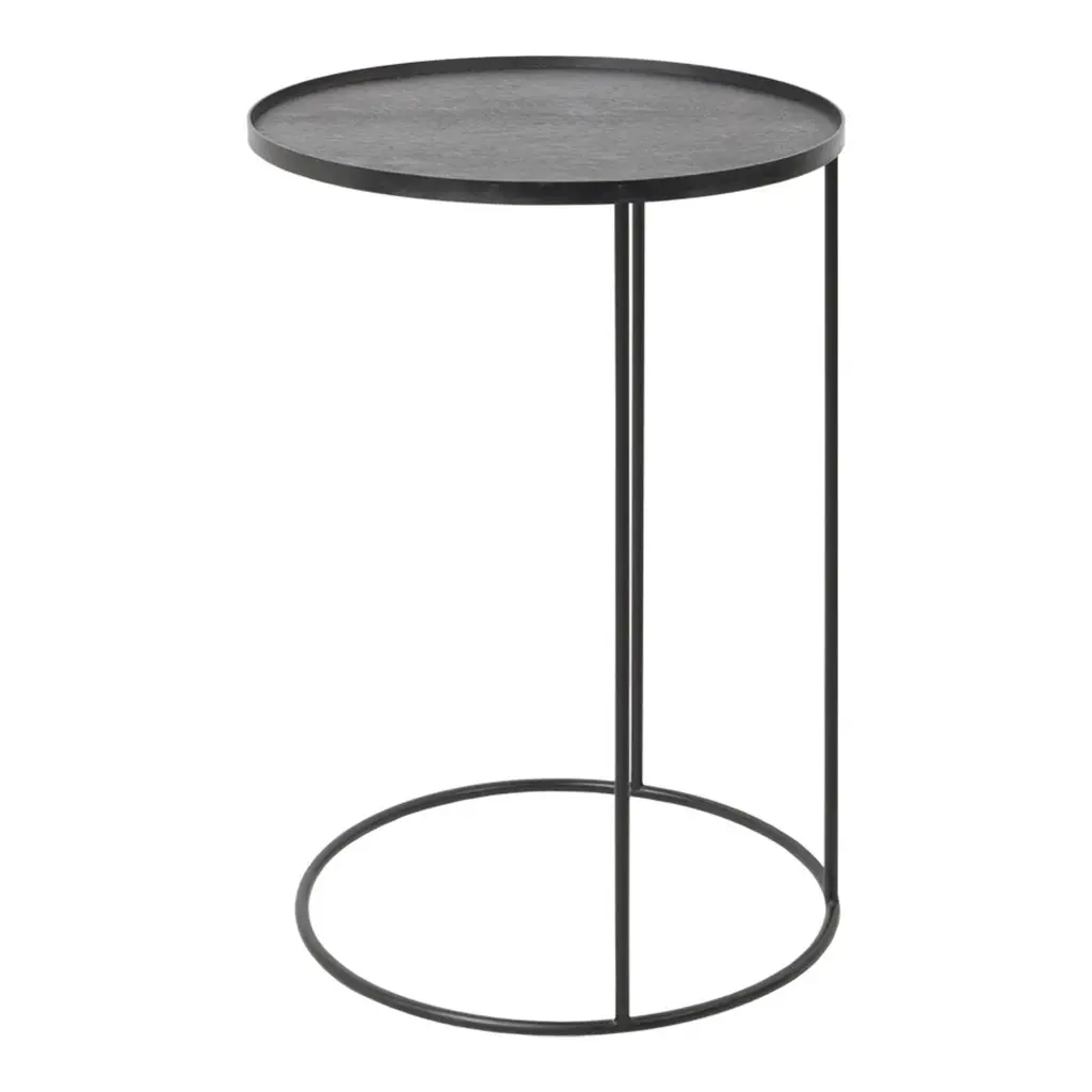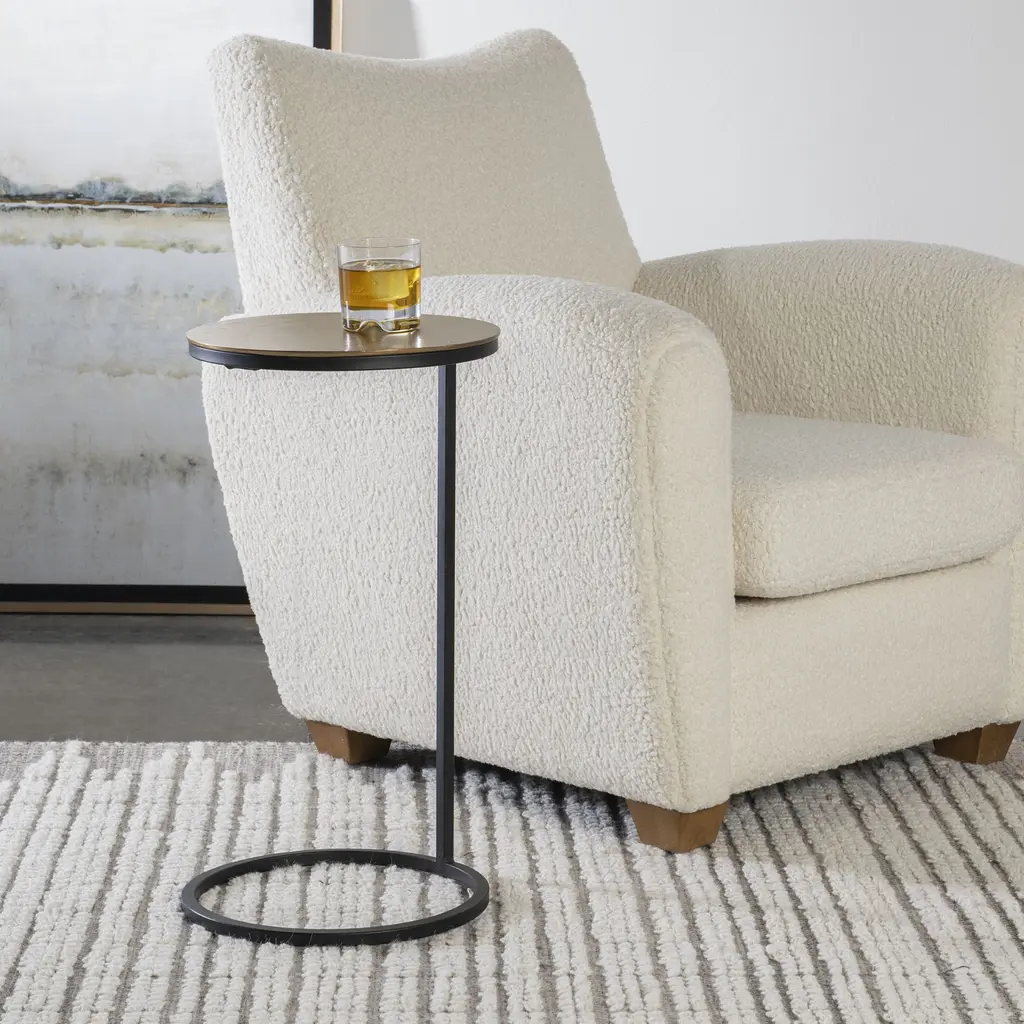 Modern And Streamlined, This Round Accent Table Is Constructed In An Aged Black Iron Featuring A Cast Textured Aluminum Slab Top Finished In A Plated Antique Gold.