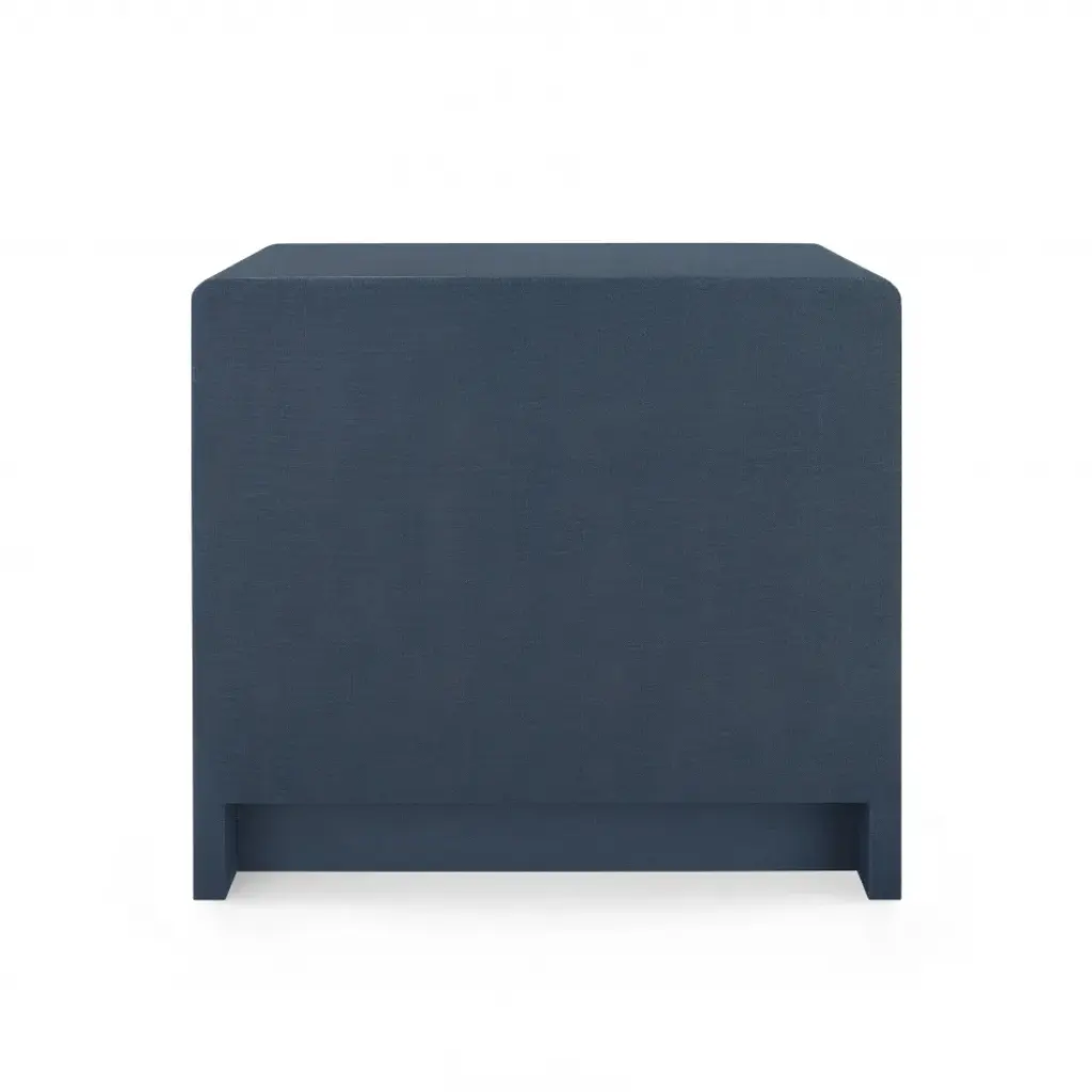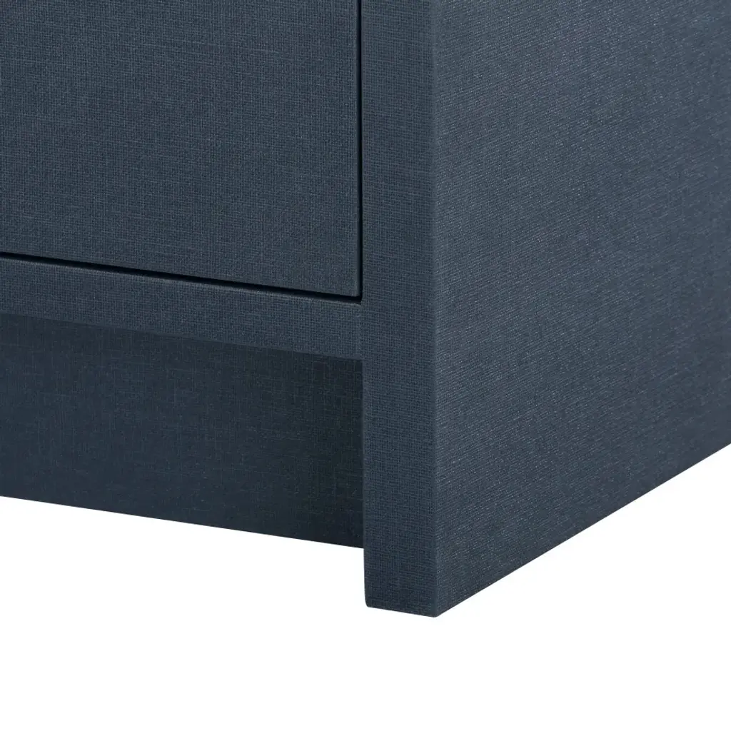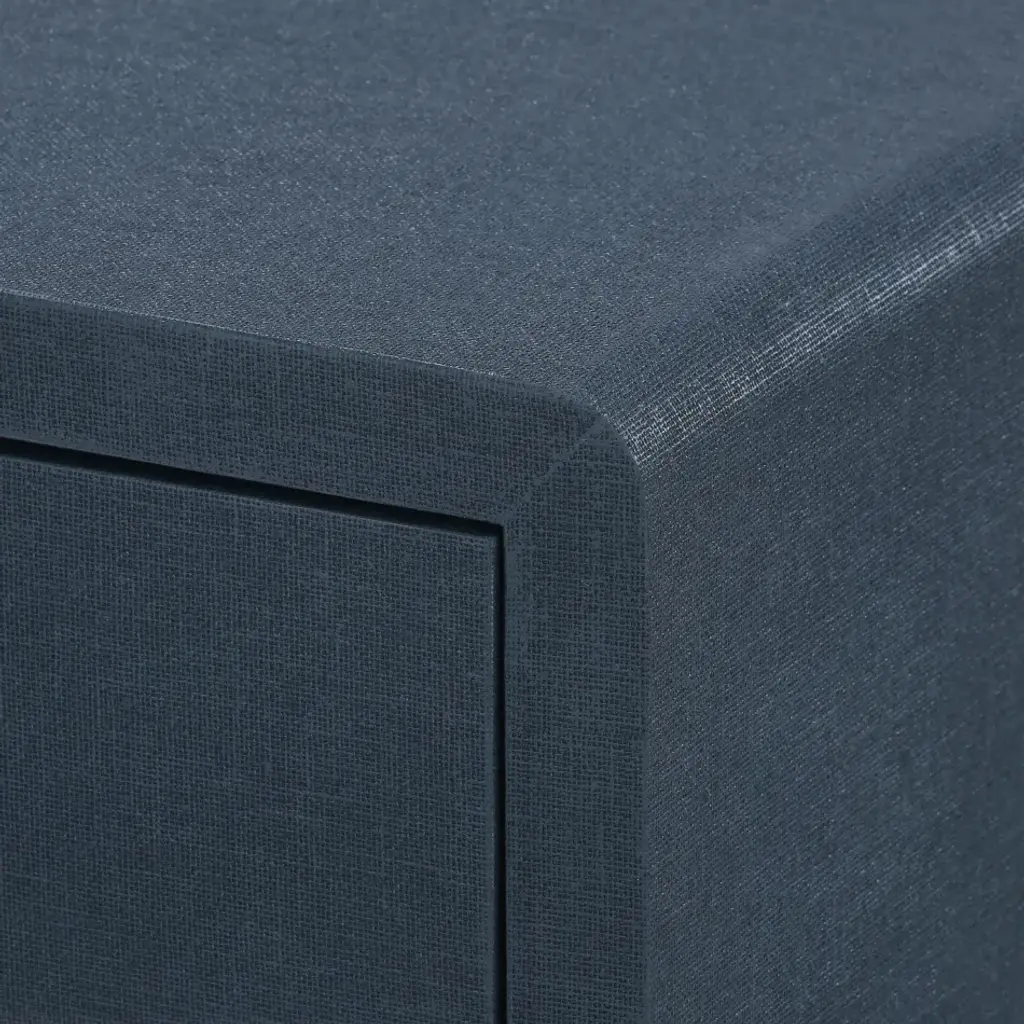 Quiet sophistication is found in the soft curves and classic silhouette of our Bryant Collection. Nevertheless, the Bryant Side Table is full of little details which set it apart. Three drawers seamlessly stack together atop an inset base, producing a subtle play on form, while antique brass accents evoke a tasteful sense of luxury. The piece is executed in lacquered linen with a navy blue, slightly textured finish, making it a rich and uniquely versatile piece fit for almost any decor scheme. Whether standing solo or paired on each side of a bed, the Bryant completes a room with ease.