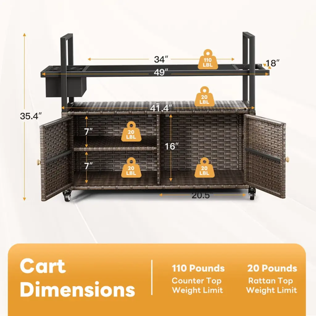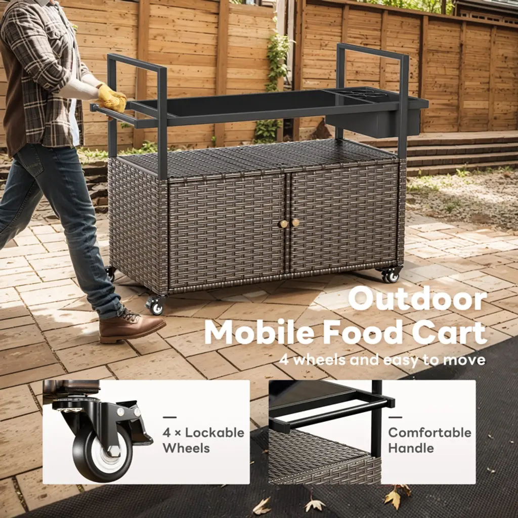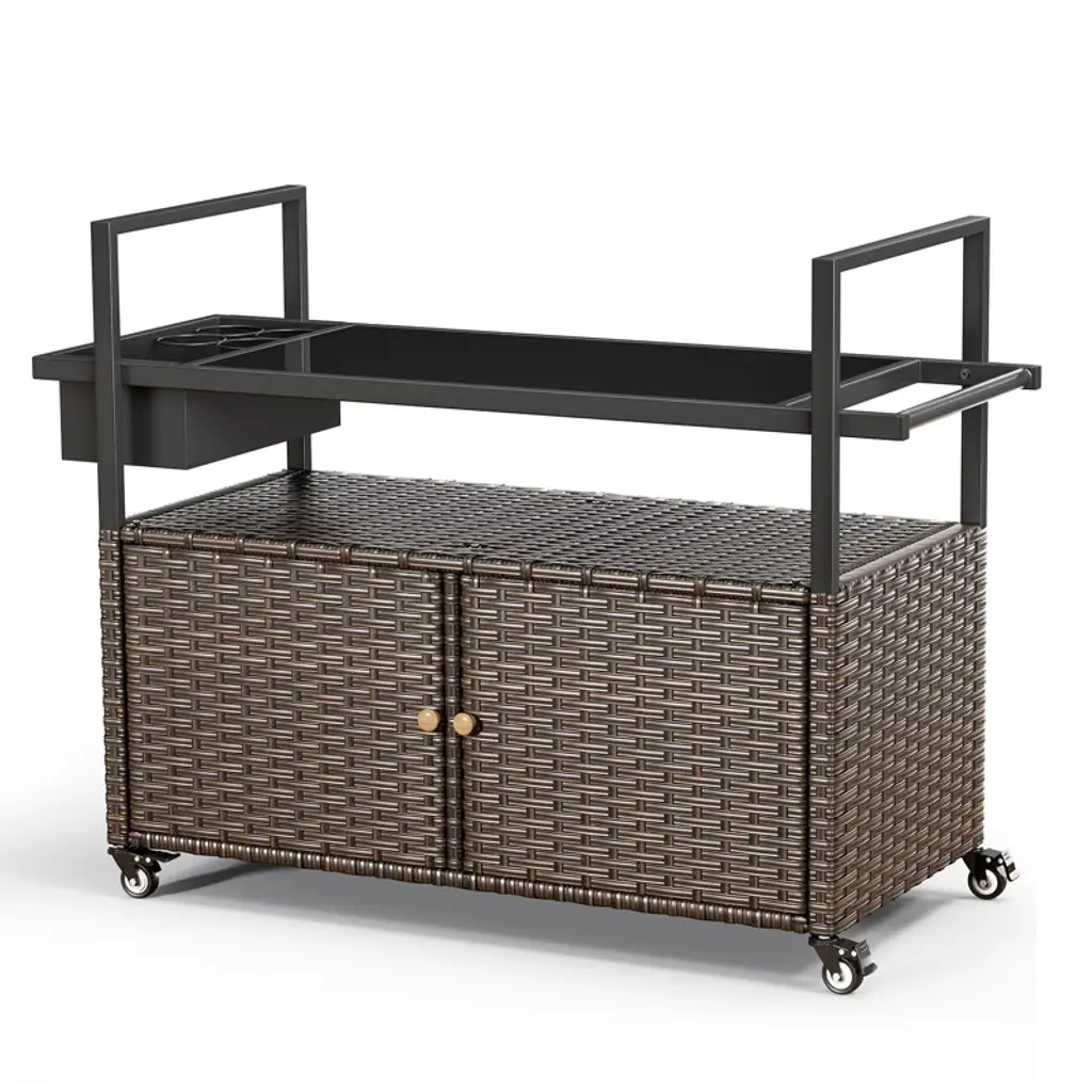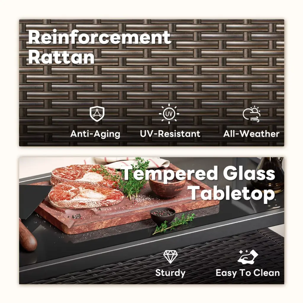Elevate your outdoor entertaining with the Buenhomino Outdoor Kitchen Island. This versatile cart combines a sleek, tempered glass top with a spacious, lockable wicker storage cabinet. Featuring four locking wheels and a convenient side basket, it¡¯s the perfect mobile solution for your patio, poolside, or backyard BBQ, blending elegant design with all-weather durability.