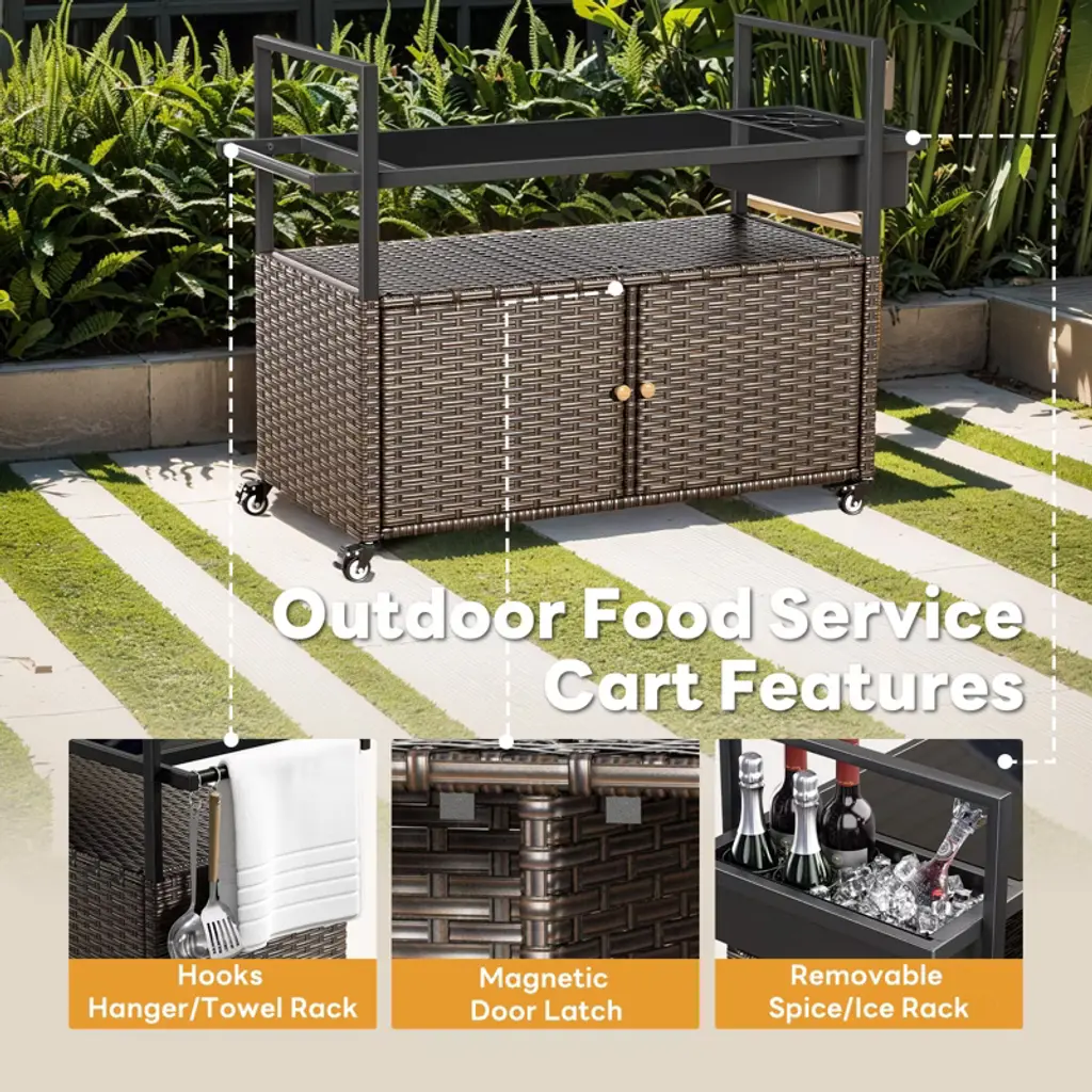 Buenhomino Patio Bar Table,outdoor Kitchen Island With Glass Top,rattan Patio Storage Cabinet With Wheels,bar Cart For Poolside And Backyard,brown