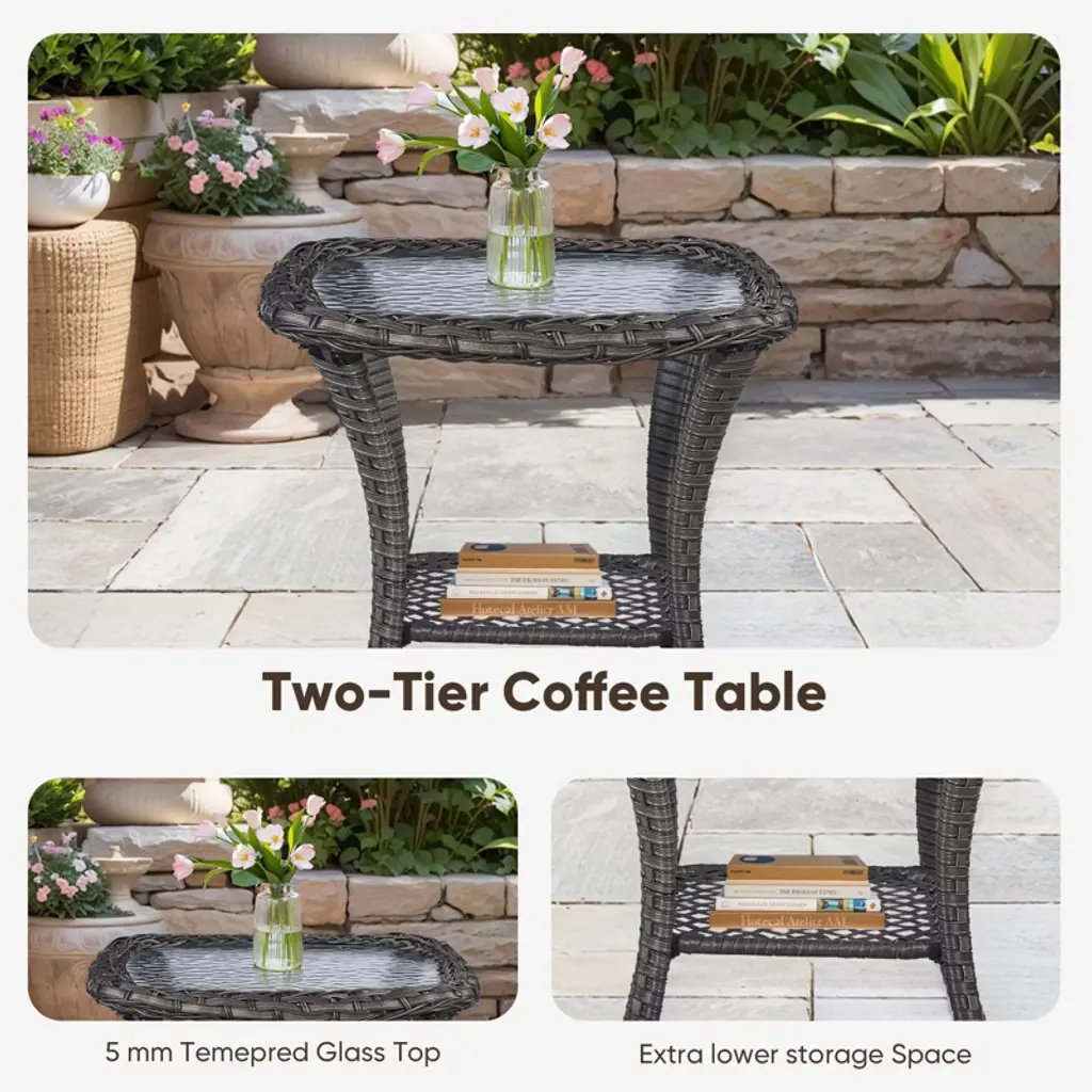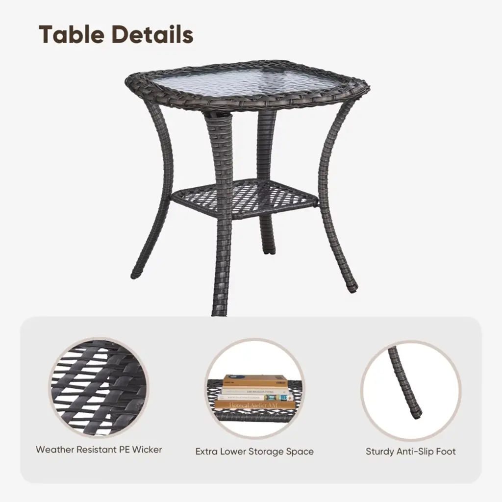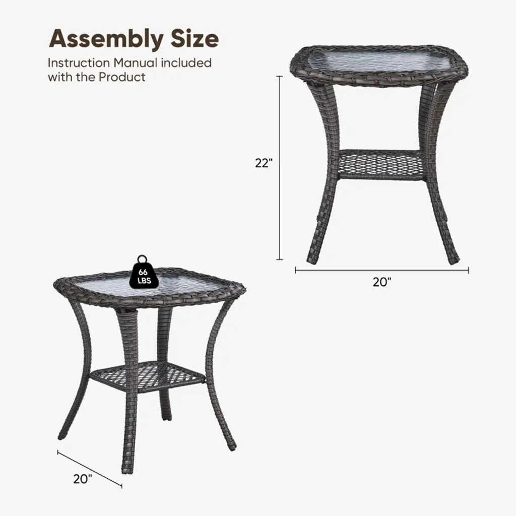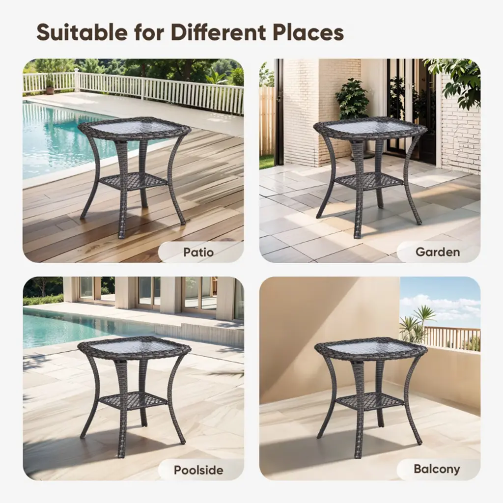 Upgrade your outdoor space with the Buenhomino Wicker Patio Side Table! This stylish outdoor side table features a handwoven rattan design, tempered glass top, and a lower storage shelf for added functionality. Built with a rust-proof steel frame and all-weather wicker, it's perfect for patios, decks, or even indoor use. Easy to assemble and designed to last!