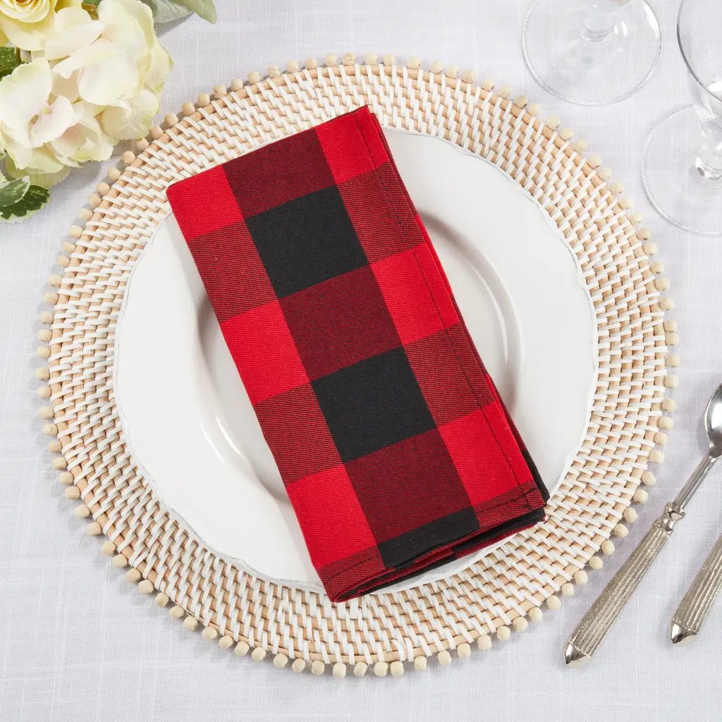 Create a decorative and charming table setup with this lovely set of Buffalo Plaid Napkins. Made with cotton blend, these rustic cloth table napkins bring texture and warmth to the table. They’re easy to pair with both solid colors and plaid patterns, and help you create a cozy, cabin look in no time.
