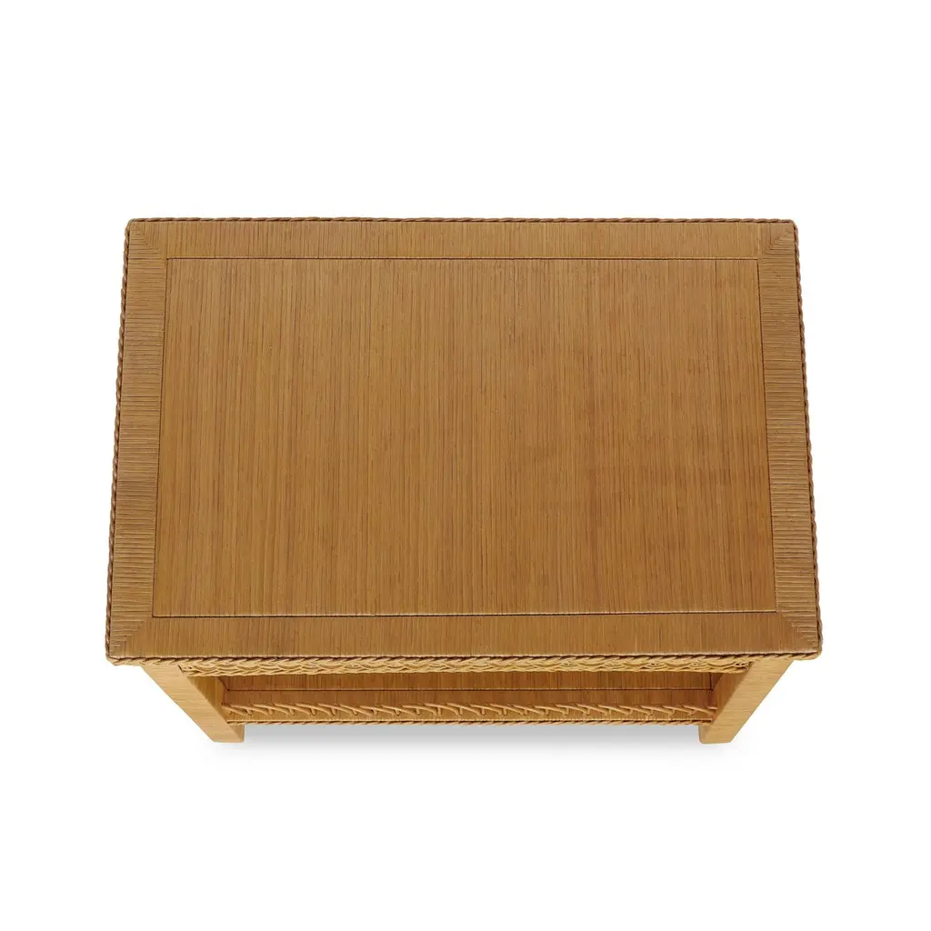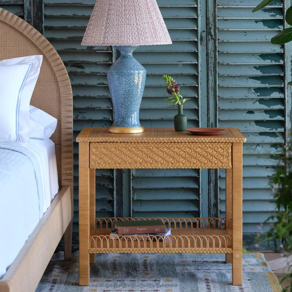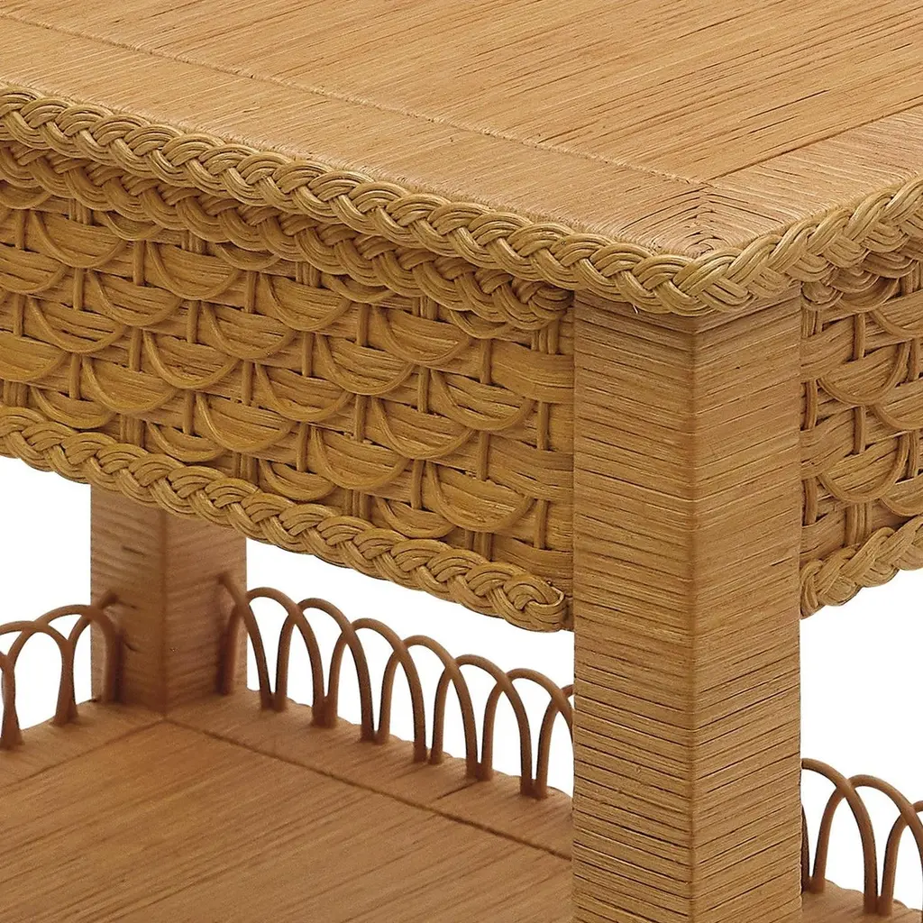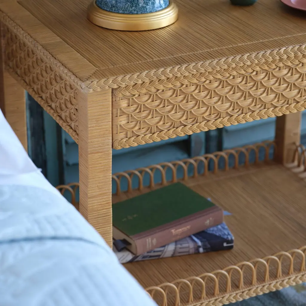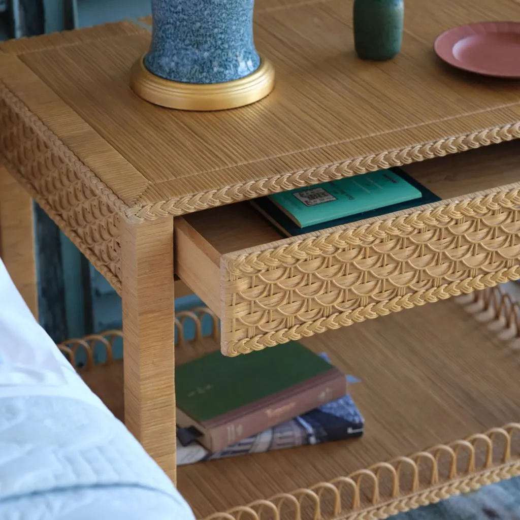 The Barbados Side Table highlights the artistry of wickerwork with a mix of intricate weaving techniques. Wrapped legs create a clean silhouette, while braided edges frame both the top and lower shelf. A fish-scale pattern adds texture to the upper box, and an apron of petite arches lends charm to the lower shelf. A discreet finger-pull drawer offers hidden storage. Inspired by a late 19th-century Victorian sewing table, it’s a timeless addition to any space.