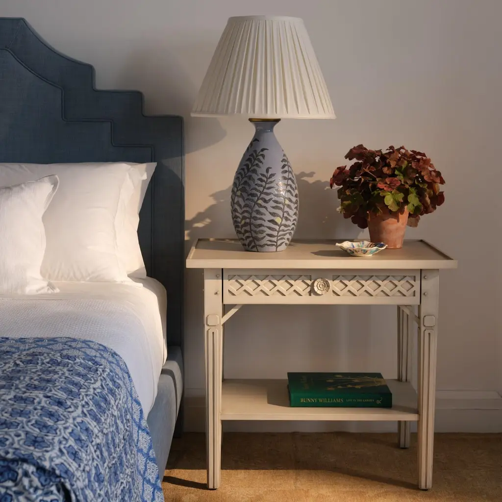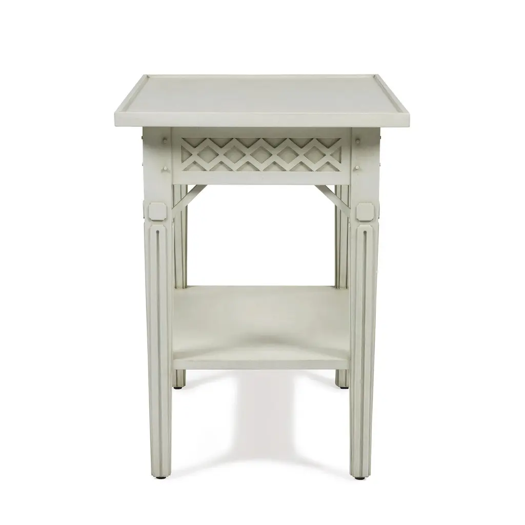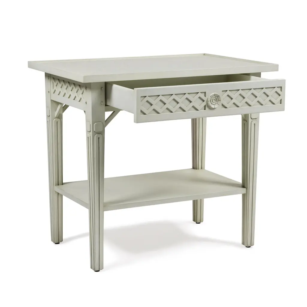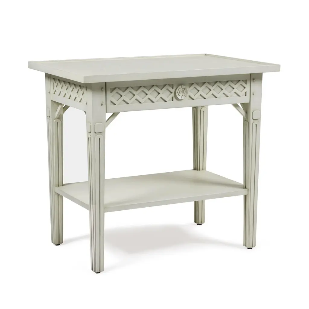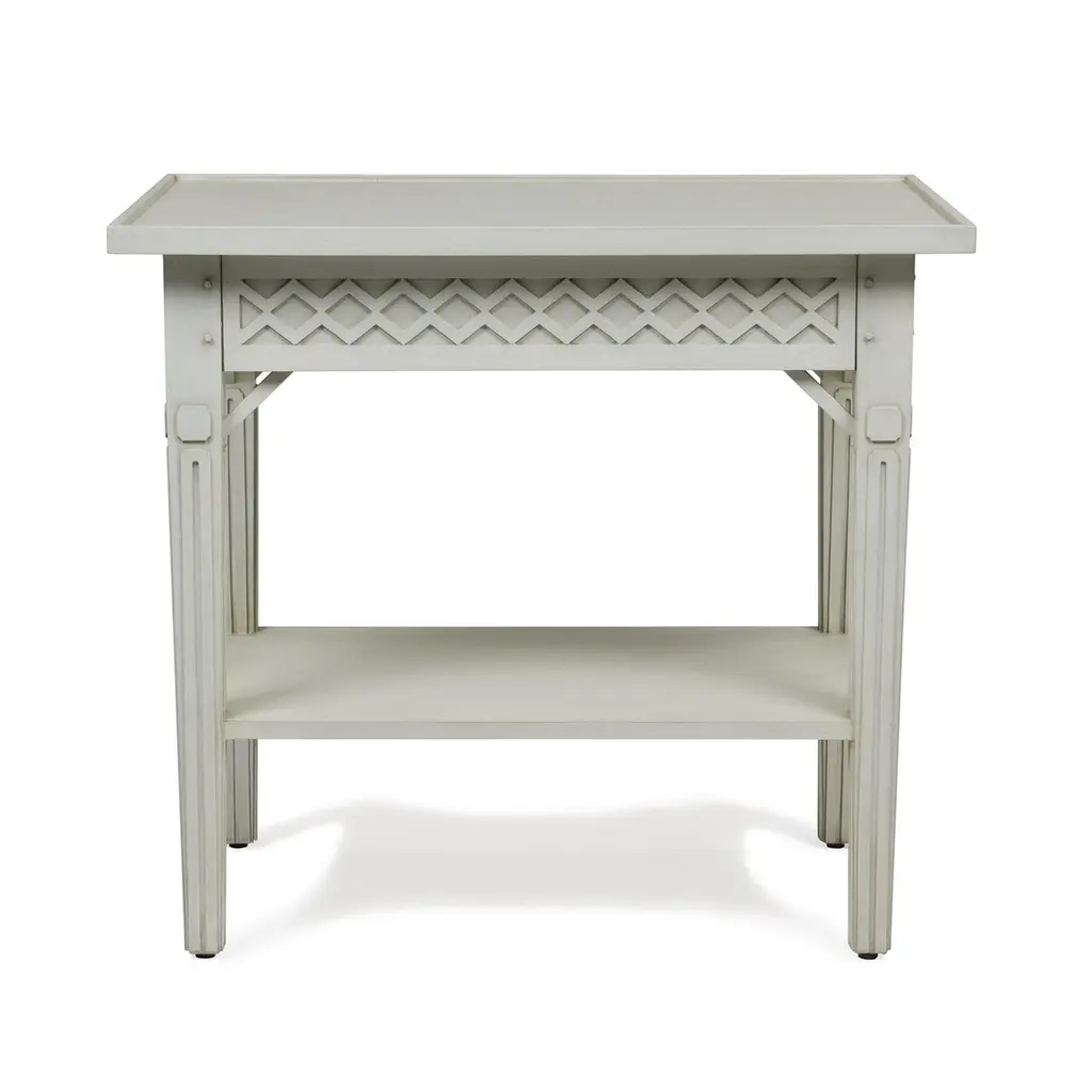 This delightful table features a rustic and beautifully hand-painted Swedish White / Gray finish. The classic relief diamond pattern on the apron houses a single concealed drawer perfect for storing a book or reading glasses. Try a pair in your breezy guest bedroom.